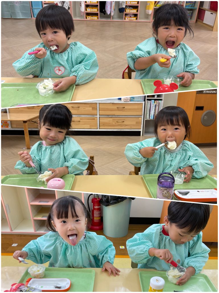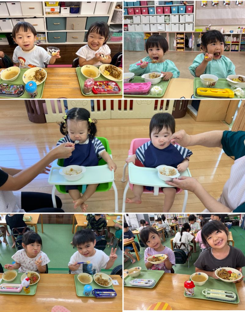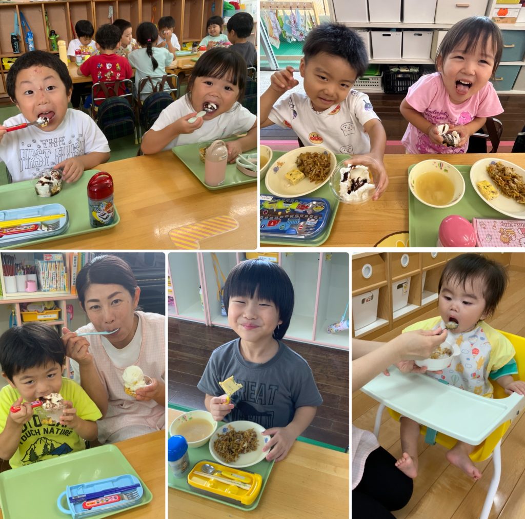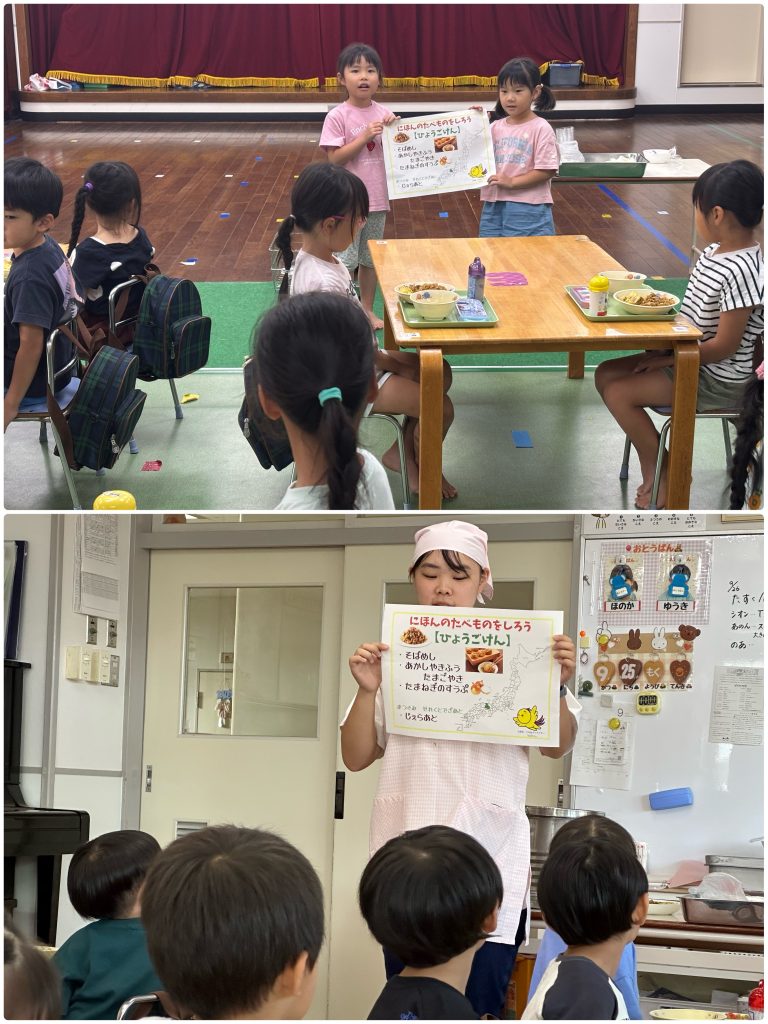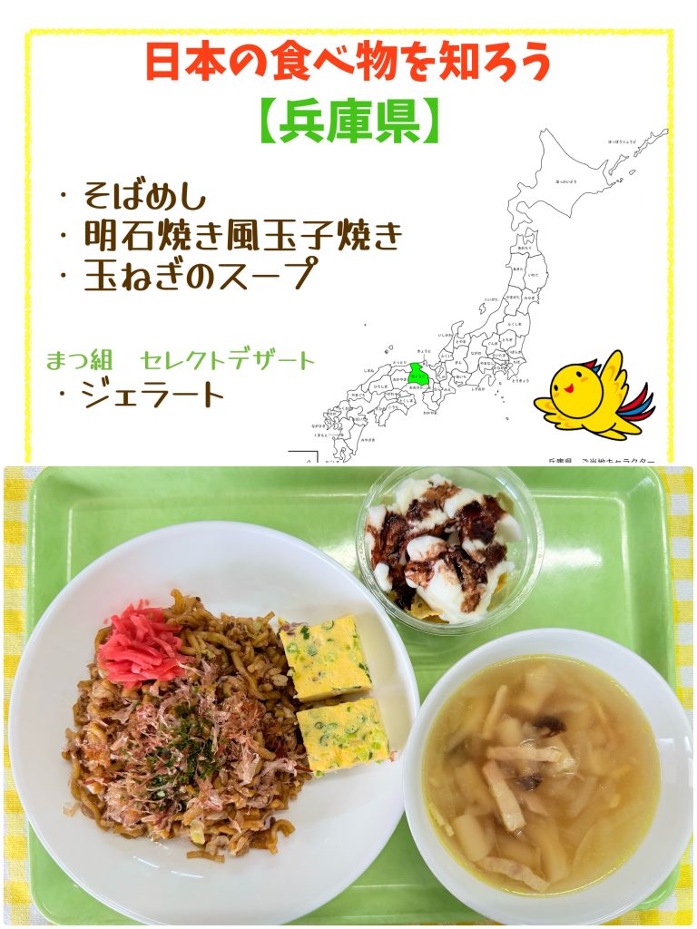 金曜日は日本の食べ物を知ろうで兵庫県の食べ物です。「そば飯・明石焼き風卵焼き・玉ねぎのスープ」デザートはジェラートです。そば飯は焼きそばとご飯がソース味で絡まっています。卵焼きには小さく刻んだタコが明石焼き風出汁の味で意外と美味い👍大阪育ちの園長先生一押しです。ジェラートはみんな大好き🍨笑顔で食べていました。小さいクラスも食べる前には必ず兵庫県のお話を聞いて「いただきます」をしています。