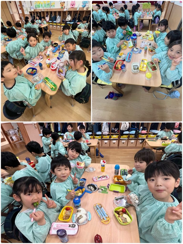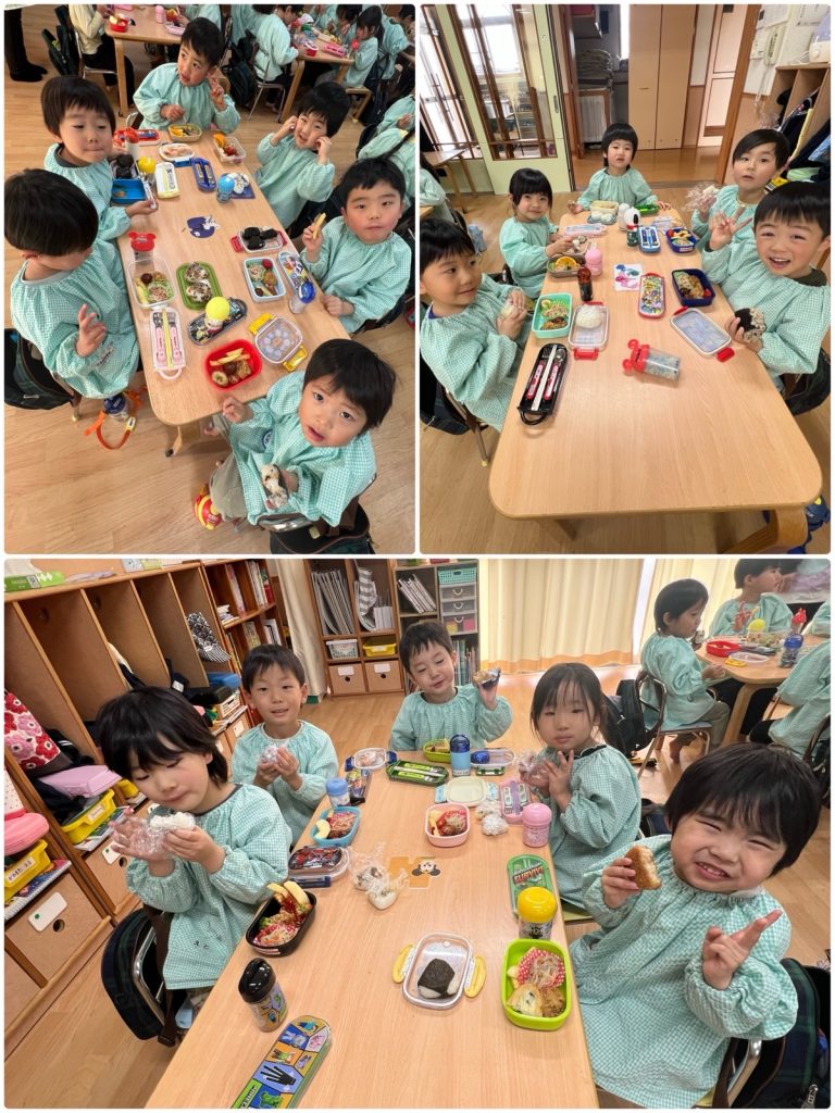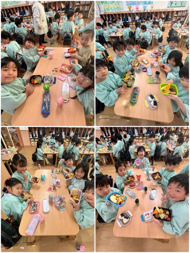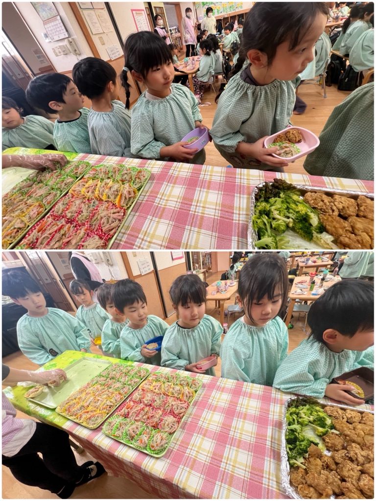 お別れ会のあとは楽しいバイキング給食です😊家族ごとに席について待ちます。久しぶりのバイキング給食なので、マナーを聞いて、テーブルごとに取りに行きました。食べたい物を何個欲しいか自分で伝えて、先生たちがお弁当箱に詰めました🍱自分の好きなものをつめた、自分だけのお弁当❣️すごく嬉しそうに見せてくれました。まつ組と一緒のバイキング給食とても楽しく・美味しくできました😄