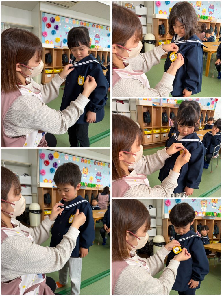 3歳以上児クラスは新しい教室で元気に過ごしています。新しいクラスの名札をつけてもらって大喜び❤️毎日もってくるスモックとハンカチ!ハンカチでいろんなものを作ってみます、ハンカチ遊びが楽しいので、ハンカチは自分で用意してもってきてね!たくさんのことに自分からチャレンジしていこうね、