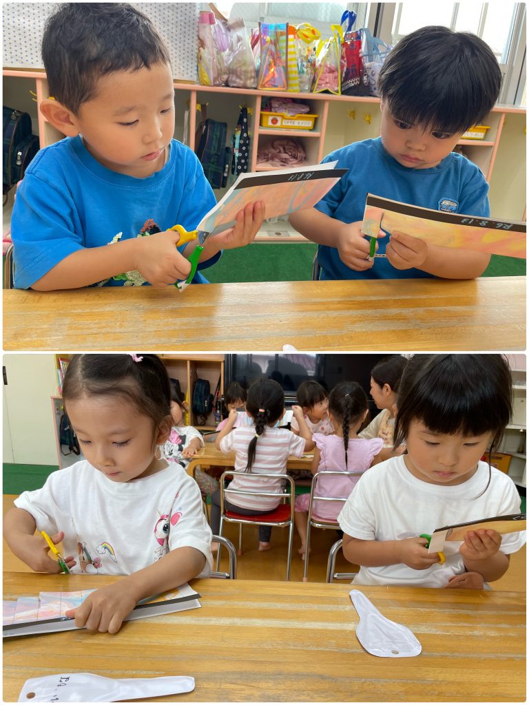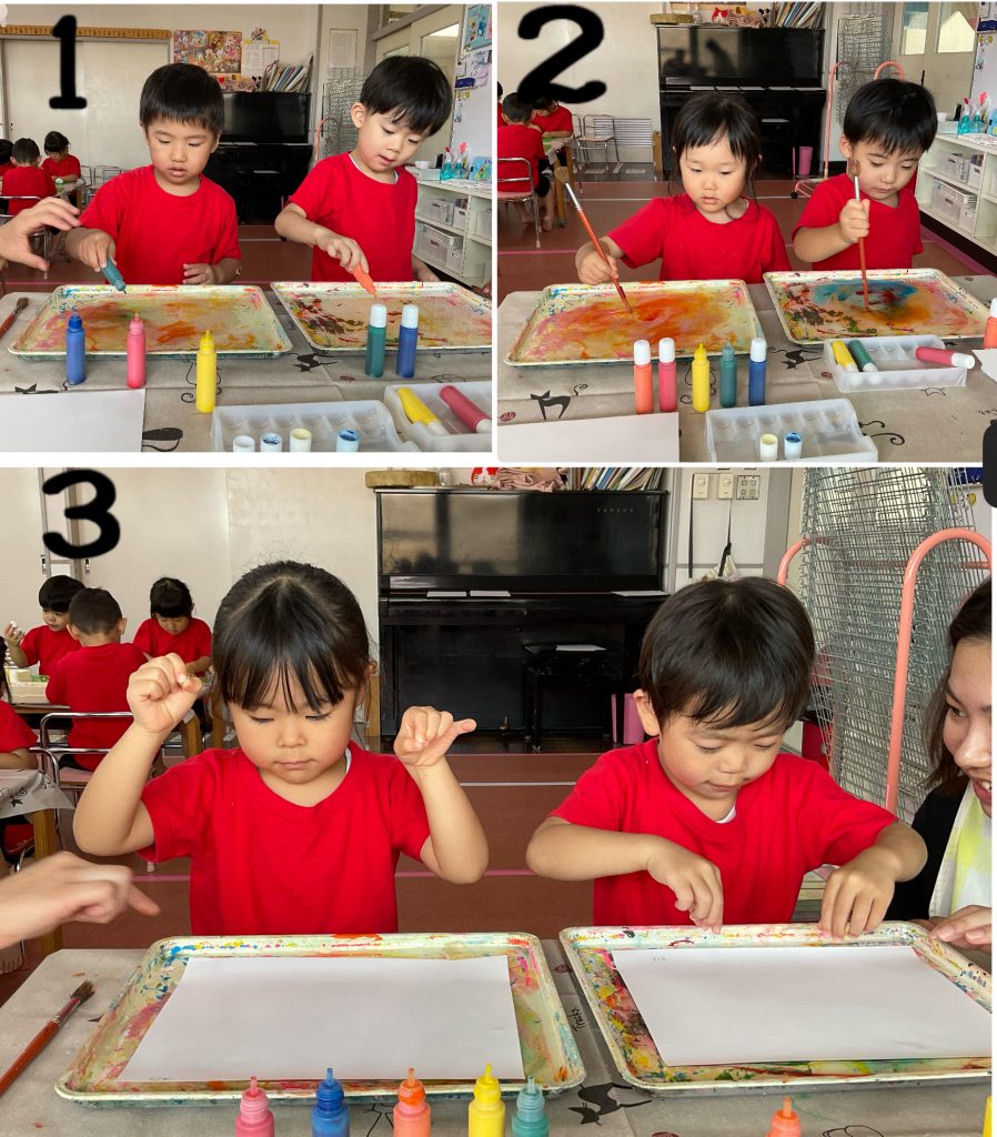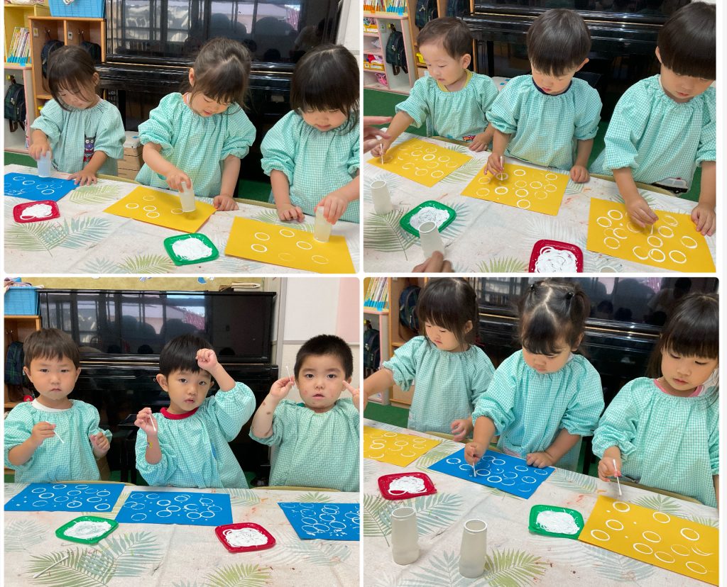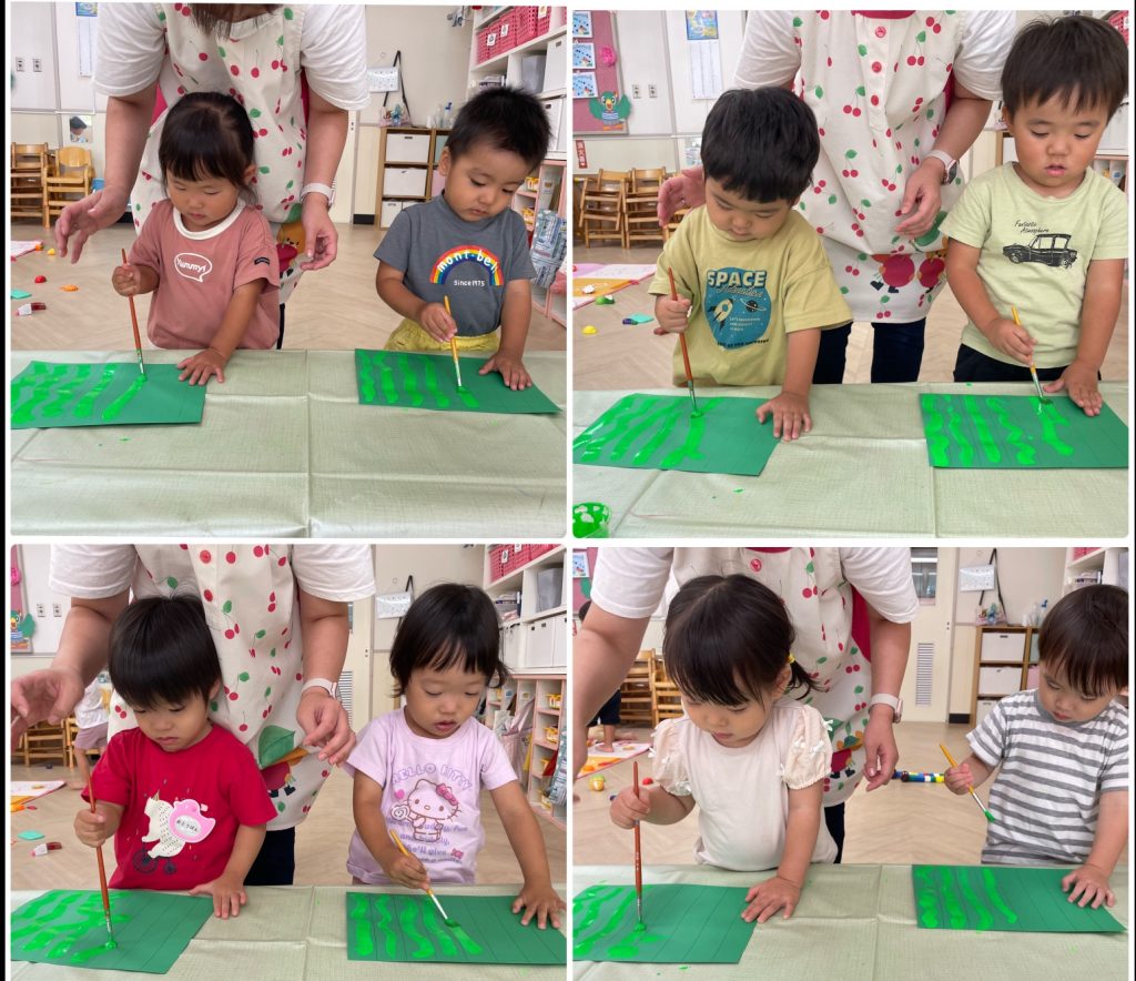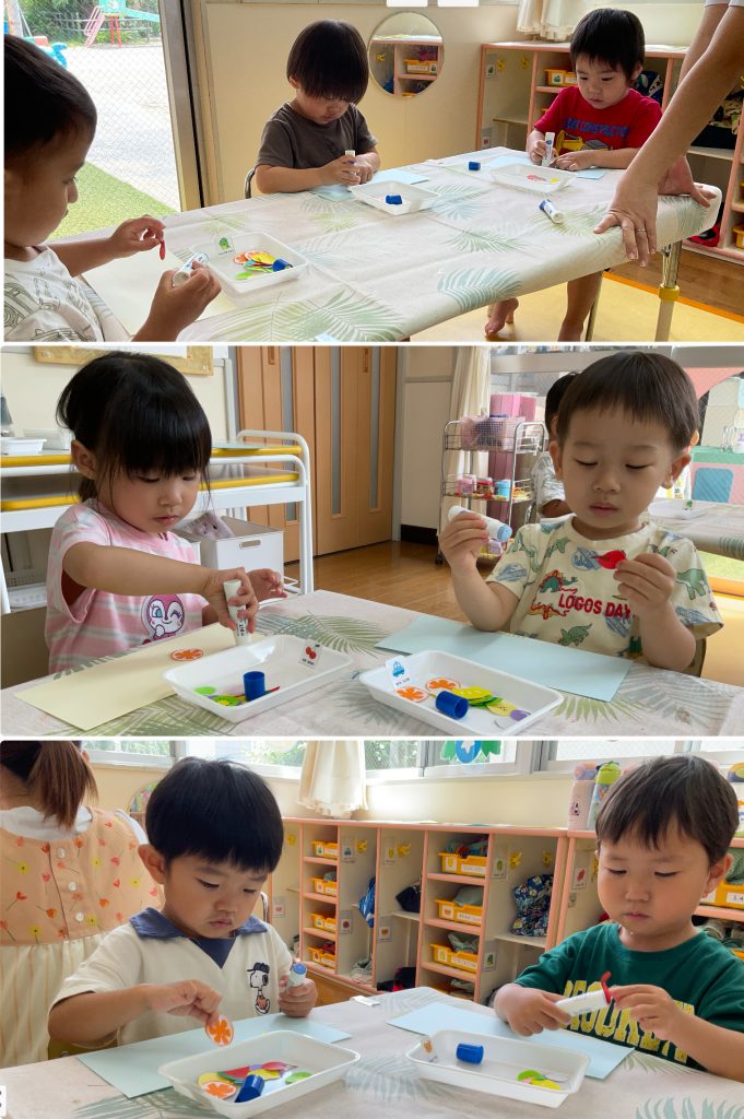 ちゅうりっぷ・もも・ふじ組がお盆の提灯を製作しました。ちゅうりっぷ組はたらし絵の具で提灯の中を🏮外枠をマーブリングで模様を映して切込を入れました。もも組は提灯の台紙にシールを貼り、提灯の周りの台紙にスタンピングを行いました。ふじ組は提灯の周りに使う台紙に緑の絵の具を筆で模様を入れて作りました。お盆前に持ち帰りますお楽しみに🏮