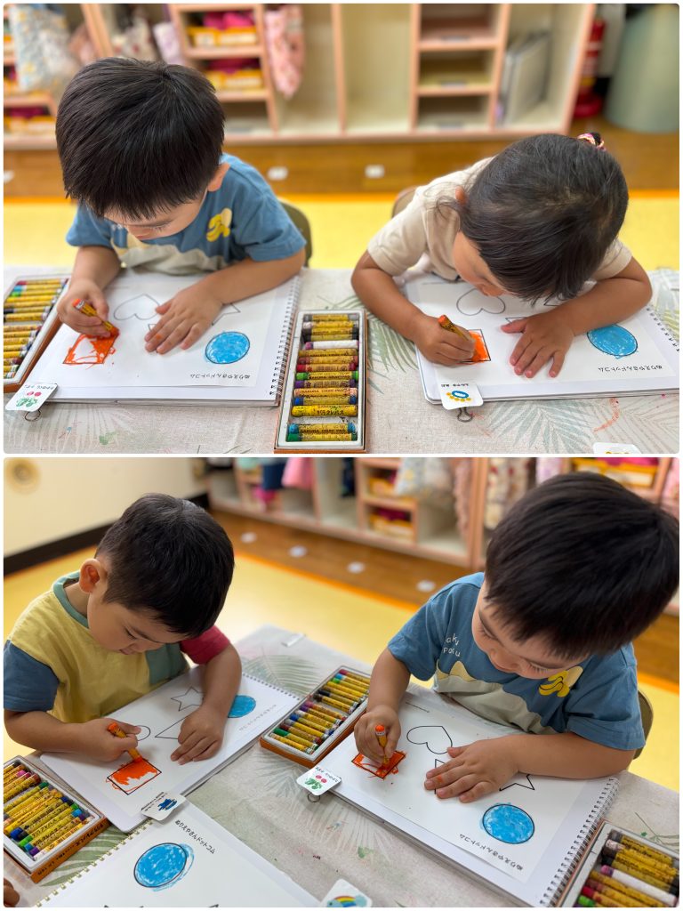 もも組は色と形の学びを教室で、色の確認・形の確認を塗り絵の活動を通して先生が色を理解しているか確認します.こんな時に、目の病気や何色かの色が判断できない目の仕組みの子がいることがあります.運動上ではかけっこの練習・玉入れで、以上児組の運動会を盛り上げます.