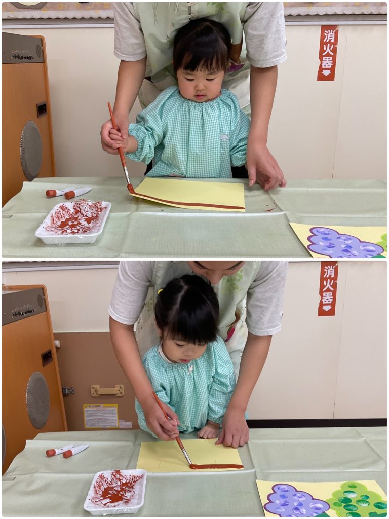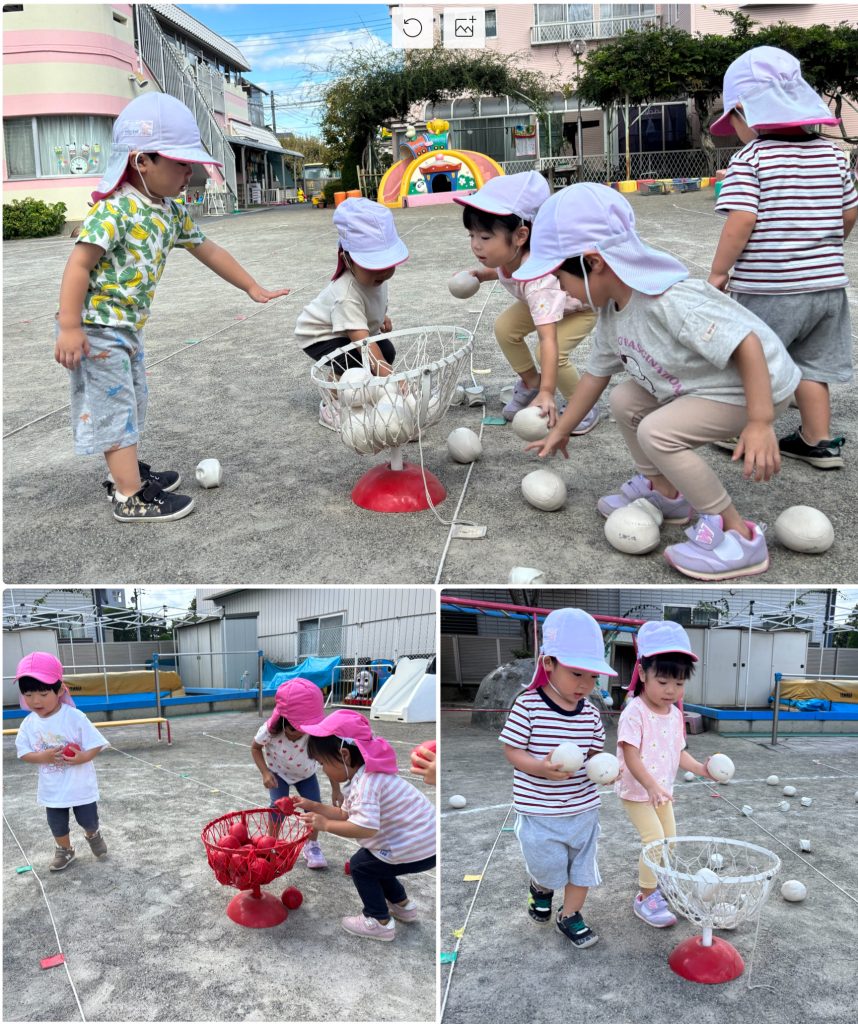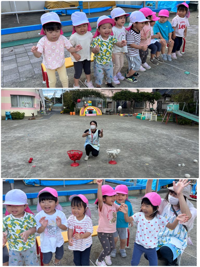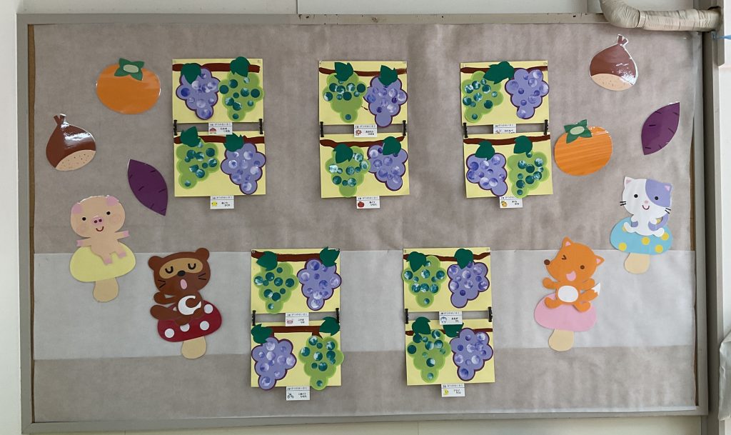 ふじ組も上のクラスの真似をして運動会ごっこです、玉入れ・かけっこ頑張りました。玉入れより、お片づけの方が早くできたようです。秋の味覚ブドウ製作も行いました。