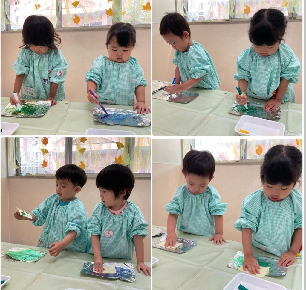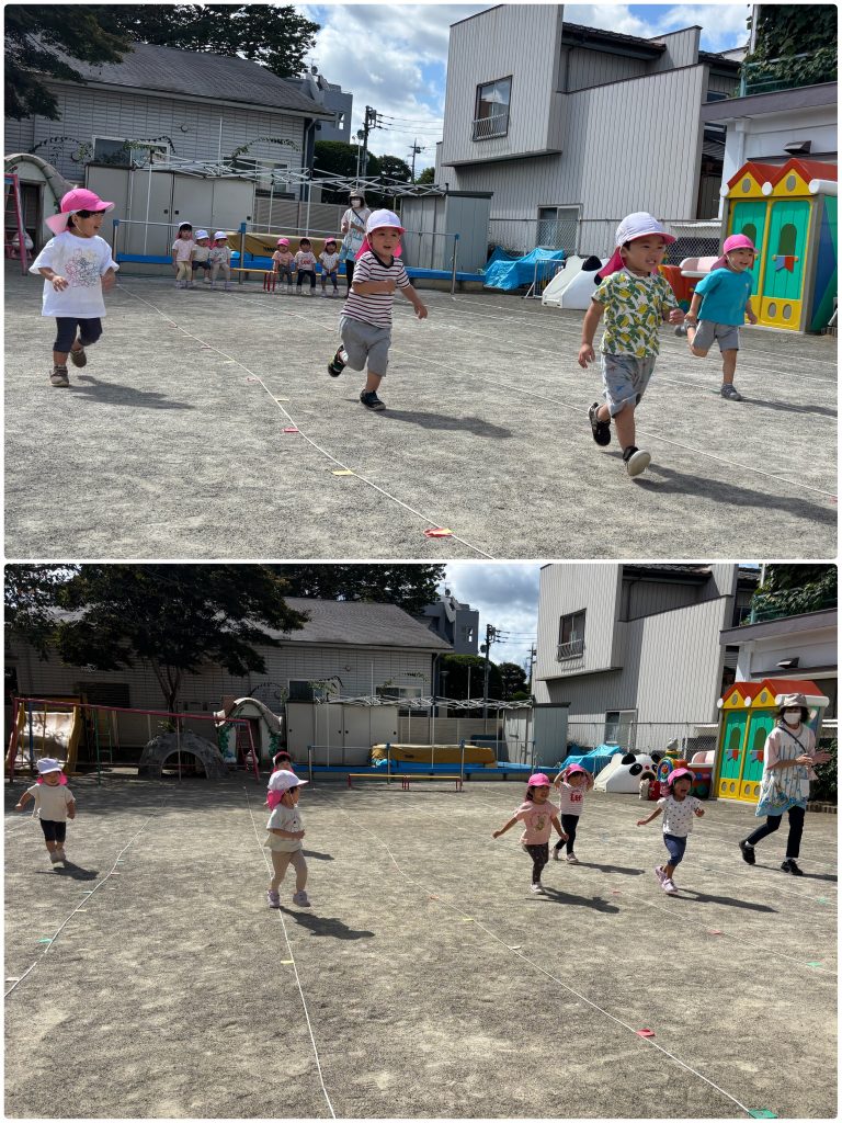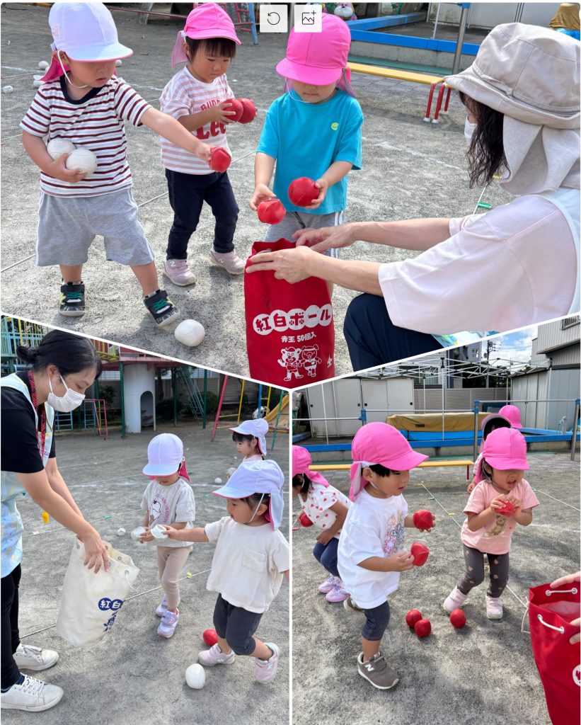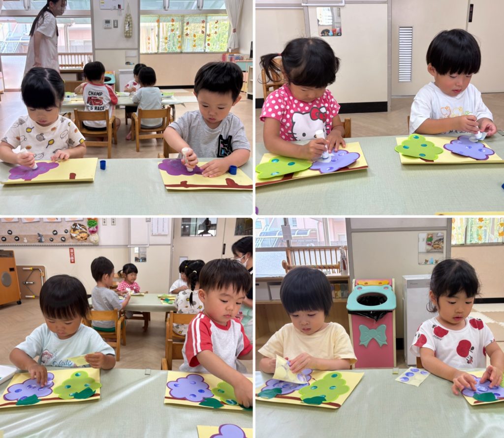 ふじ組も上のクラスの真似をして運動会ごっこです、玉入れ・かけっこ頑張りました。玉入れより、お片づけの方が早くできたようです。秋の味覚ブドウ製作も行いました。