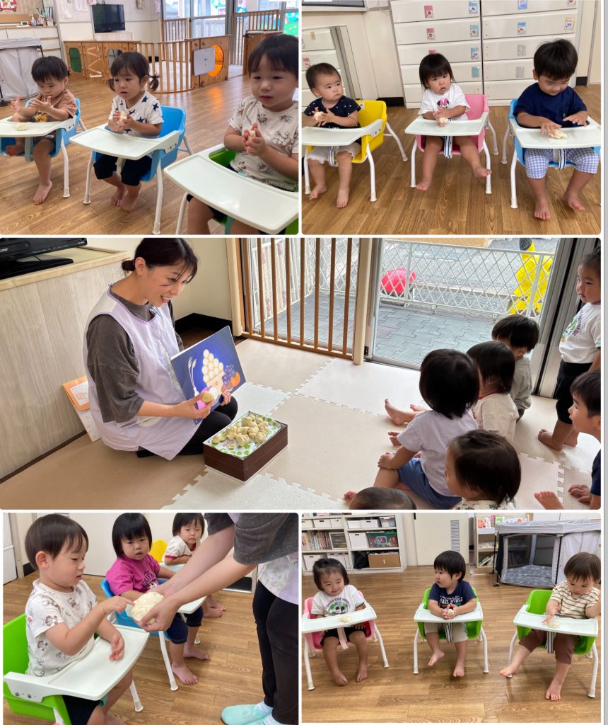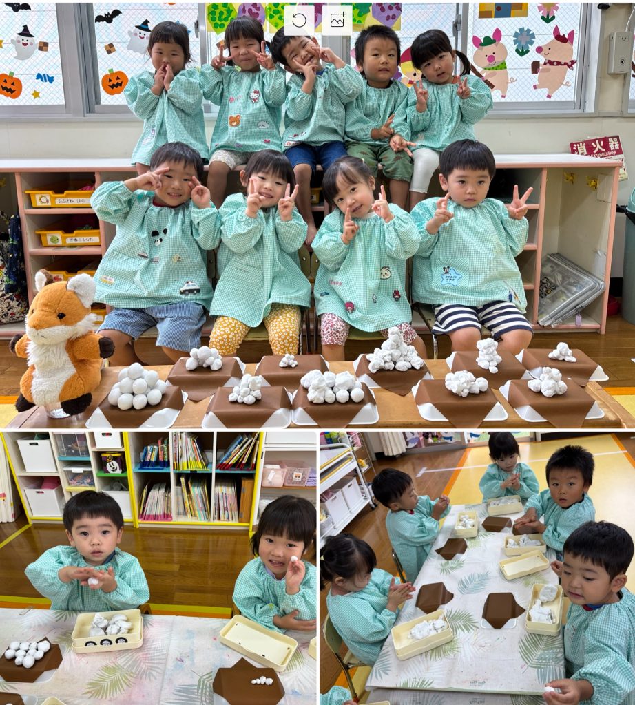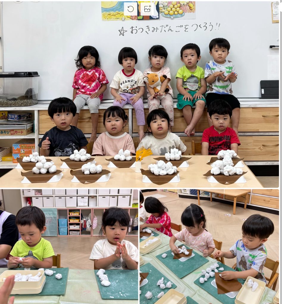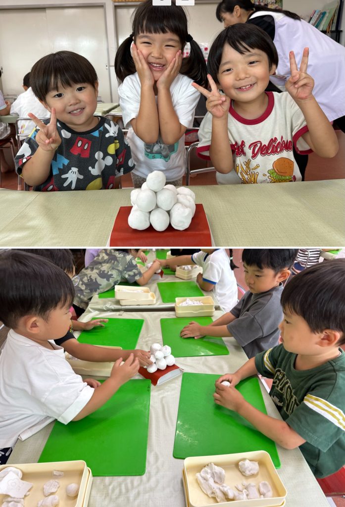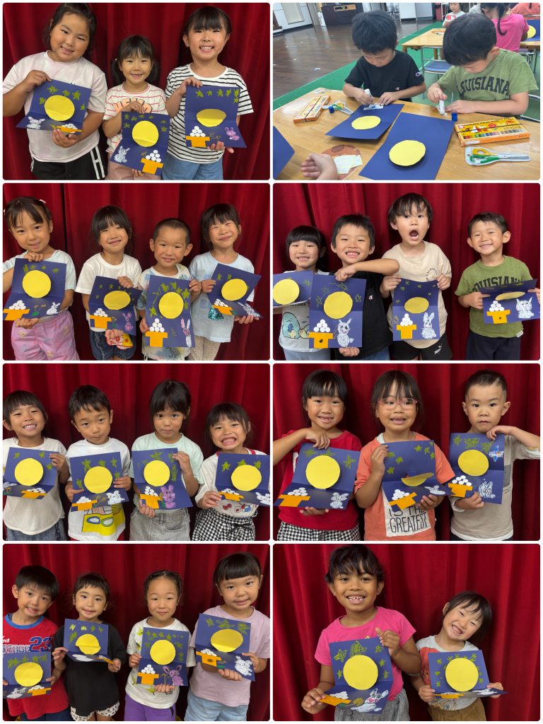 昨日は中秋の名月でです。雲が多い空でしたが、美しいお月さんが見えましたか❓子供たちはお月見の絵本を読んだり、粘土で月見団子を作ってお供えを作りました。まつ組は色画用紙で、飛び出るお月さんのお月見製作を行いました。お月見のお団子や、ススキ、芋などのお供えは、秋の豊作に感謝したり、これからも美味しい食べ物が食べられますように🙏という願いを込めているそうです