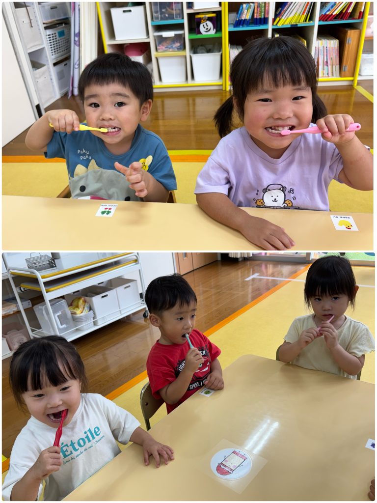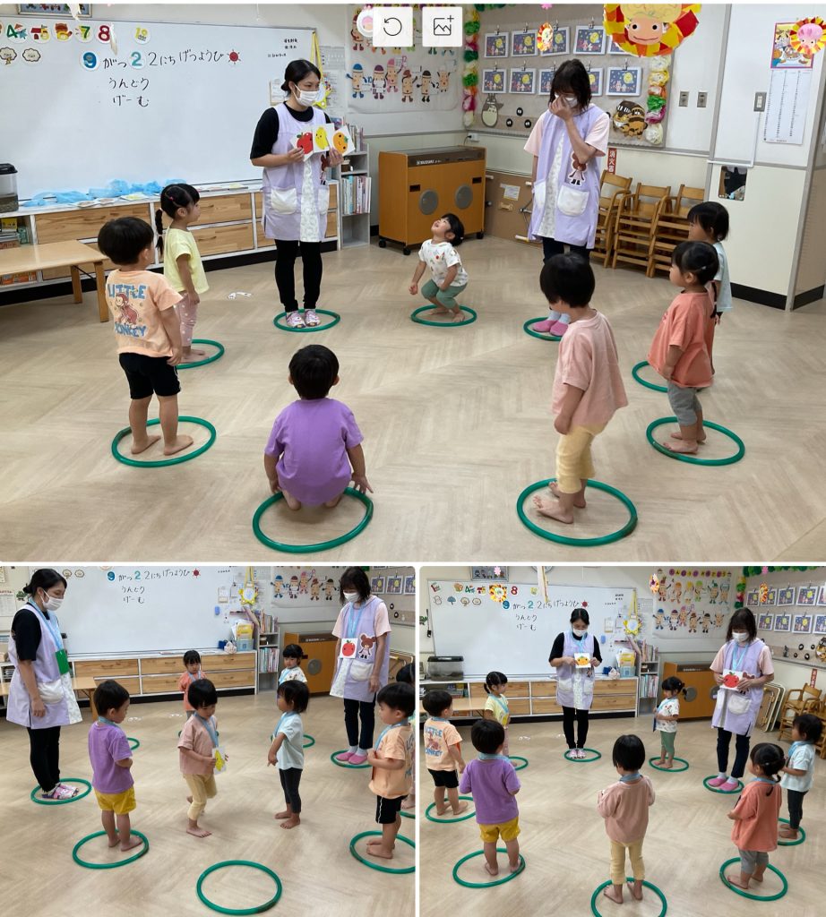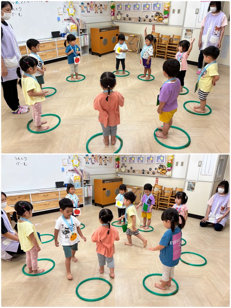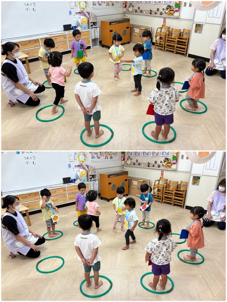 10月からもも・ふじ組が歯磨きの練習を始めます。先生とお口の中の話を聞いて虫歯にならないように安全に丁寧に歯ブラシで練習をします。お家でも歯磨き頑張ってください。ふじ・もも組は合同で活動を行います。ミニリングを使ってフルーツバスケットゲームを行いました。ルールのある活動も多くできるようになりました。