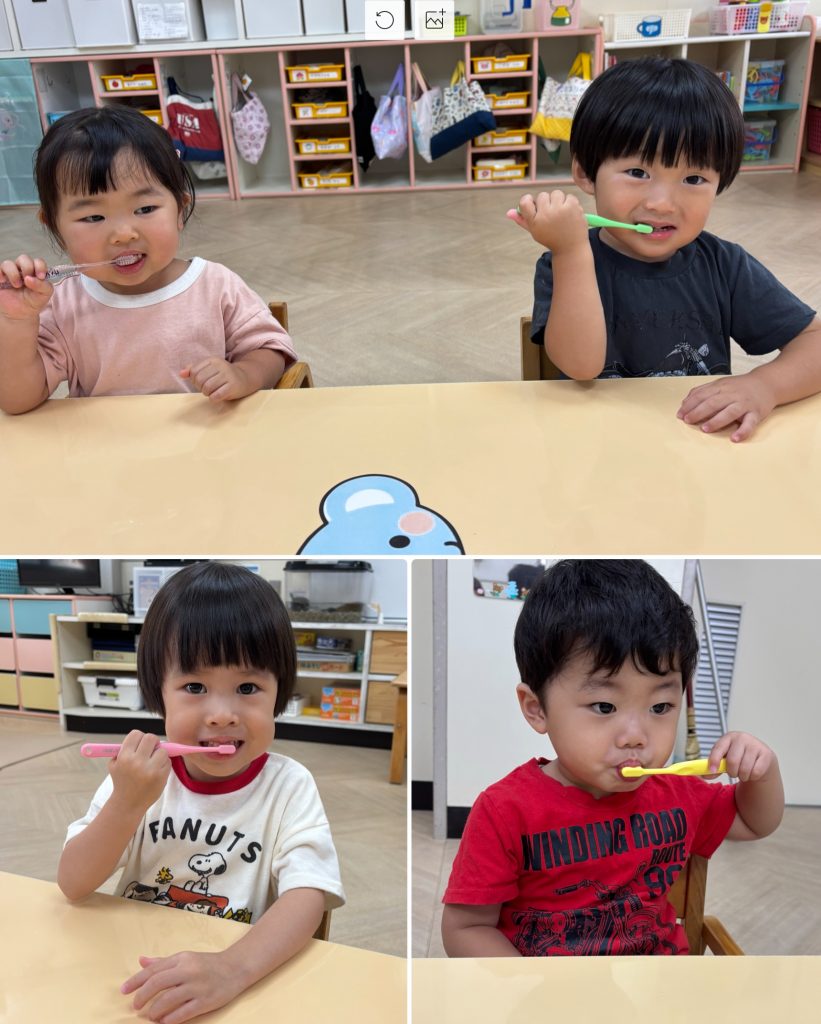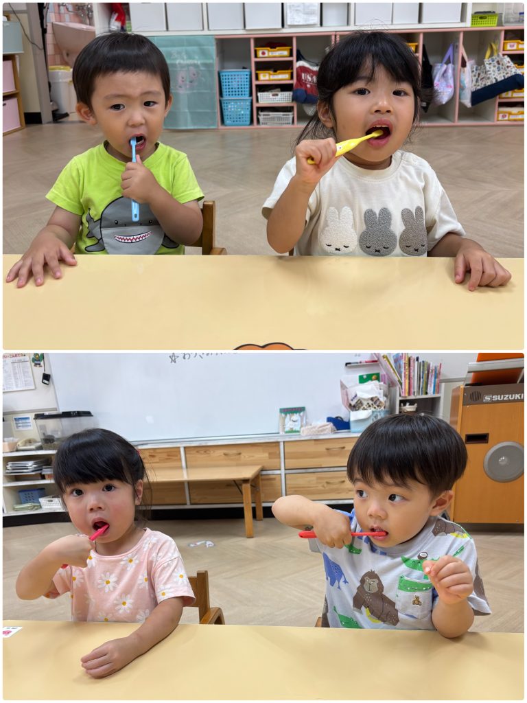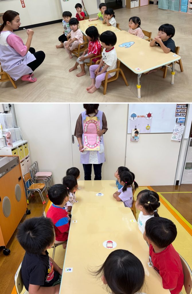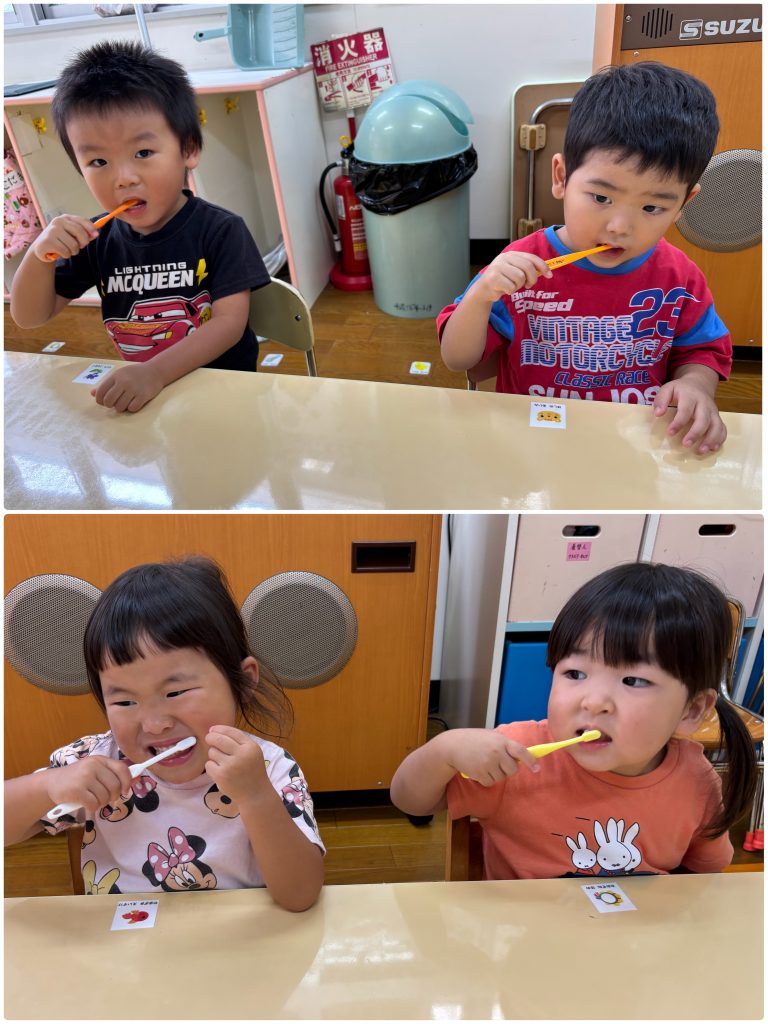 10月からもも・ふじ組が歯磨きの練習を始めます。先生とお口の中の話を聞いて虫歯にならないように安全に丁寧に歯ブラシで練習をします。お家でも歯磨き頑張ってください。ふじ・もも組は合同で活動を行います。ミニリングを使ってフルーツバスケットゲームを行いました。ルールのある活動も多くできるようになりました。