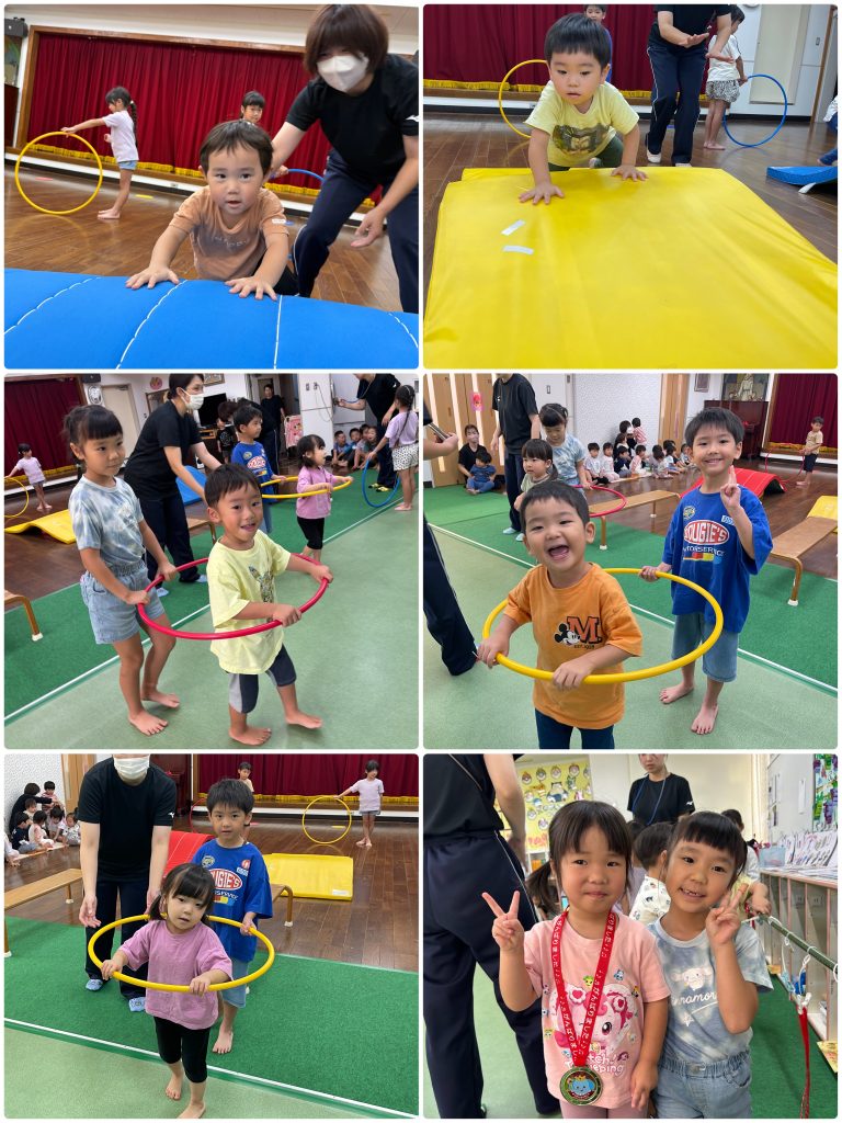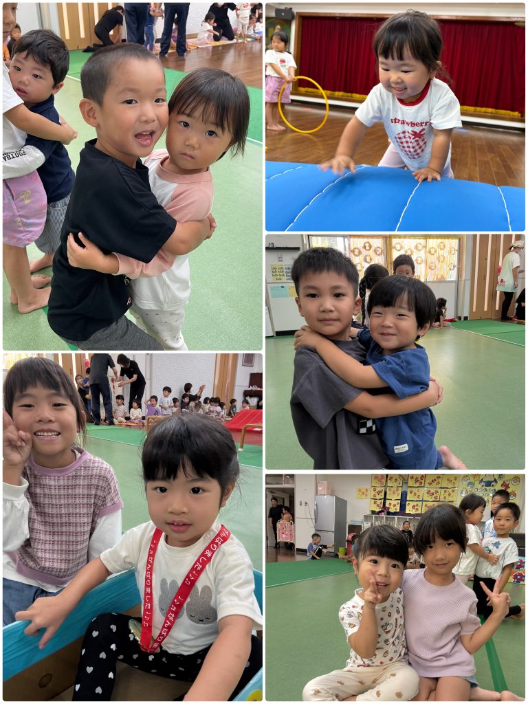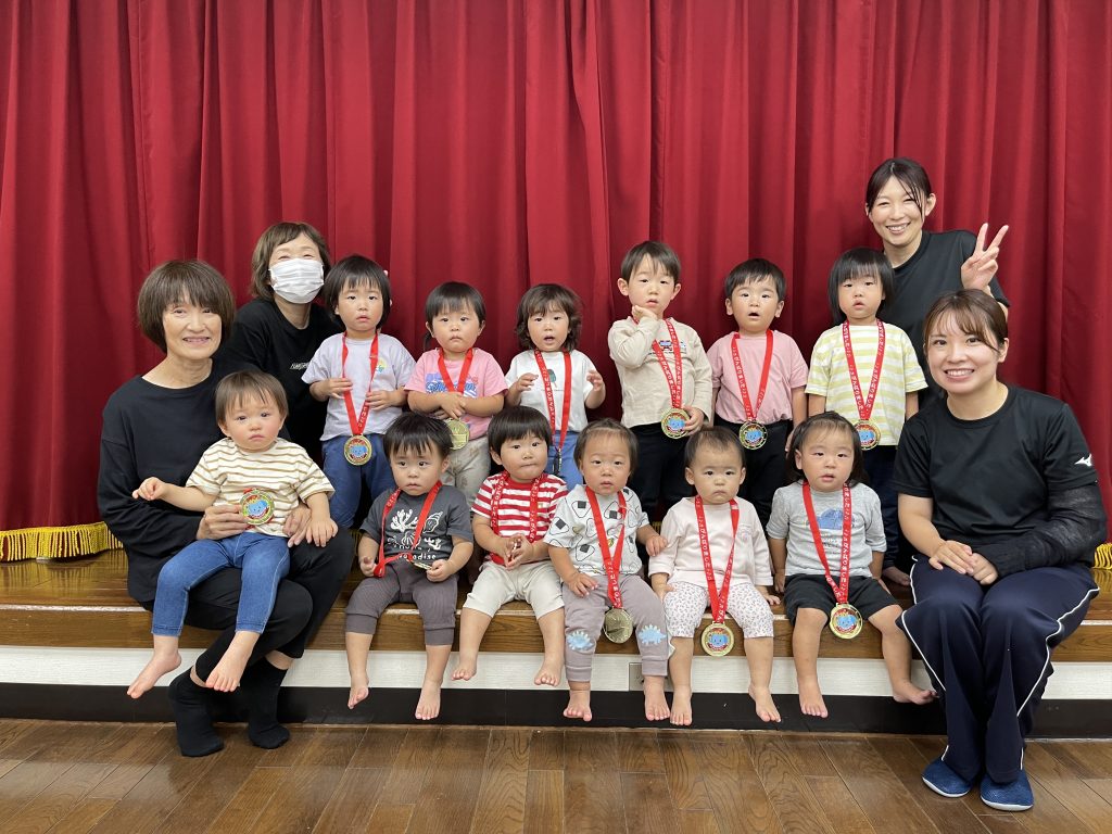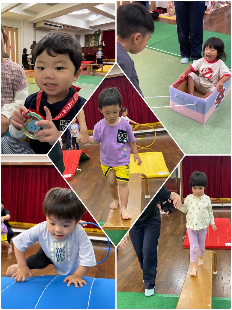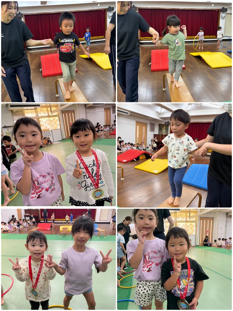 金曜日未満児運動会を行いました。まつ組のお姉さんお兄さんがお手伝いを👍さすがです。輪っかくぐり・マット上り下り・箱バス・平均台、最後にまつ組にメダルをかけてもらってゴールです。まつ組も優しくお手伝いができ、最後に小さいお友達にハグをして「頑張ったね」と褒めている姿❣️成長を感じ嬉しくなりました。育ったように子供は育つ👍自分がやってもらったことを小さいお友達にできるまつ組は素晴らしいです。きっと小さいクラスのお友達もまつ組になったら小さいお友達に優しく接する姿が目に浮かびます。まさに保育園‼️