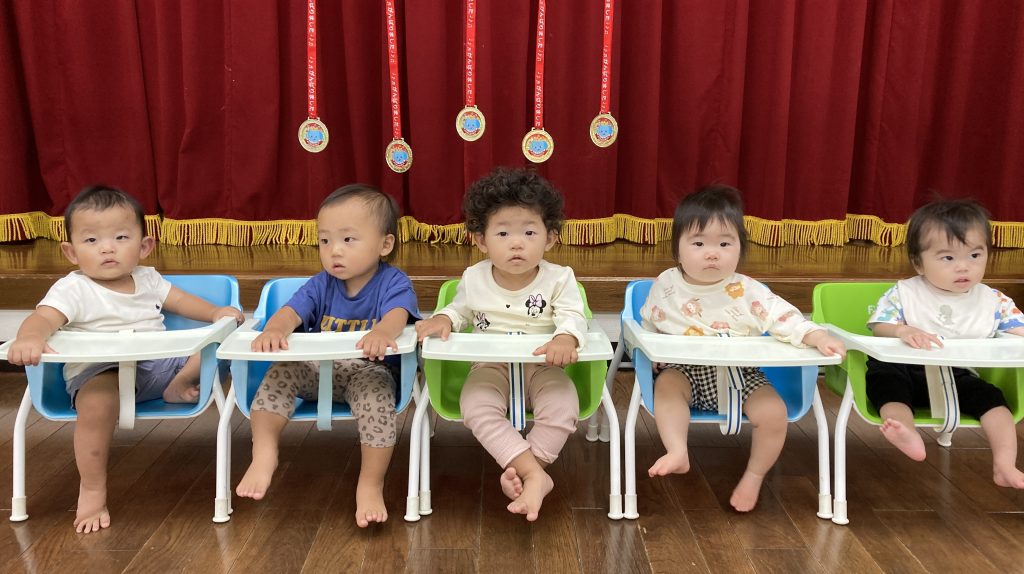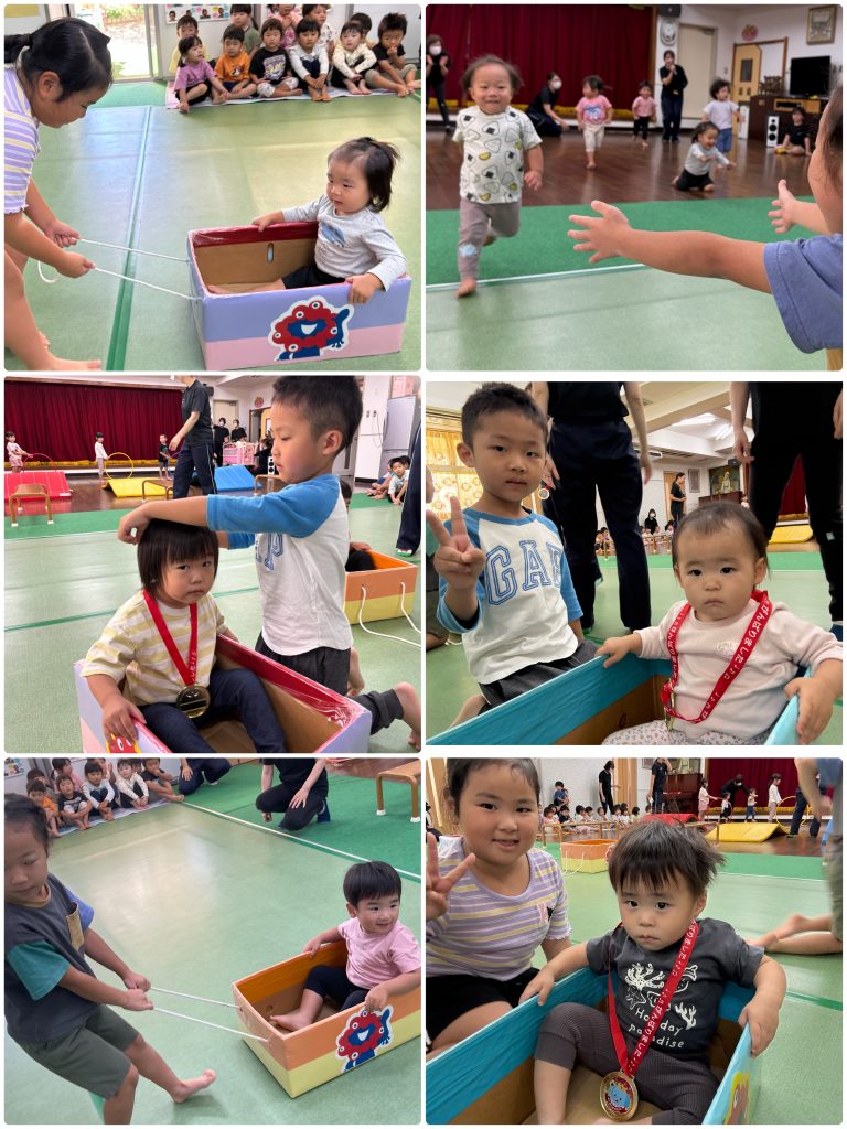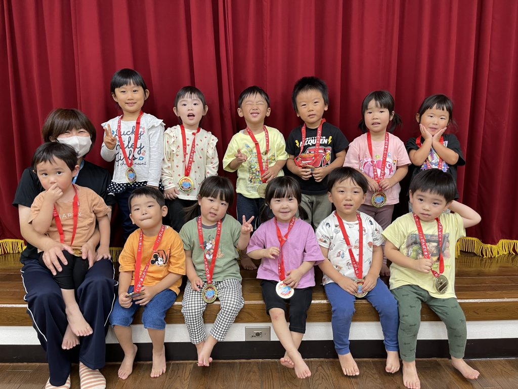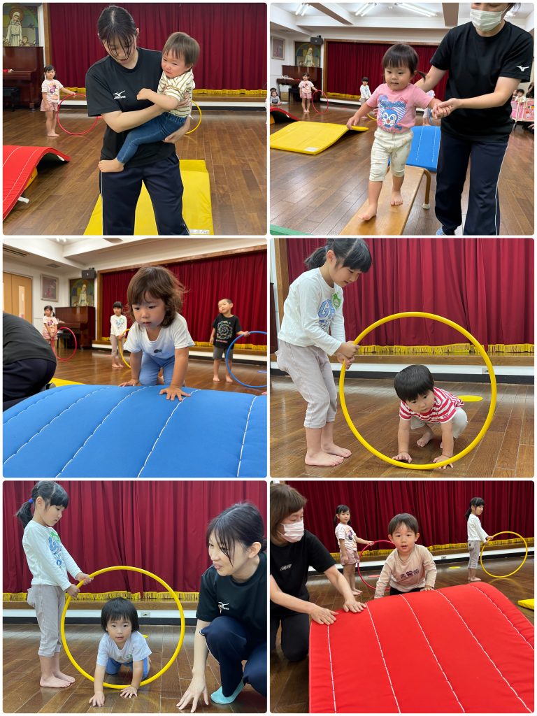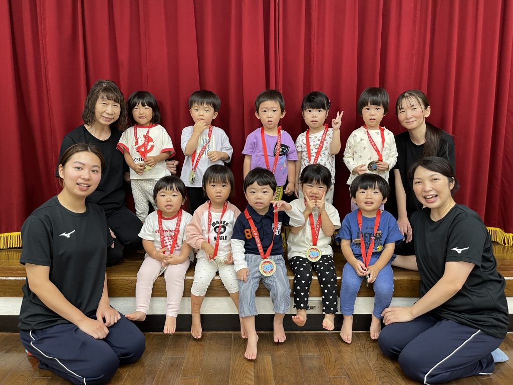 金曜日未満児運動会を行いました。まつ組のお姉さんお兄さんがお手伝いを👍さすがです。輪っかくぐり・マット上り下り・箱バス・平均台、最後にまつ組にメダルをかけてもらってゴールです。まつ組も優しくお手伝いができ、最後に小さいお友達にハグをして「頑張ったね」と褒めている姿❣️成長を感じ嬉しくなりました。育ったように子供は育つ👍自分がやってもらったことを小さいお友達にできるまつ組は素晴らしいです。きっと小さいクラスのお友達もまつ組になったら小さいお友達に優しく接する姿が目に浮かびます。まさに保育園‼️