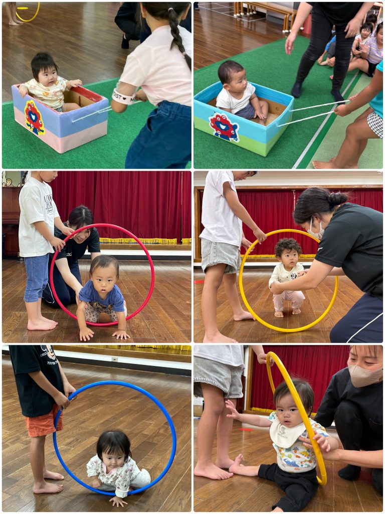 金曜日未満児運動会を行いました。まつ組のお姉さんお兄さんがお手伝いを👍さすがです。輪っかくぐり・マット上り下り・箱バス・平均台、最後にまつ組にメダルをかけてもらってゴールです。まつ組も優しくお手伝いができ、最後に小さいお友達にハグをして「頑張ったね」と褒めている姿❣️成長を感じ嬉しくなりました。育ったように子供は育つ👍自分がやってもらったことを小さいお友達にできるまつ組は素晴らしいです。きっと小さいクラスのお友達もまつ組になったら小さいお友達に優しく接する姿が目に浮かびます。まさに保育園‼️