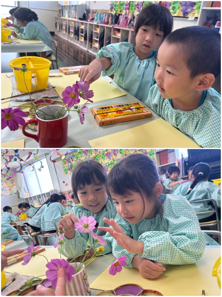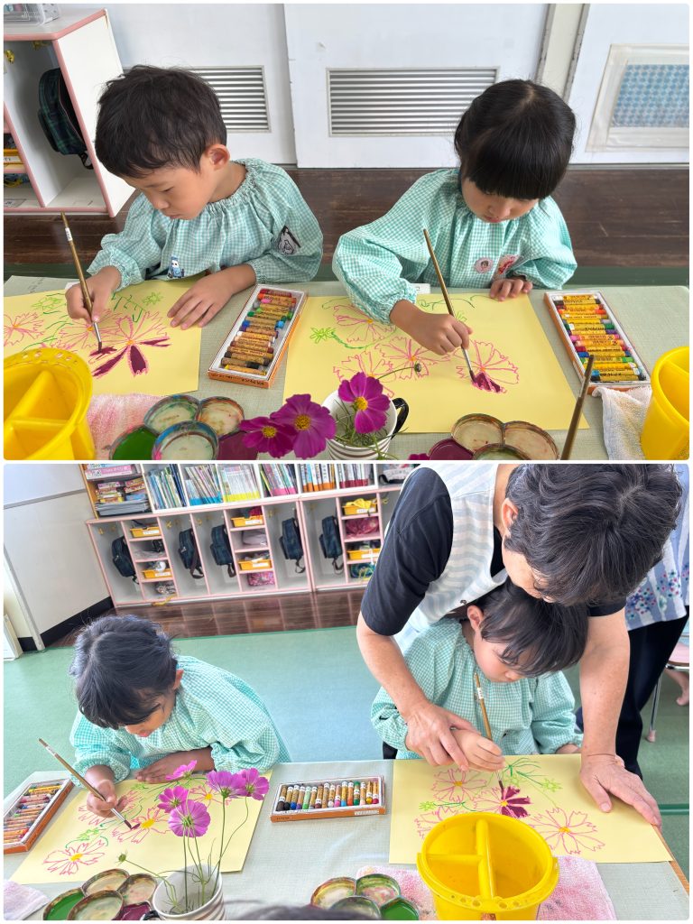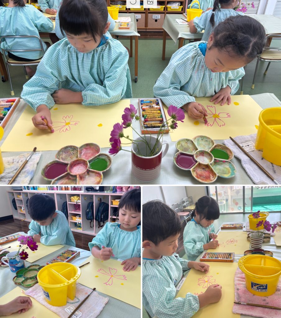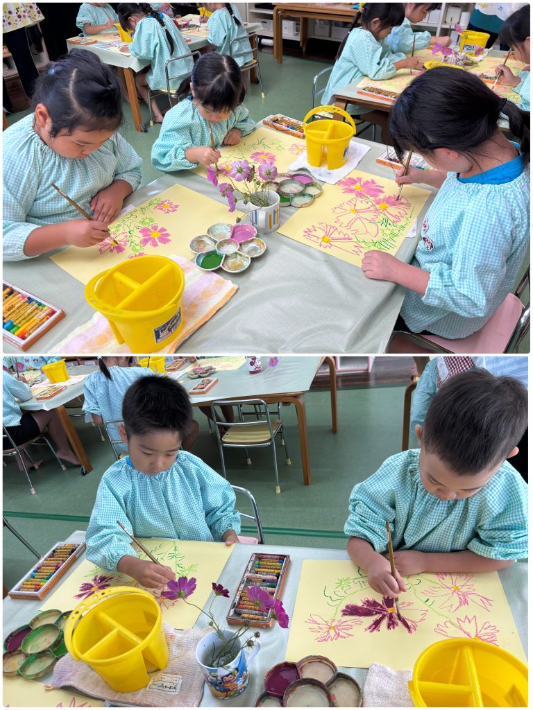 まつ組はコスモスの絵画を行いました。本物のコスモスをしっかり観察します、花びらは何枚?葉っぱの形❓等コスモスの観察が終わると黄色の花の中心をまず用紙に書き入れます。次はクレヨンで花びら・茎・葉っぱを描き入れます。次に筆で絵の具を絵色づけをしてコスモスの完成です。