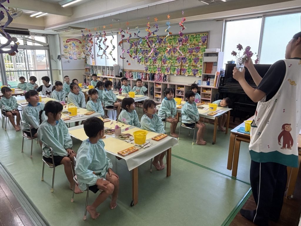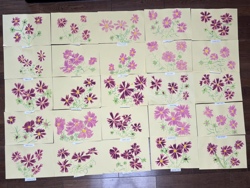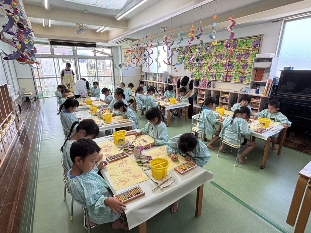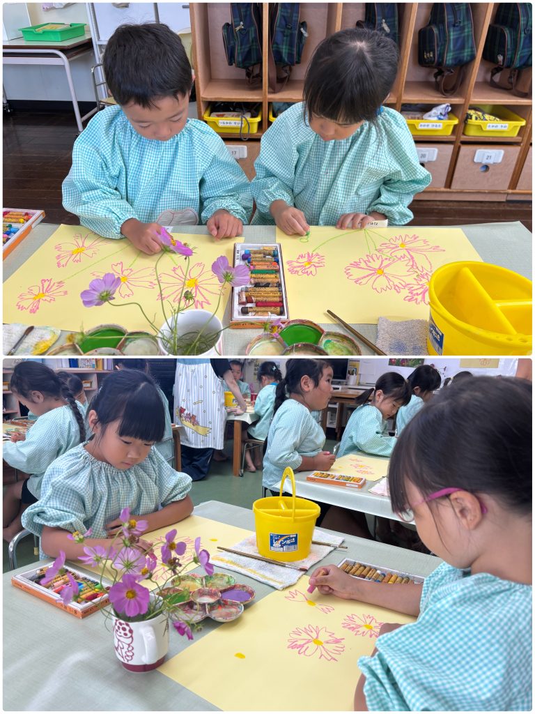 まつ組はコスモスの絵画を行いました。本物のコスモスをしっかり観察します、花びらは何枚?葉っぱの形❓等コスモスの観察が終わると黄色の花の中心をまず用紙に書き入れます。次はクレヨンで花びら・茎・葉っぱを描き入れます。次に筆で絵の具を絵色づけをしてコスモスの完成です。