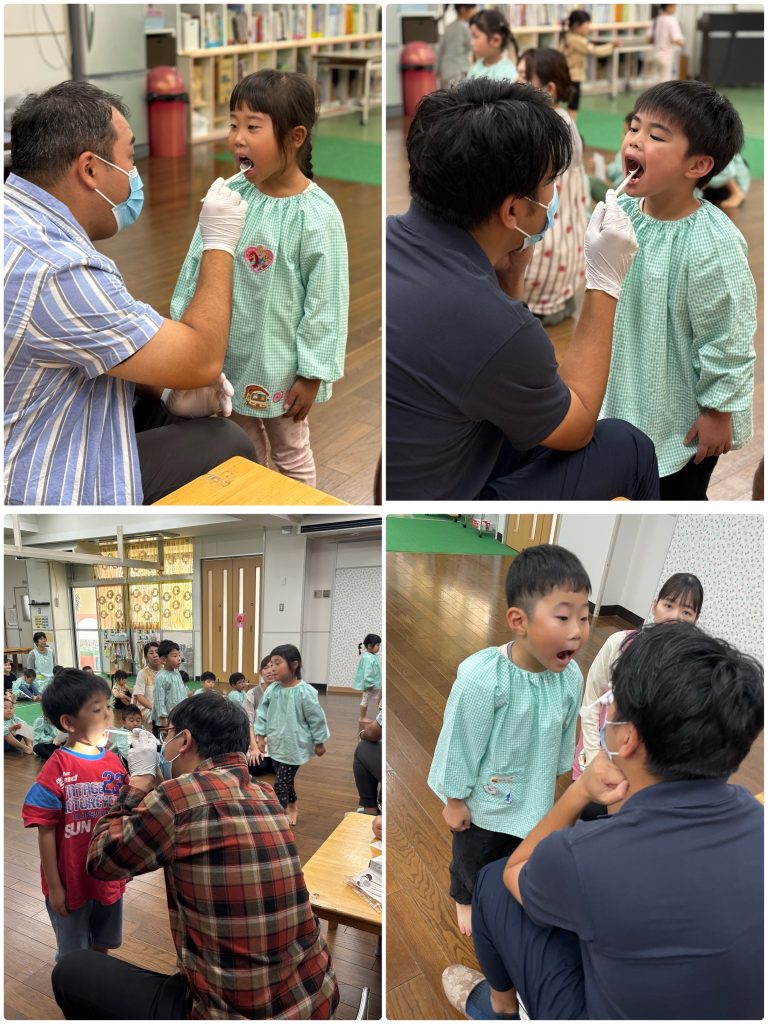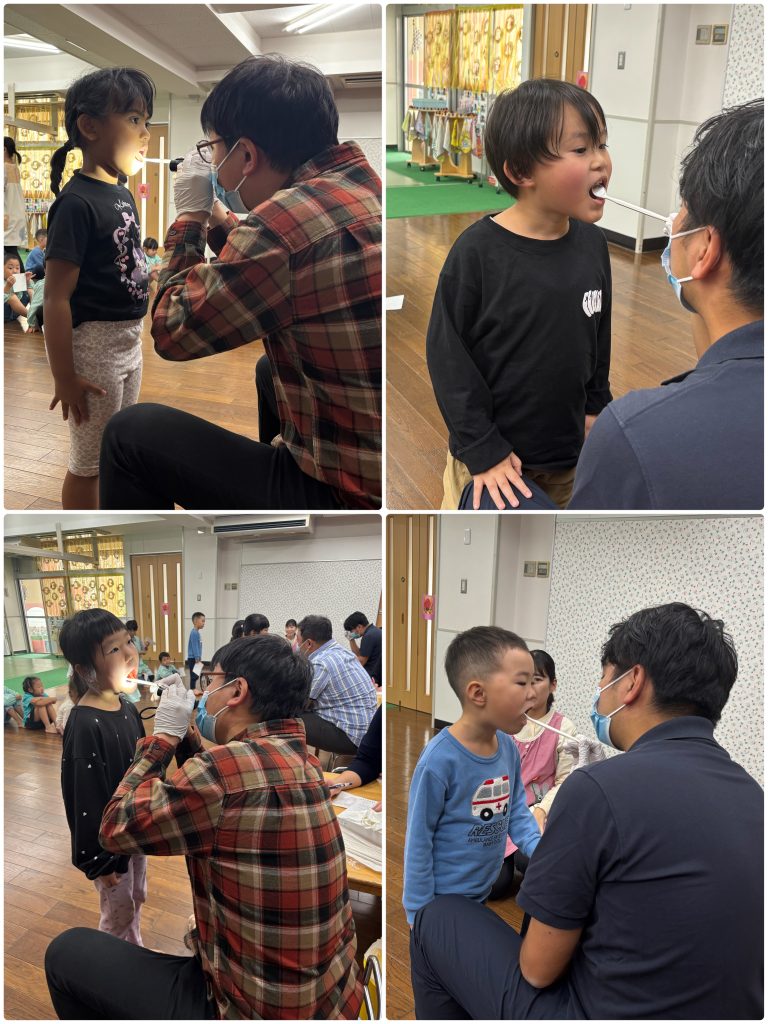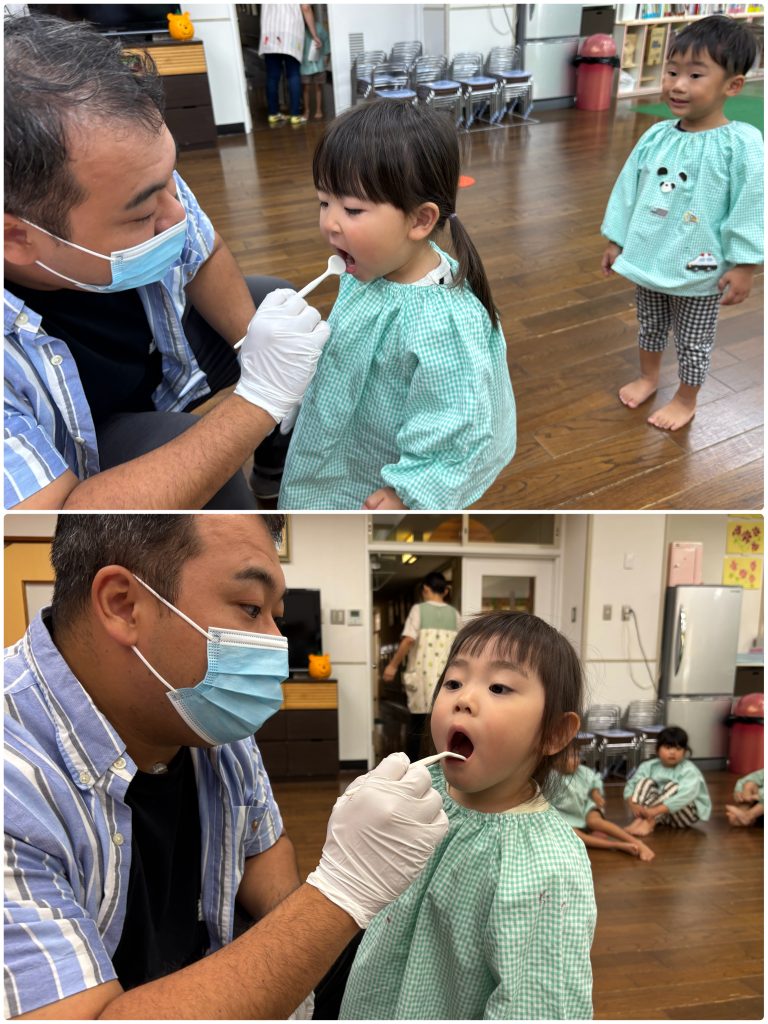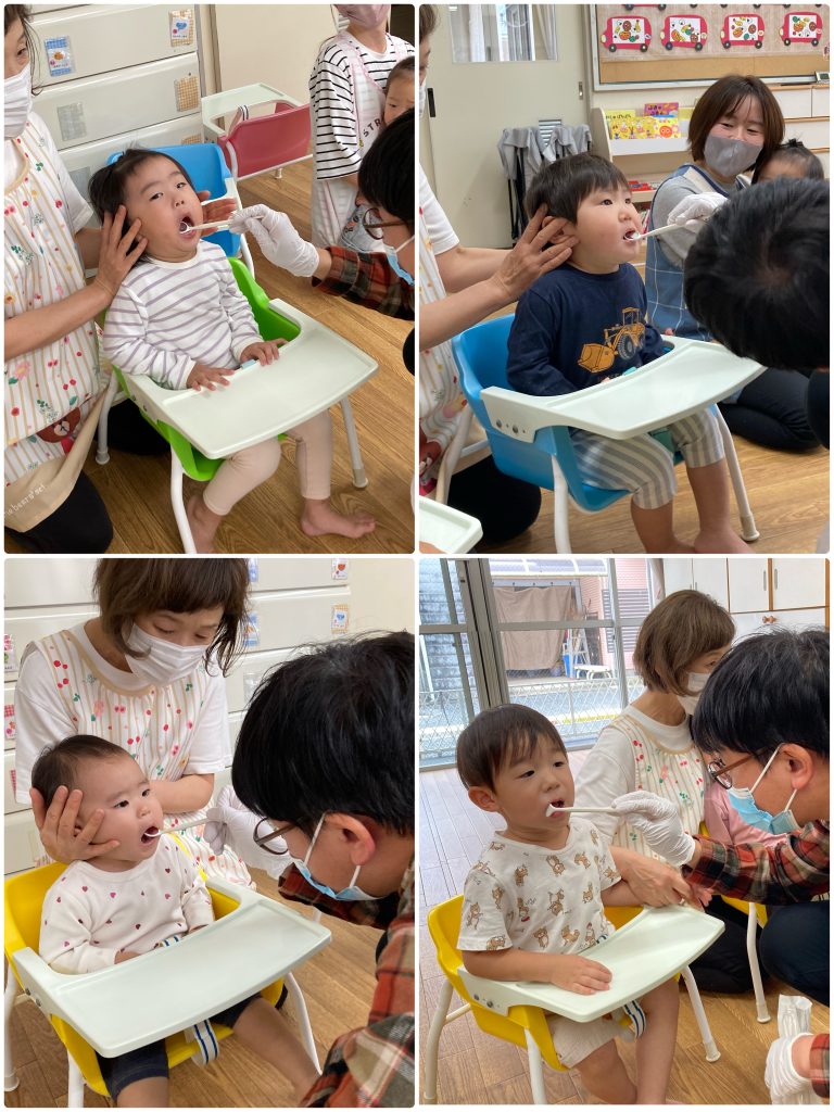 大きいクラスも小さいクラスも、泣かずに歯科検診を受けることができました。市野澤歯科の先生3人はとても優しく健診してくださいます。怖がらないように白衣は着ず、優しく声掛けしてくださいます。いつもありがとうございます。先生から最後に、歯の衛生状態が良く無いです、寝る前にはしっかり歯磨きをして、仕上げ磨きを保護者がするように声をかけてくださいと指導がありました。歯磨きよろしくお願いいたします。