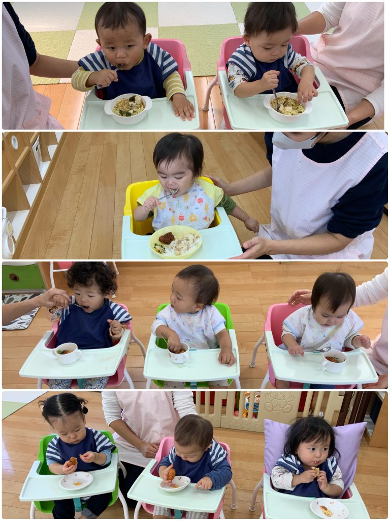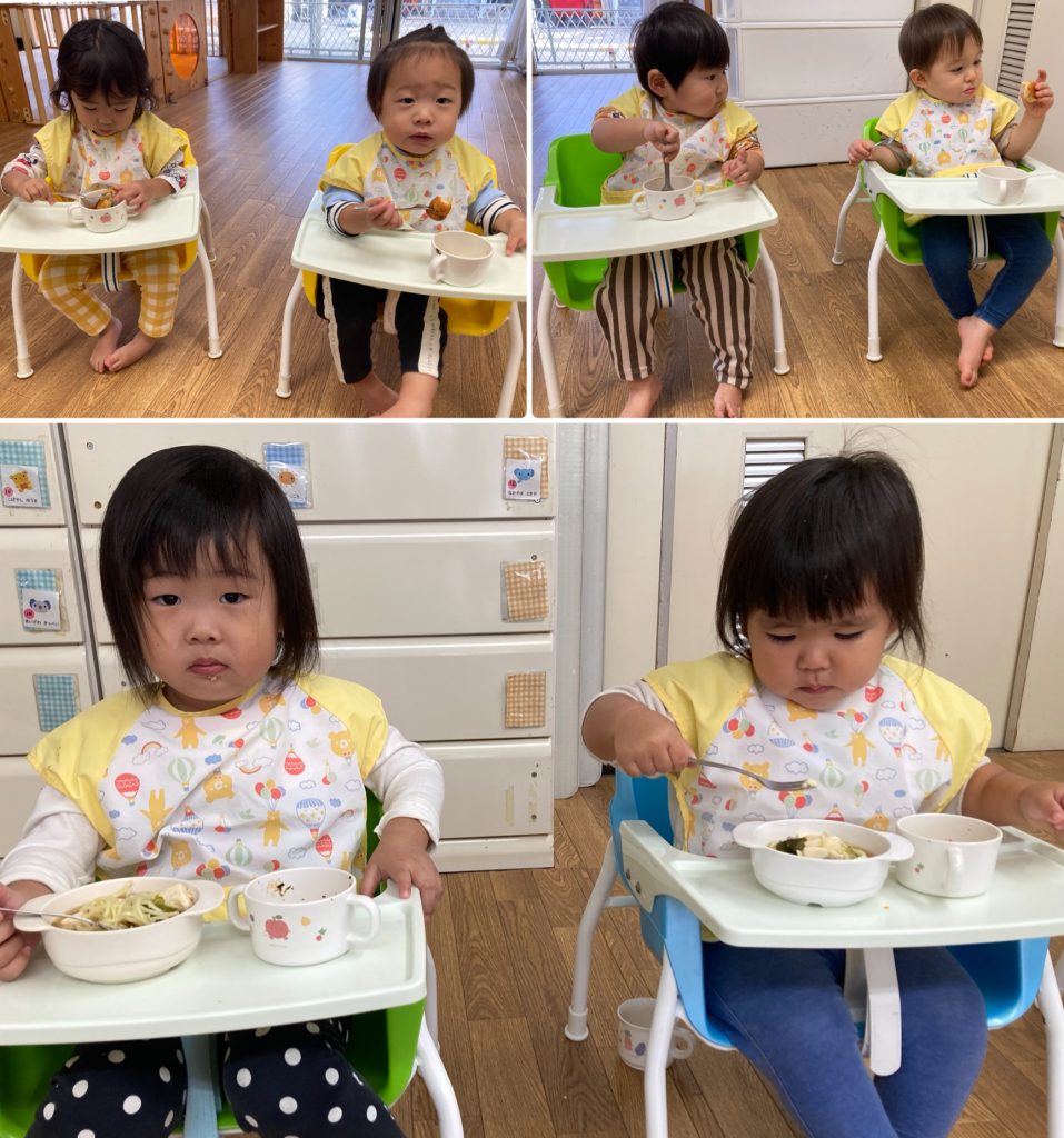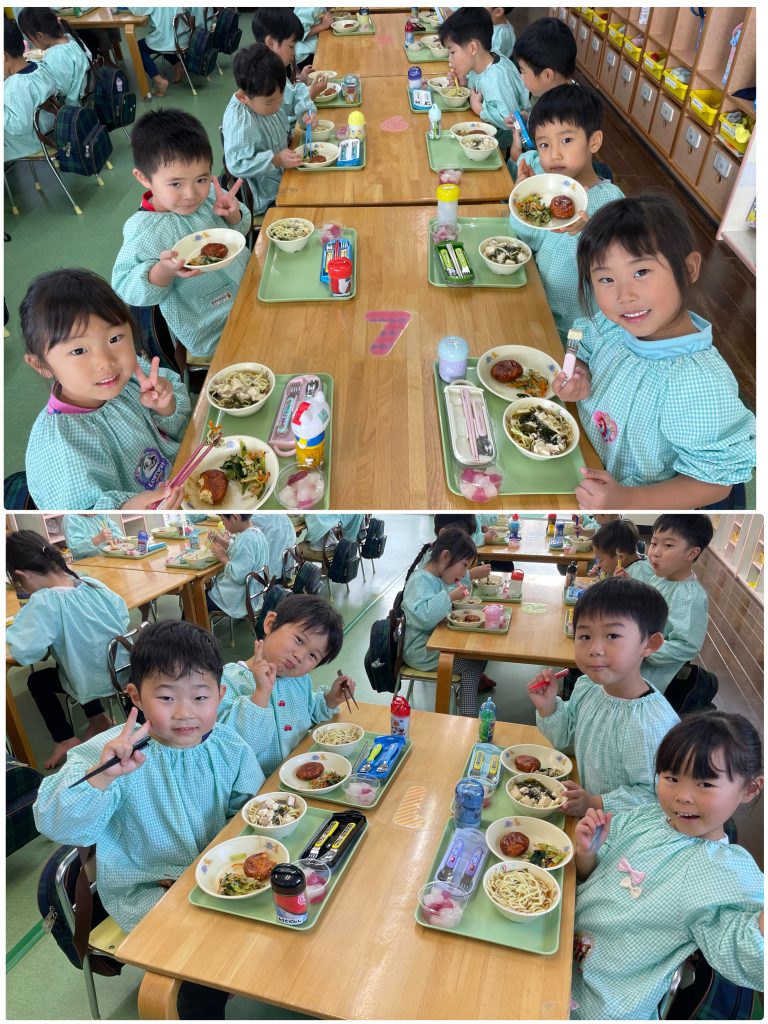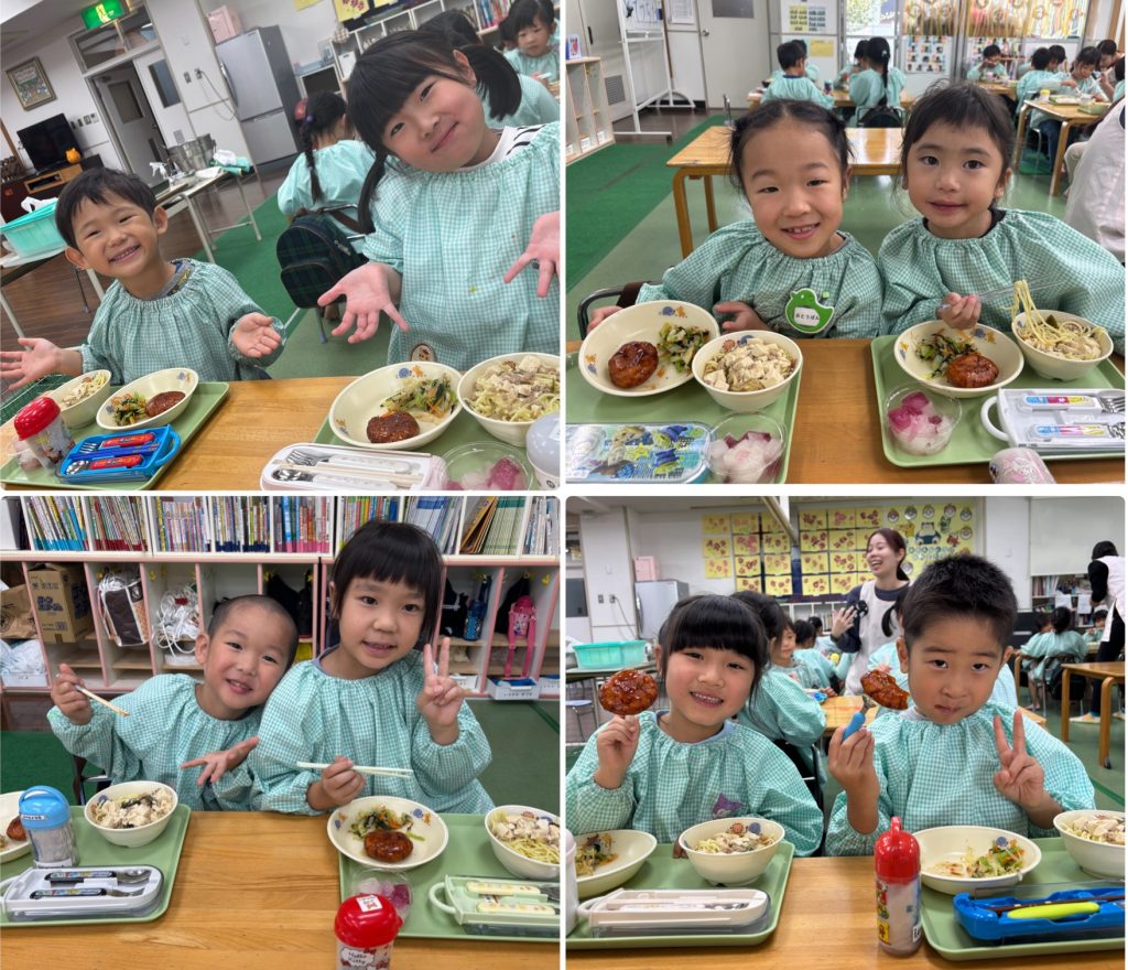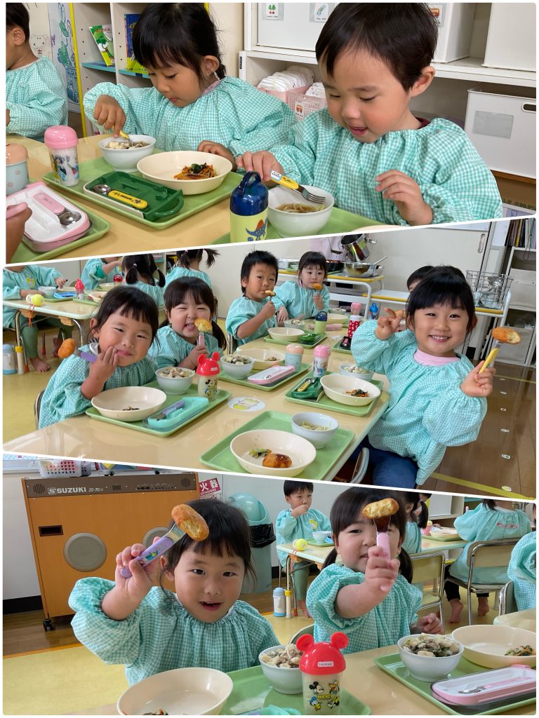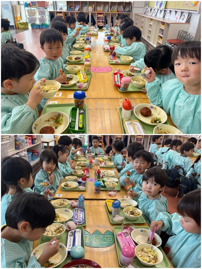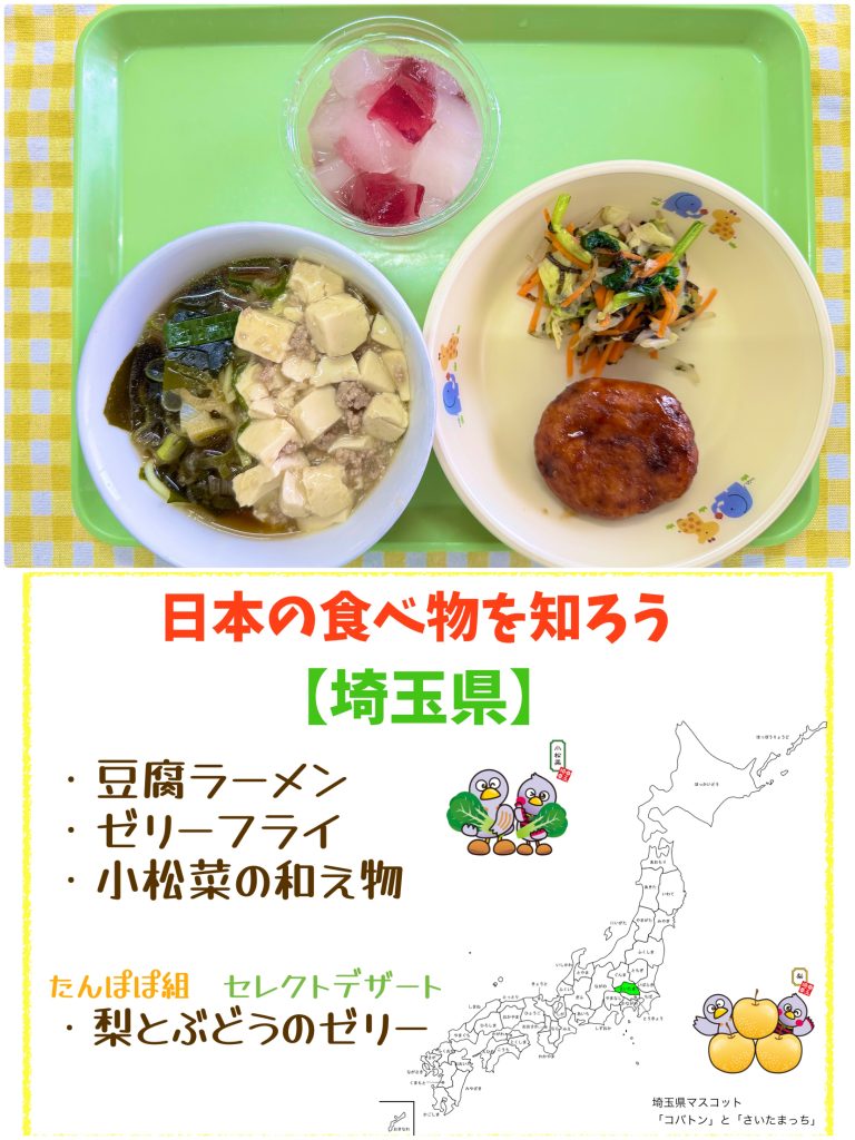 日本の食べ物を知ろうは、たんぽぽ組が決めた埼玉県です。はじめに先生・お当番が埼玉県の地図を持って埼玉県の食べ物の説明をします。小さいいクラスもちゃんと聞いています。豆腐ラーメンは麻婆豆腐の甘めの味でスープも美味しかったです。ゼリーフライは、小判の形をしていることから銭フライが訛ってゼリーフライになったとか、おからとじゃがいもとにんじん、玉ねぎを入れて、小判の形に仕上げてフライしました。和物は埼玉県は小松菜を使った料理が多いようです。たんぽぽ組が超楽しみにしていたのは、梨と葡萄のゼリーです、Z君は「超美味しい普通のゼリーだ」と絶賛していました。自分たちで決めたメニューは絶品なんですね、来月は何県のメニューか楽しみですね、給食の先生いつもありがとう😊