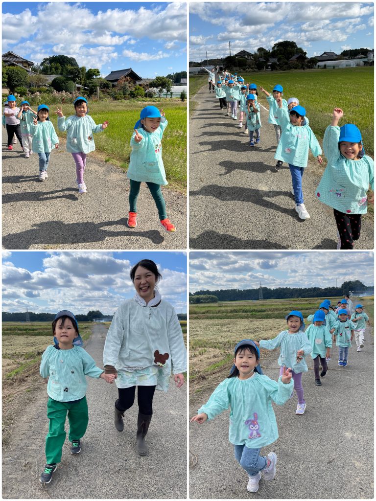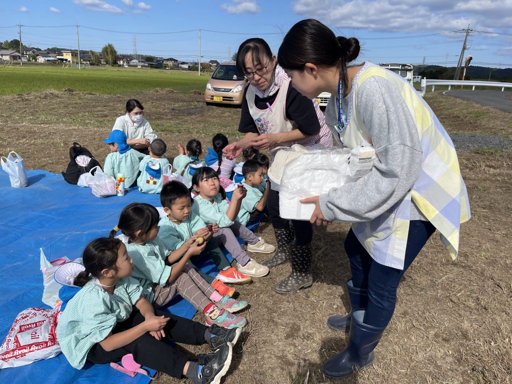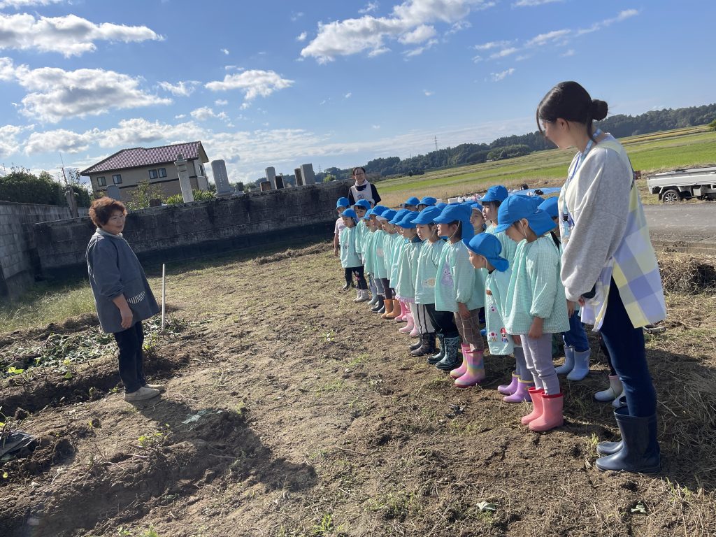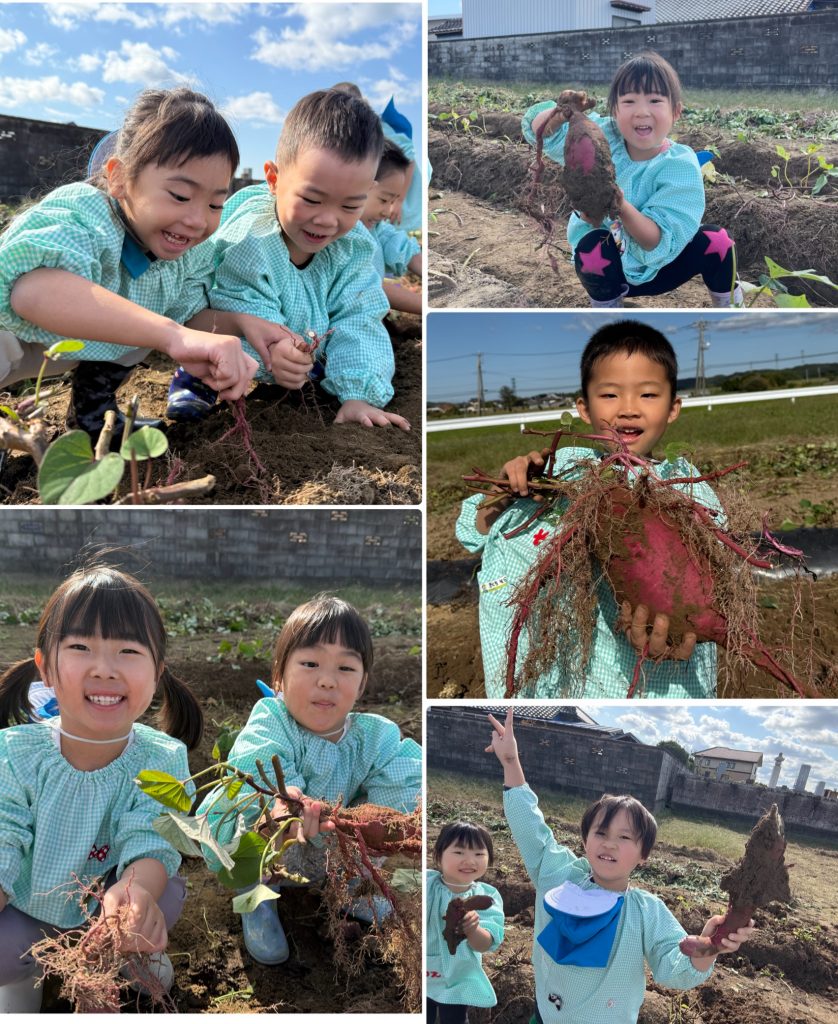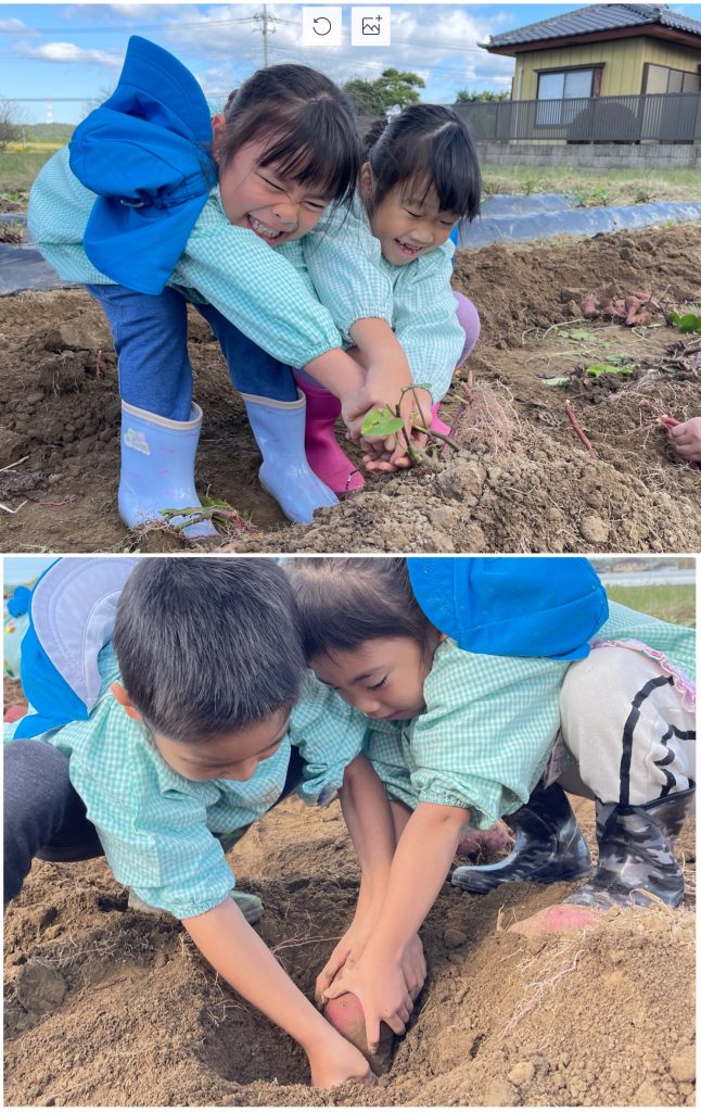 先週の金曜日にバスでみっちゃんの畑にさつまいも掘りにいきました。今年は暑くて、雨が少なく心配しましたが、大きいお芋がたくさん取れました。手が汚れるのも平気で、夢中で掘って芋をぬいていました。芋掘りの後は田んぼの散策🚶みんなニッコニコです。その後、手を消毒しみっちゃんがふかしてくれた芋を美味しくいただきました。「おかわりほしい人」ほとんどの子が手をあげておかわりして食べました。みっちゃんいつもありがとう❣️お土産に持ち帰りましたさつま芋は、お家で何の料理になるのか楽しみです。