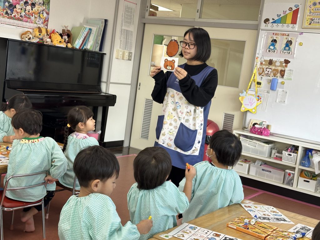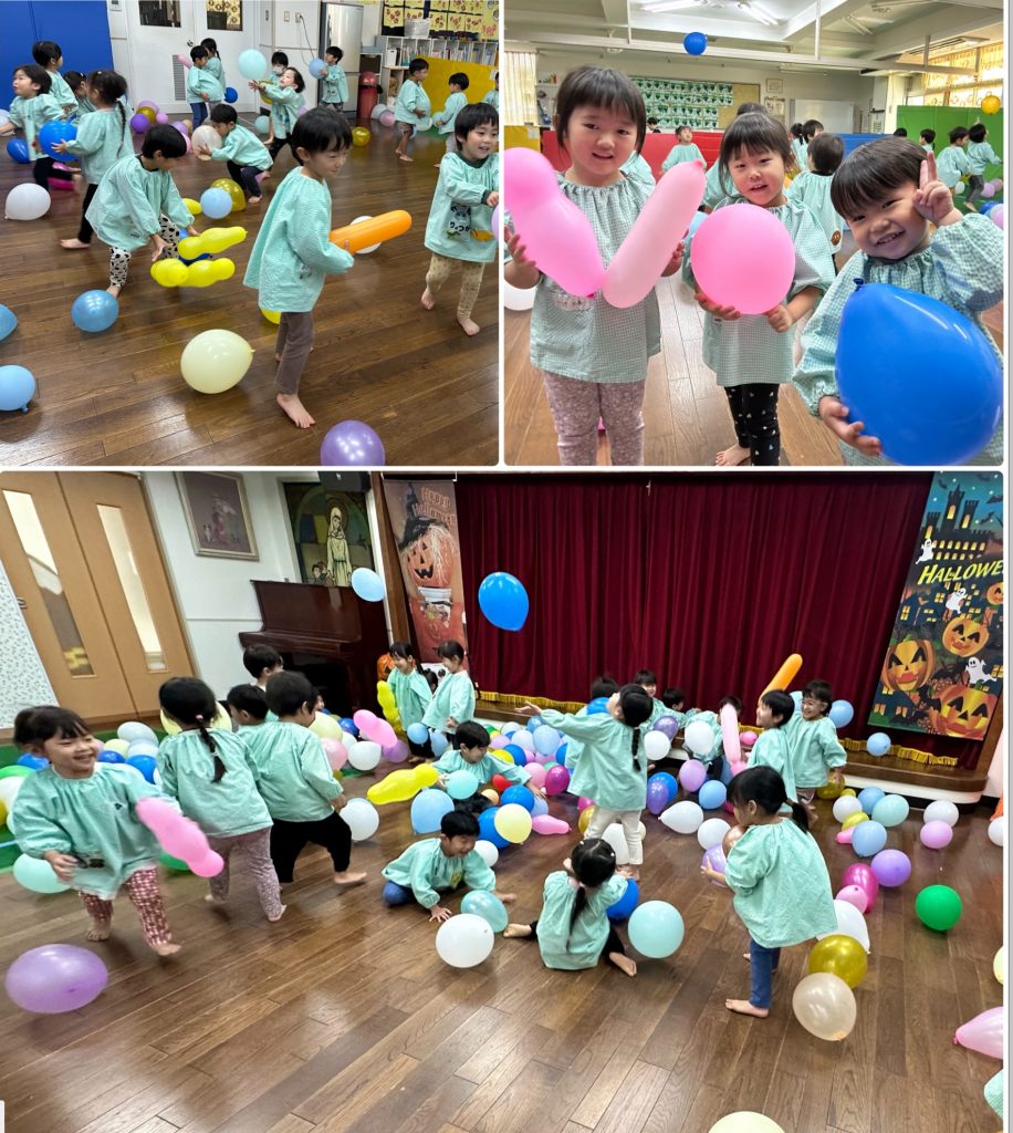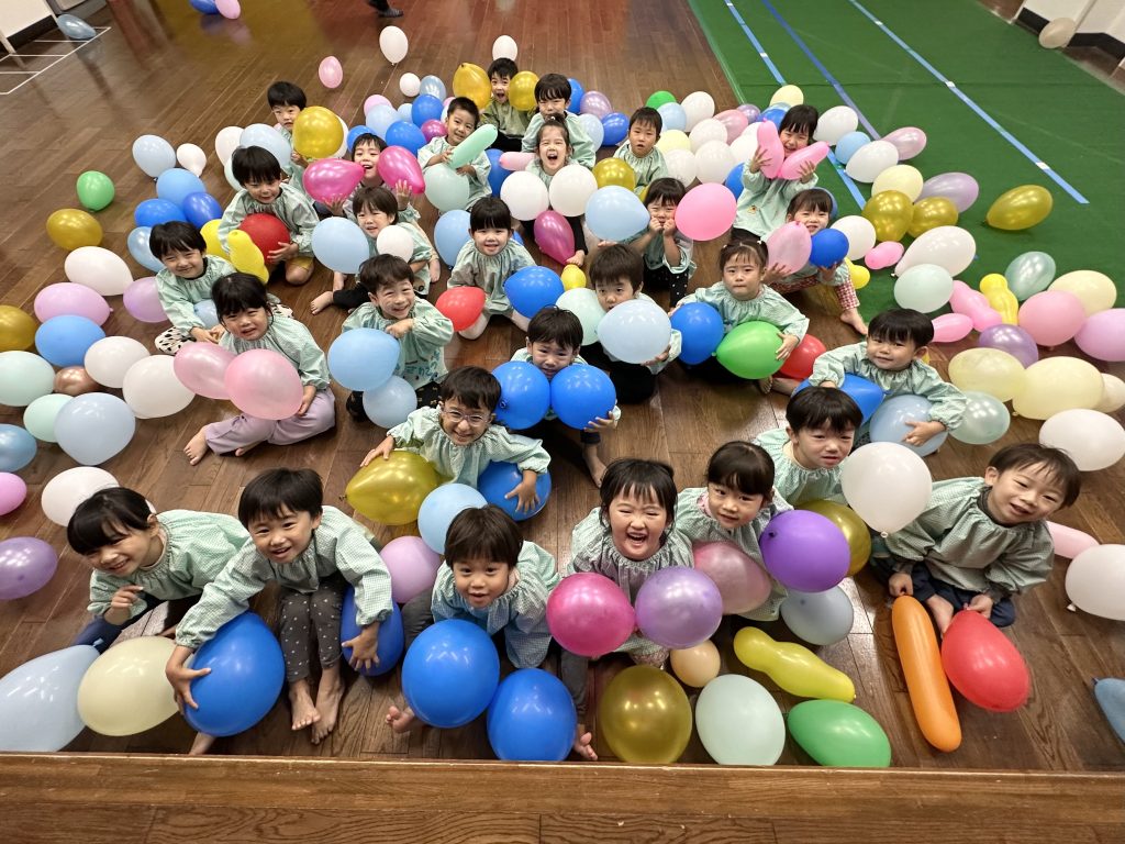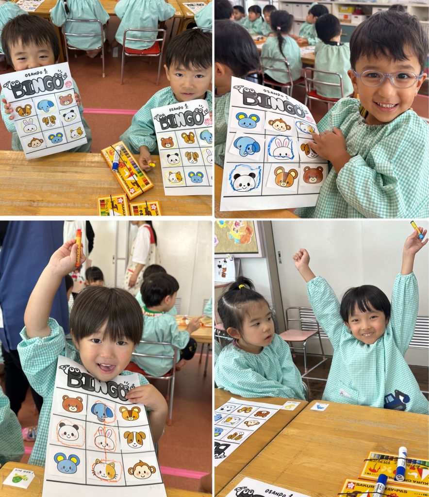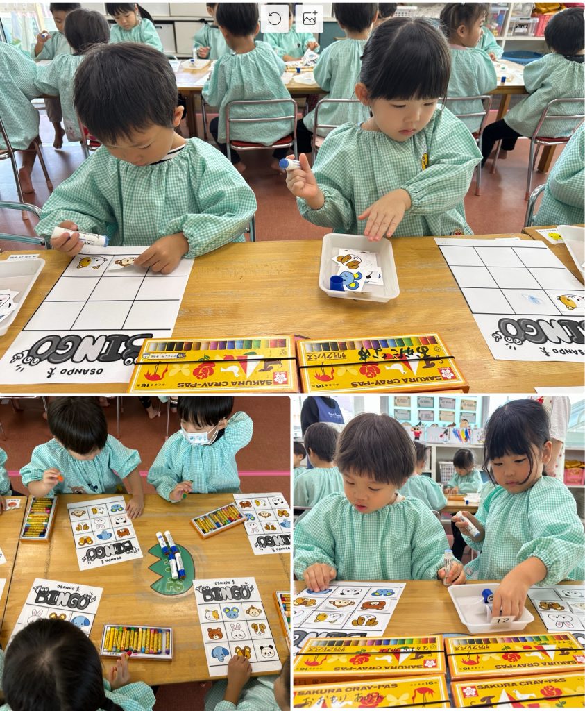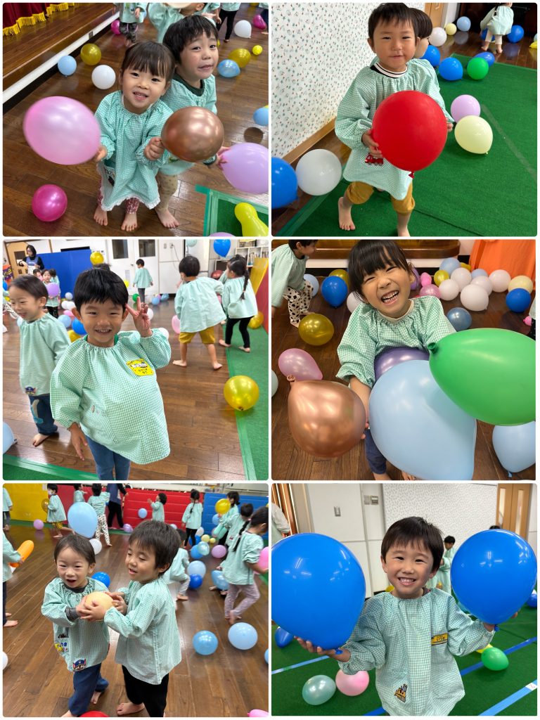 ちゅうりっぷ組がマイク先生と先月行ったビンゴゲームに再チャレンジ、備後ゲームを制作して、モネ先生が出した絵カードと会っていればチェック☑️3つ並んだらビンゴです、三つ並べる!縦・横・斜め、絵を合わせる!ルールを理解して楽しんでいます。ホールでは先日西部体育館でいただいた風船で大はしゃぎです。ホール一面の風船で体をいっぱい動かしました。