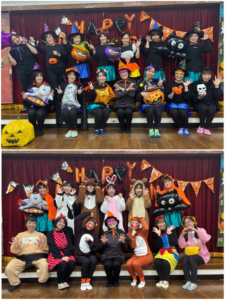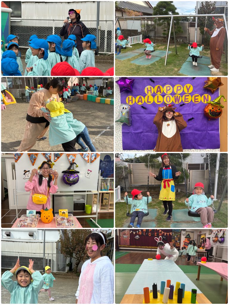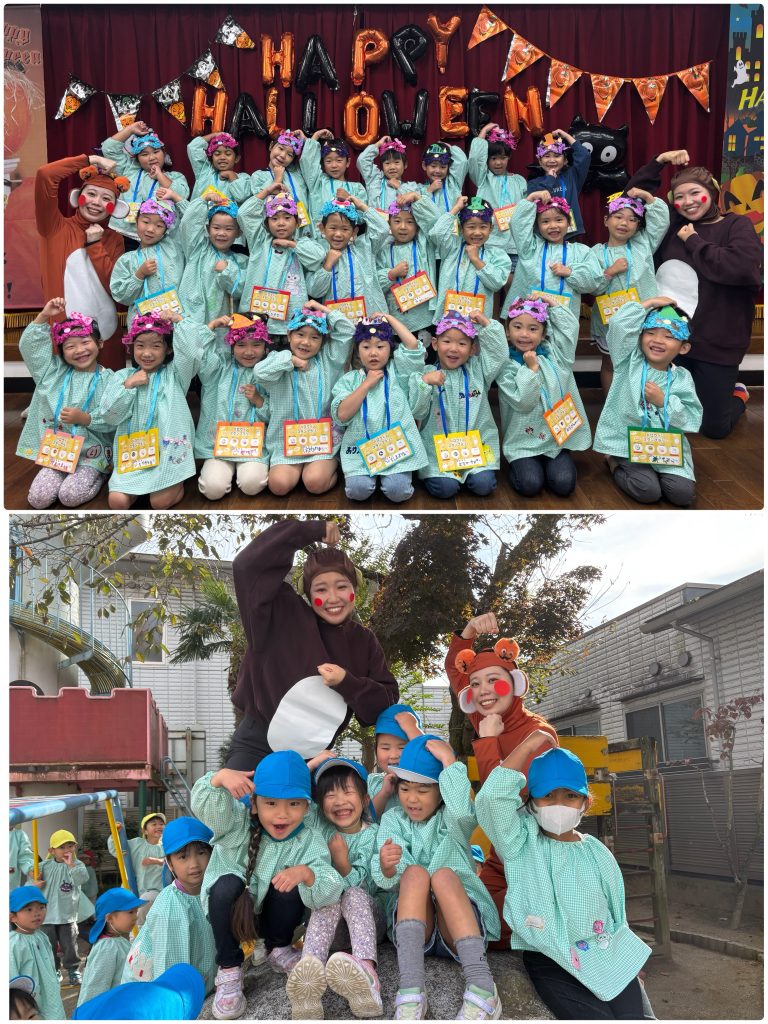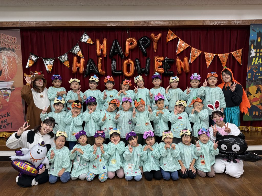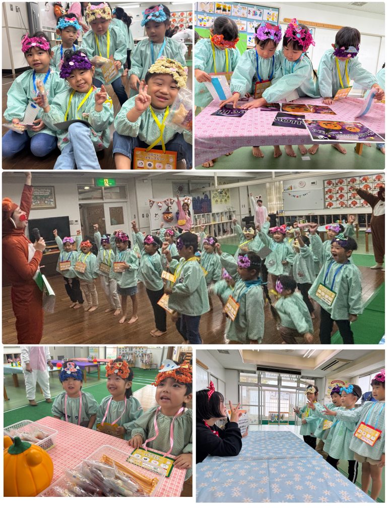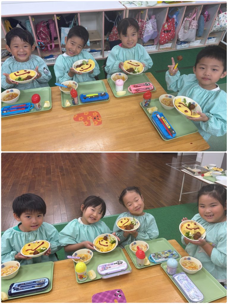 たんぽぽ・まつ組は家族でスタンプラリーにチャレンジしました。先生方が出すクイズや質問に答えてスタンプを集めて、合言葉を言ってお菓子をもらいました。給食はオムライスです。先生達も今日は仮装をしてわくわくで過ごしました。