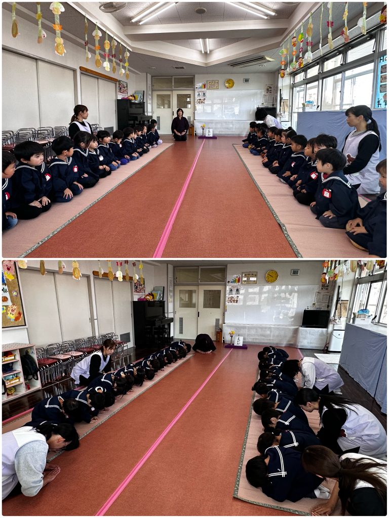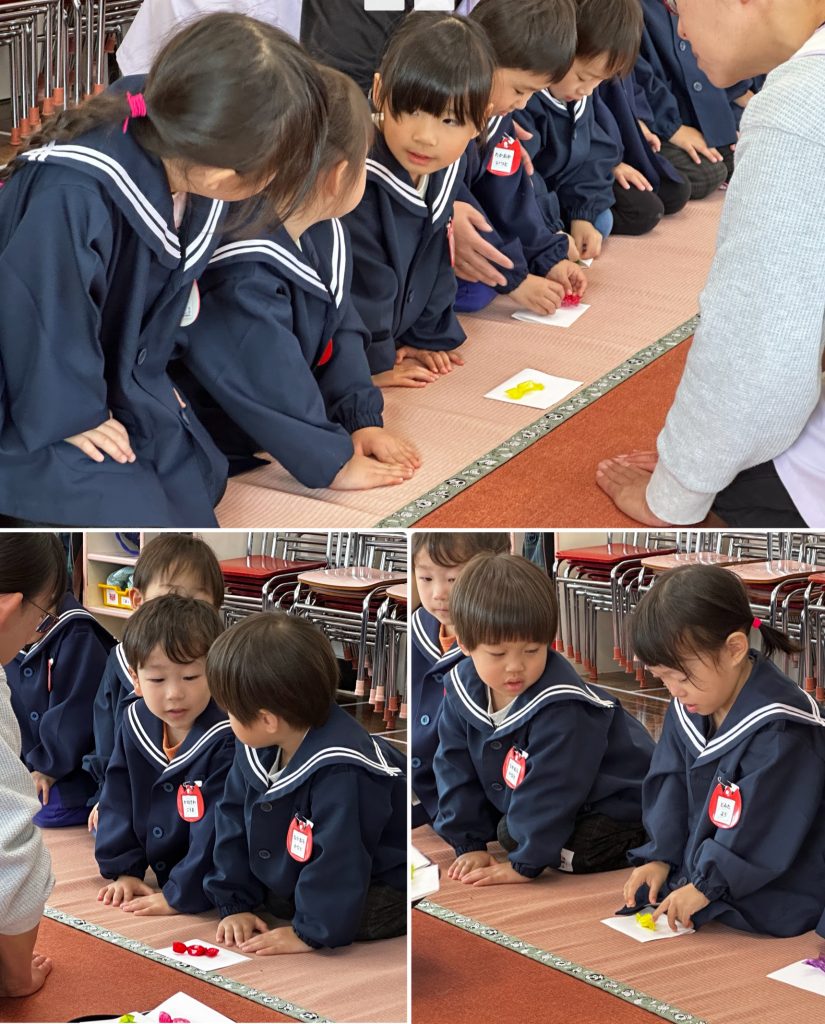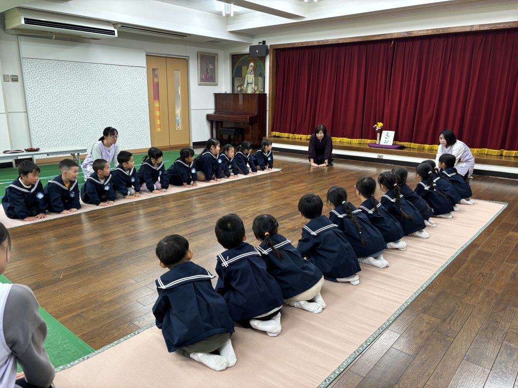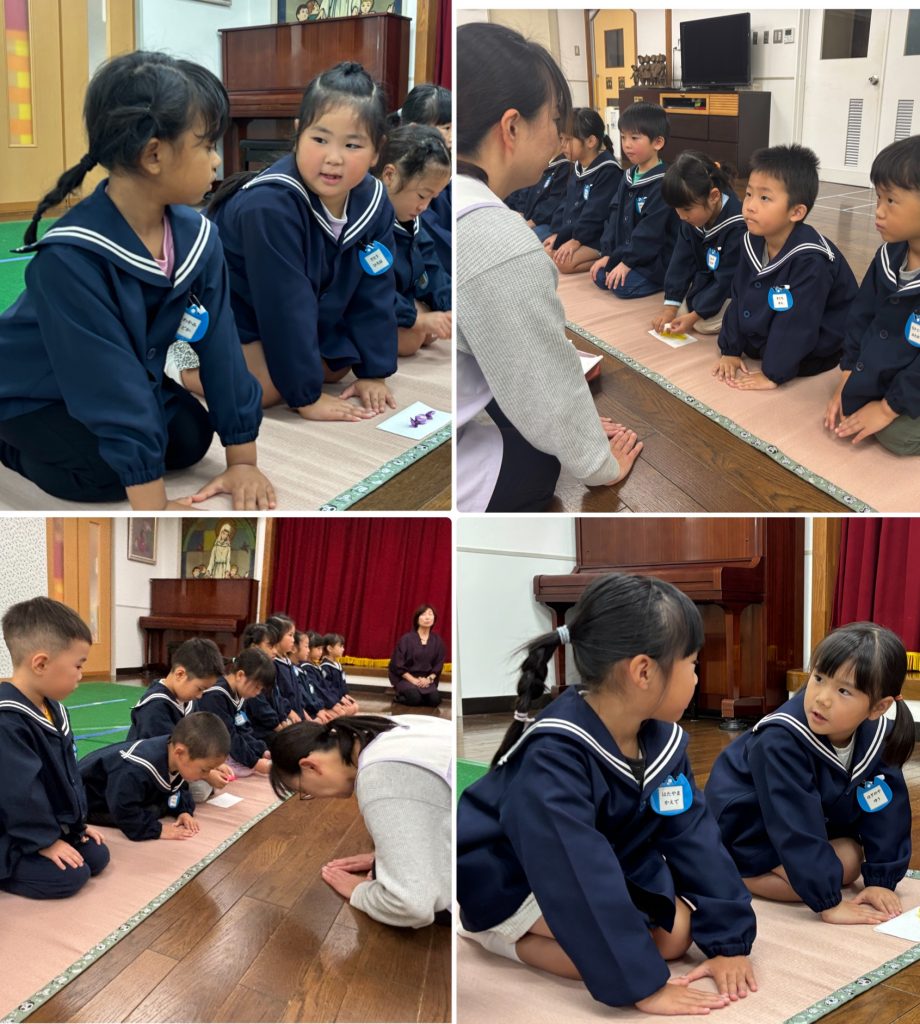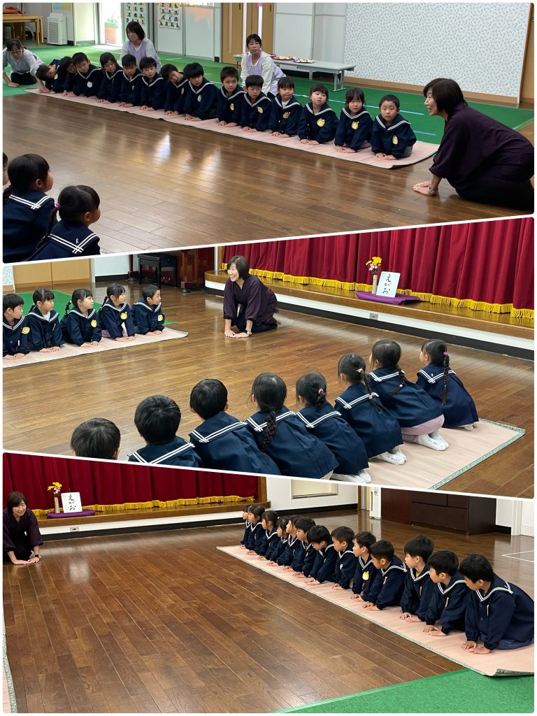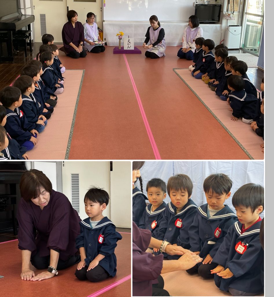 今年度2回目のお作法の会です。姿勢を正して・指先を揃えて・静かな心で過ごします。お菓子をいただく時の挨拶・汚さないように懐紙を使い、ゴミは懐に持ち帰ります。小さい時から周りへの気配りを身につけ、気持ちよく過ごせるよう仕草を自然に身に付けます。たんぽぽ・まつ組はとても上手に静かな時間を過ごせました。積み重ねです、1年目のモネ先生が驚いていました。ちゅうりっぷ組も一つ一つ身につけていきましょう。