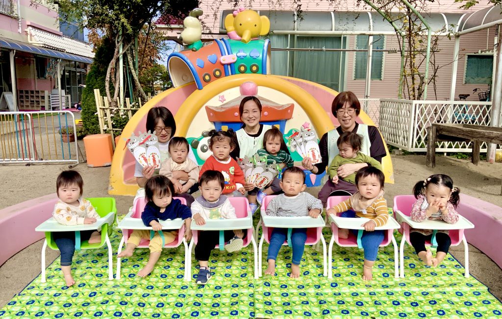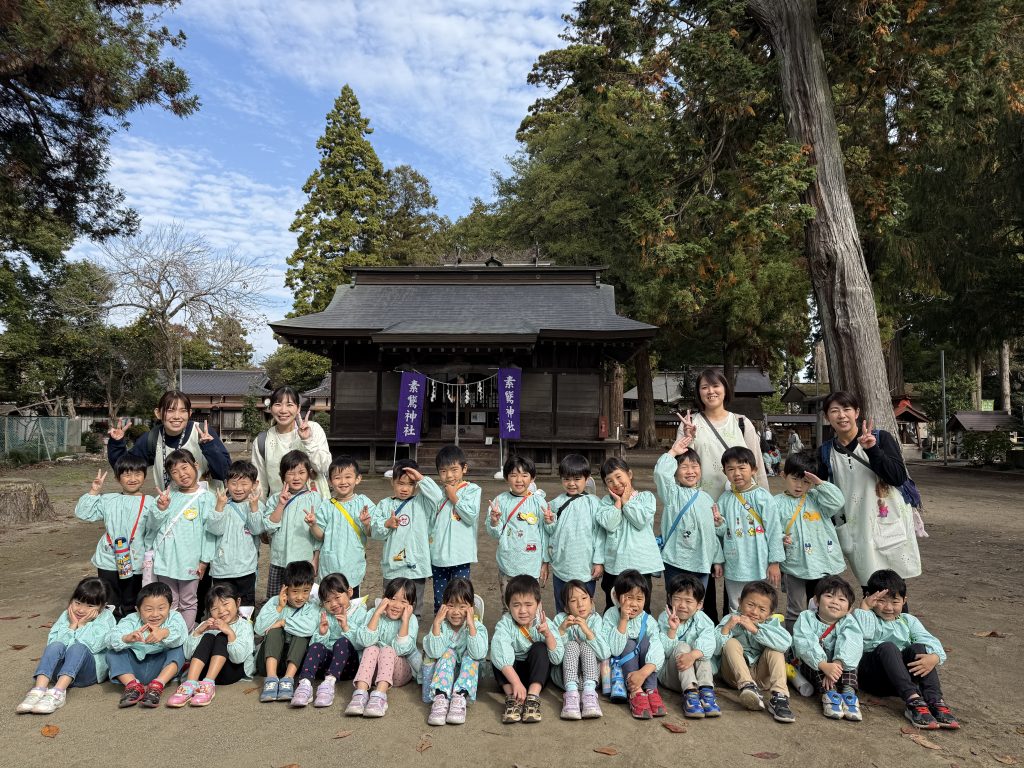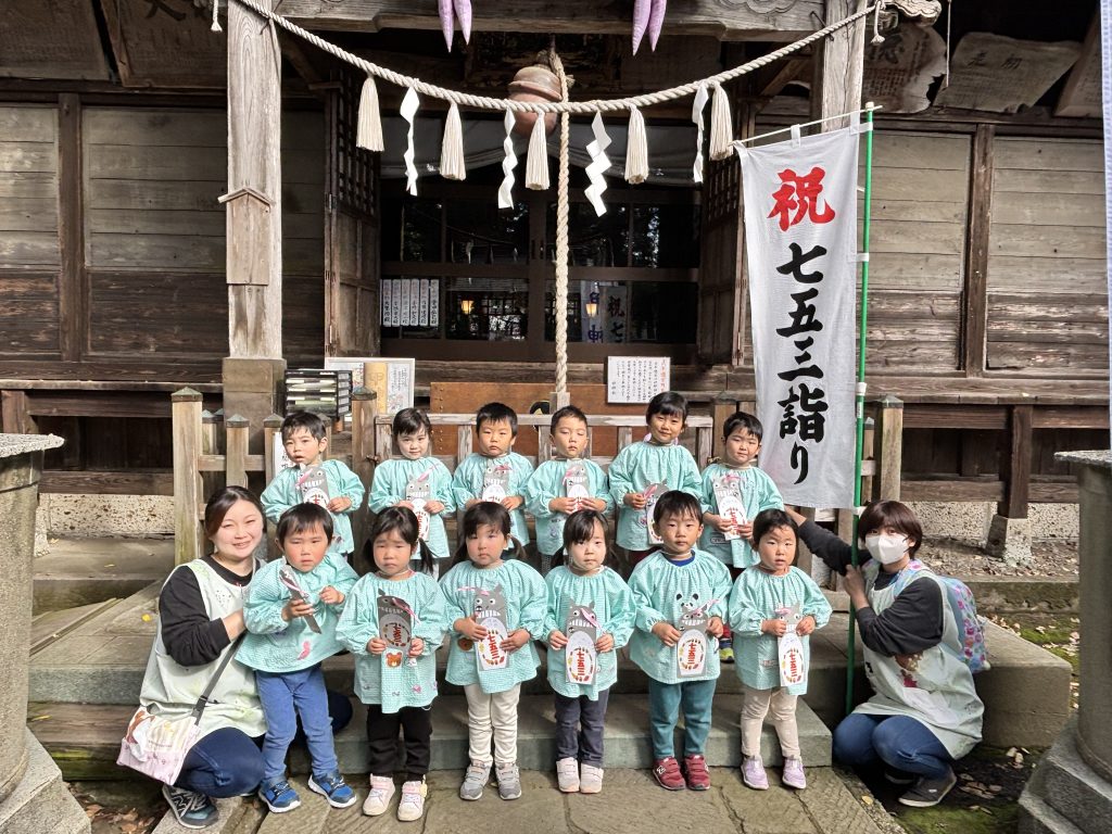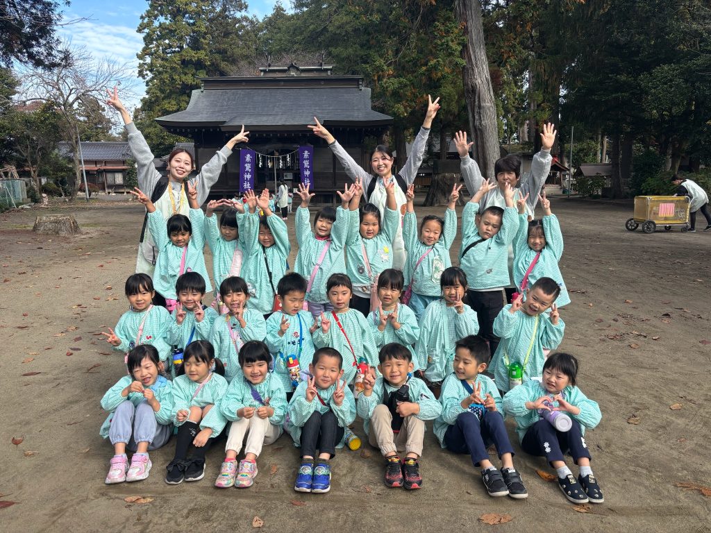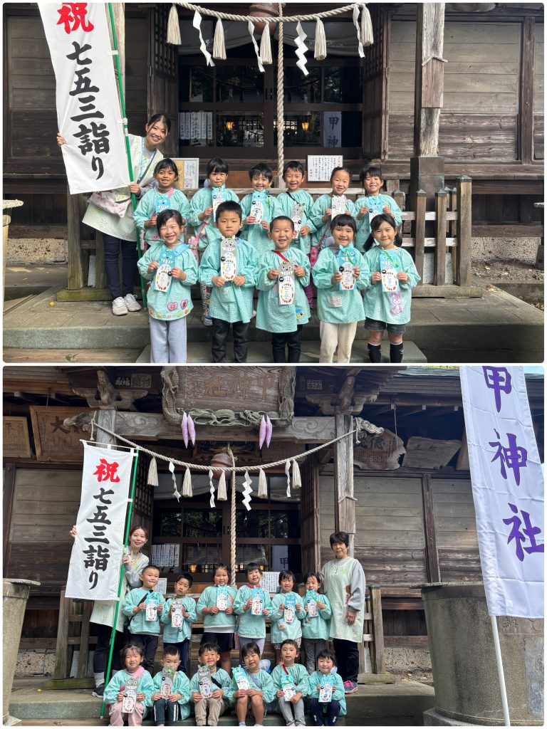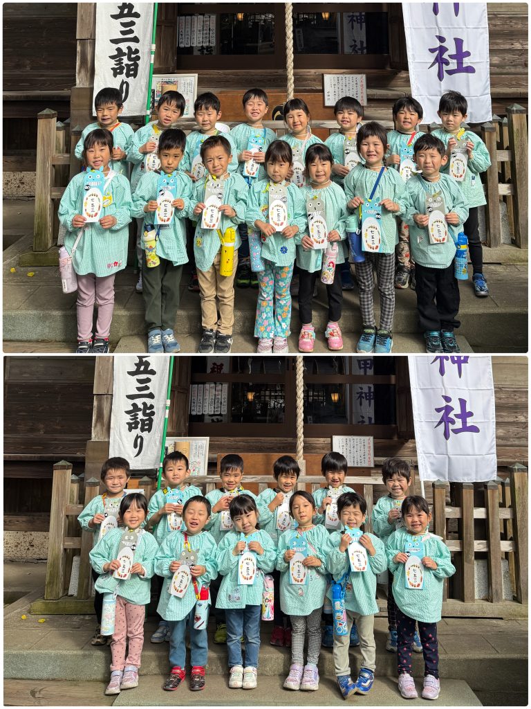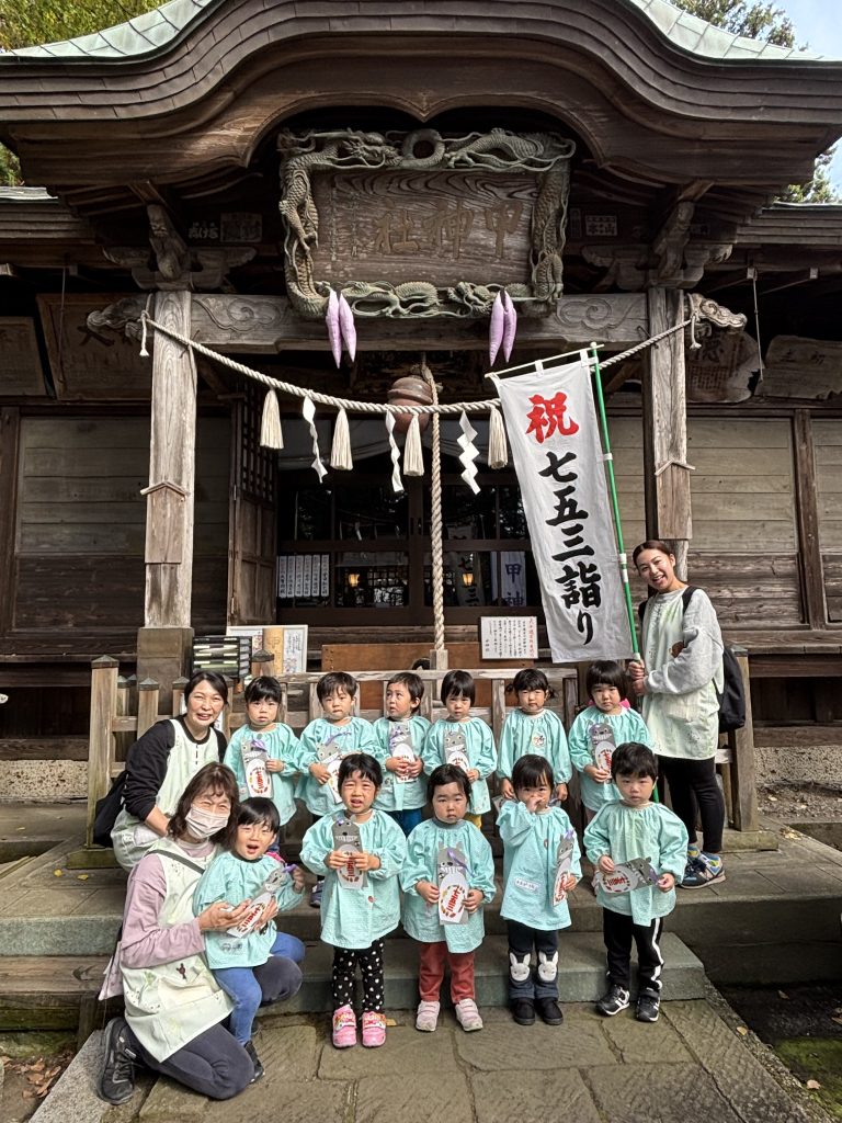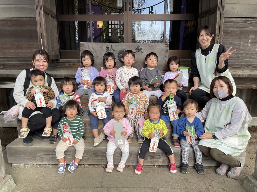 昨日甲神社に七五三のお参りに行ってきました。すずらん組以外はばら・ふじ組は保育園バスで、ちゅうりっぷ組はまつ組と手をつないで、歩いて行きました。もちろんたんぽぽ組も歩いて行きました。信号も渡って、大宮小学校の校庭を通って行きました。甲神社には宮司さんは留守でしたが、お賽銭を持って「病気をしないで健康で過ごせますように」と手を合わせてきました。昨日の甲神社の賑やかなこと、保育園は午前中、すずらん組しかいなくてとても静かで寂しい時間でした。神社では内藤さん・富田さんのおじいさんも様子を見にきてくれました。みんな手作り千歳袋を持って記念撮影です。