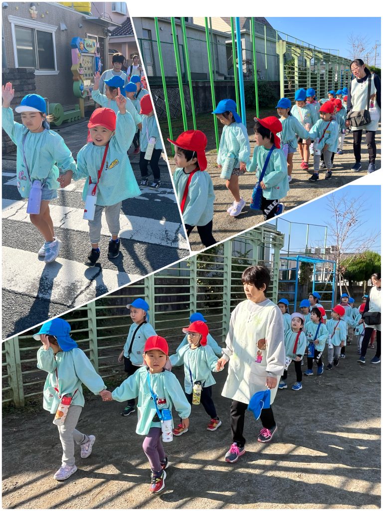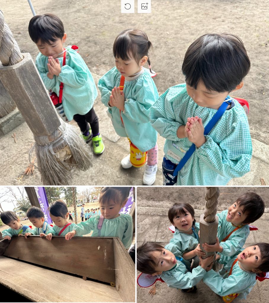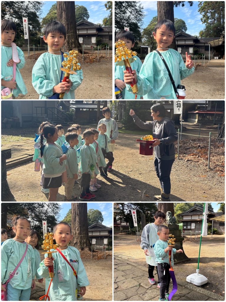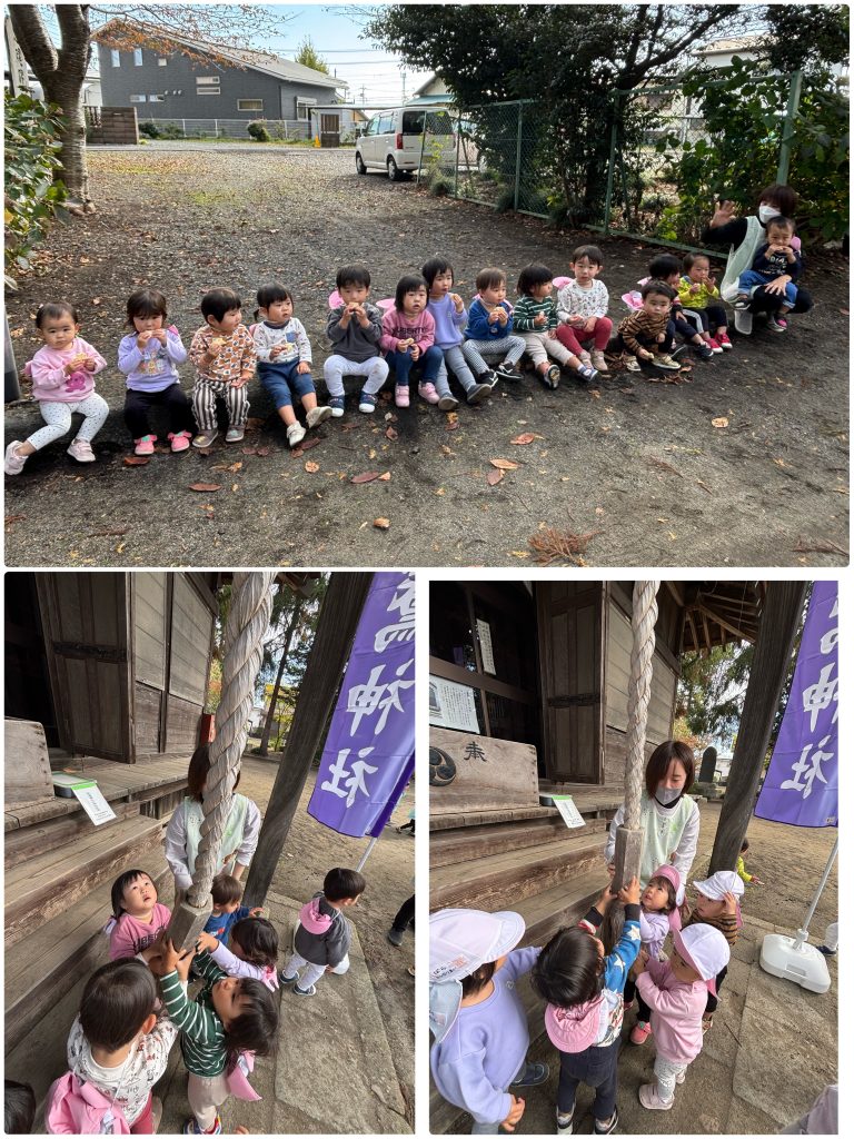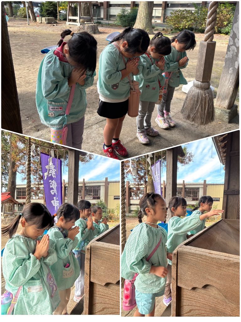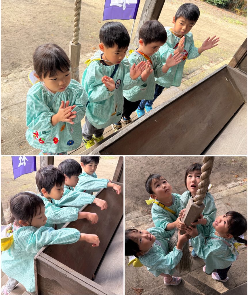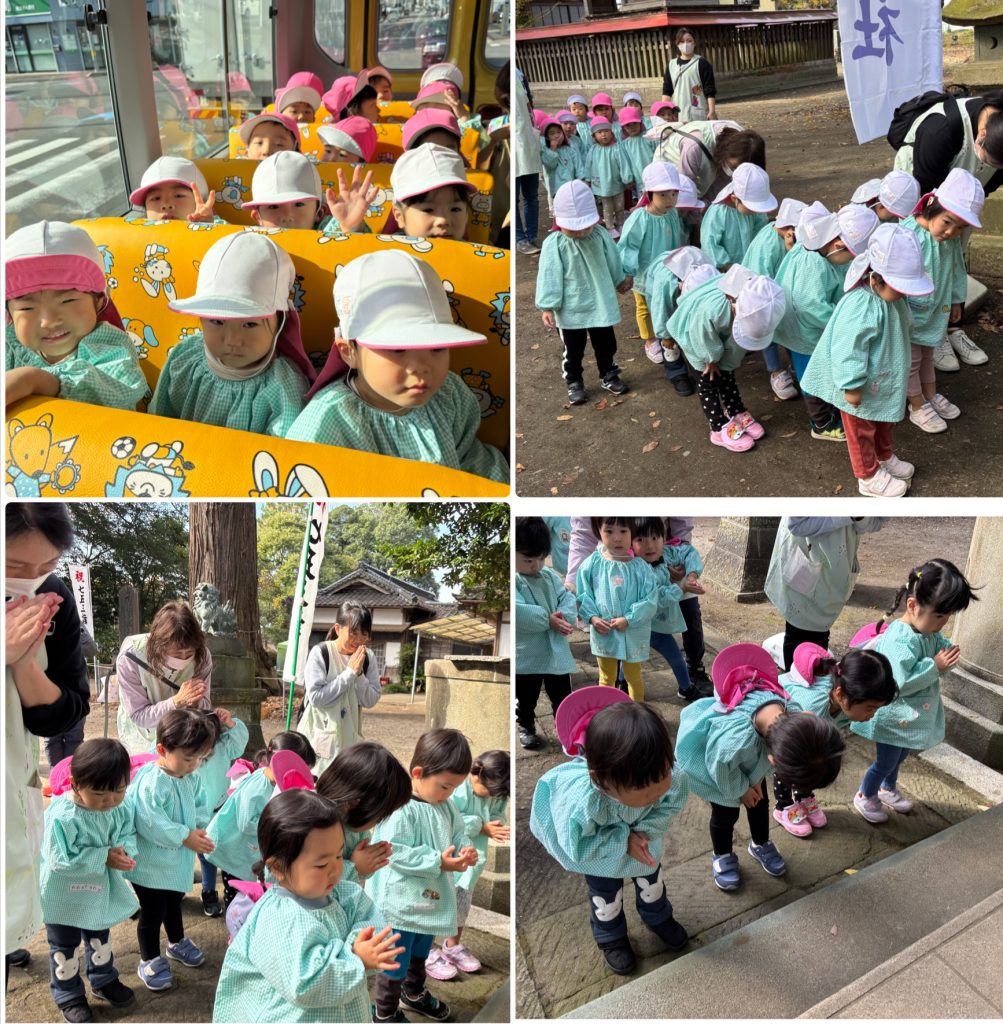 各クラス甲神社でお参りをしました。お賽銭を投げて二礼二拍手一礼「健康で過ごせますように」と真剣に拝んでいました。まつ組は「神楽鈴」を振らせていただきました。邪気を祓い神様への願いを届ける鈴です。小さいクラスは「お願いします」と言って手作り切符を渡してバス乗車もできました。ちゅうりっぷ組はまつ組と手を繋いで、安全に歩いて行くことができました。色んな体験ができた素敵な1日になりました。