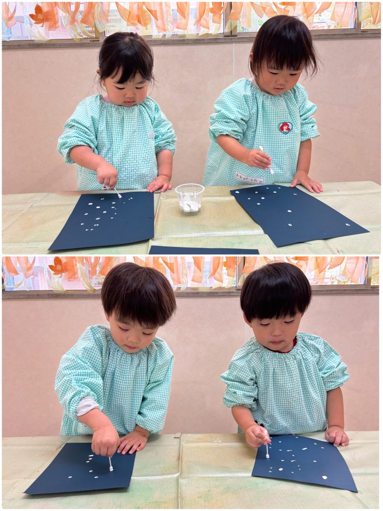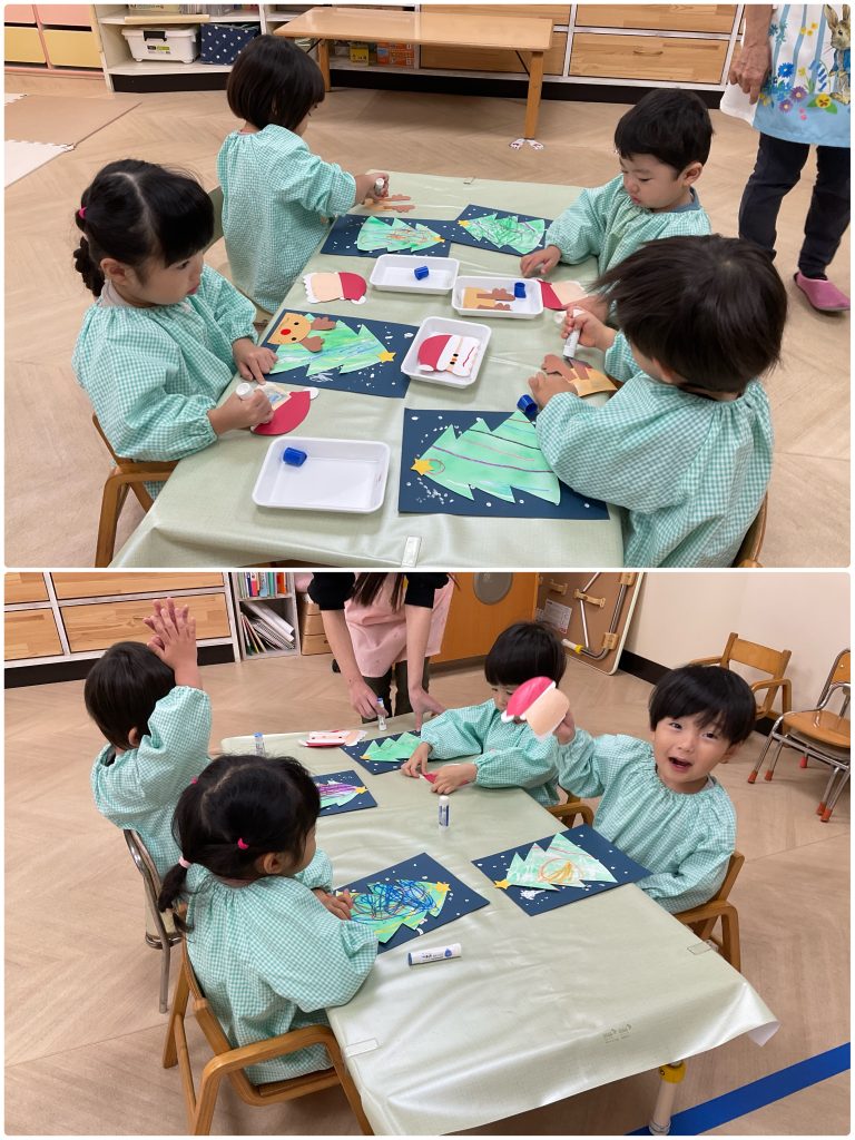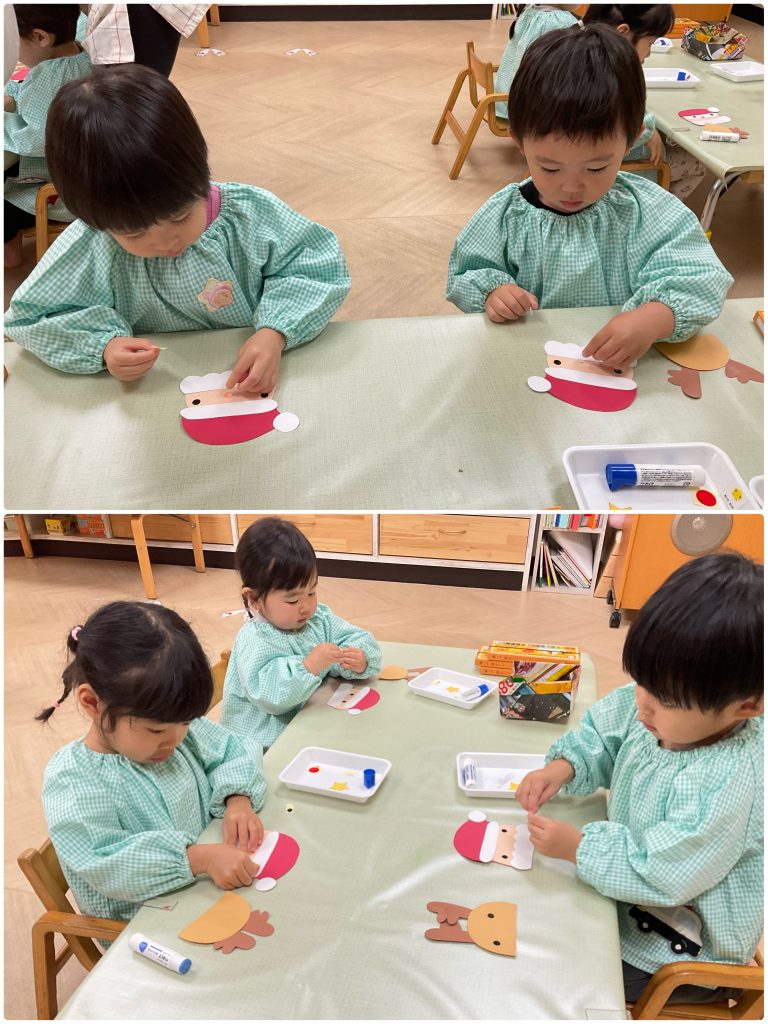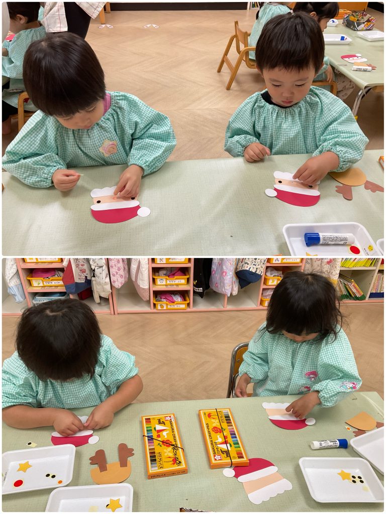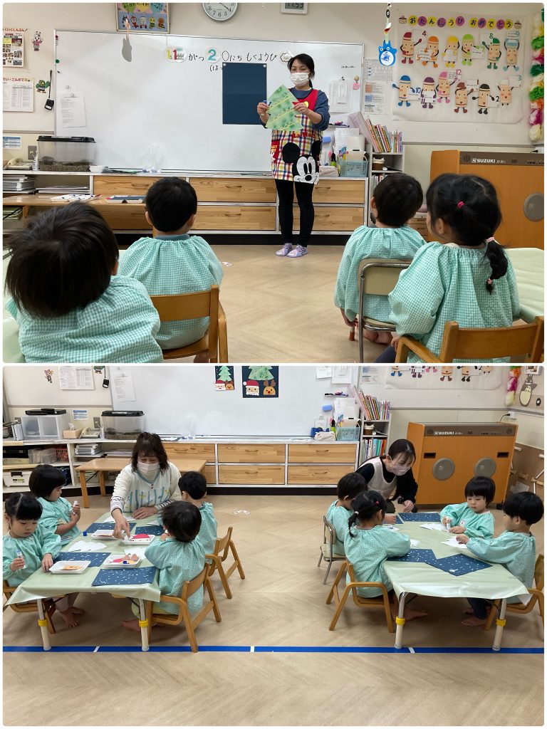 製作が大好きなふじくみです。クリスマスに向けて集中している色んな技法で製作活動を行います。小さくても先生の説明を聞きながら手先を動かしています。雪だるま・サンタクロース・麺棒で雪降らし・カラフルスター🎅クリスマスが楽しみだね。