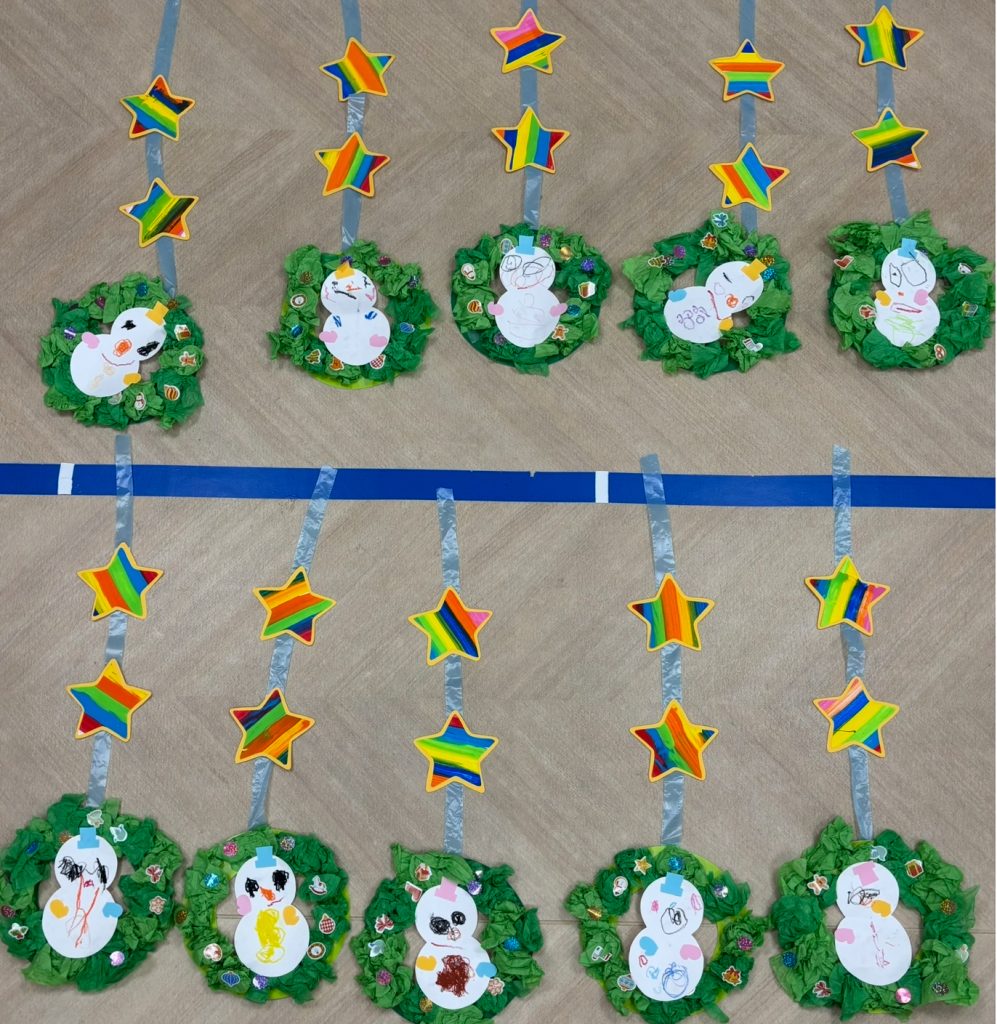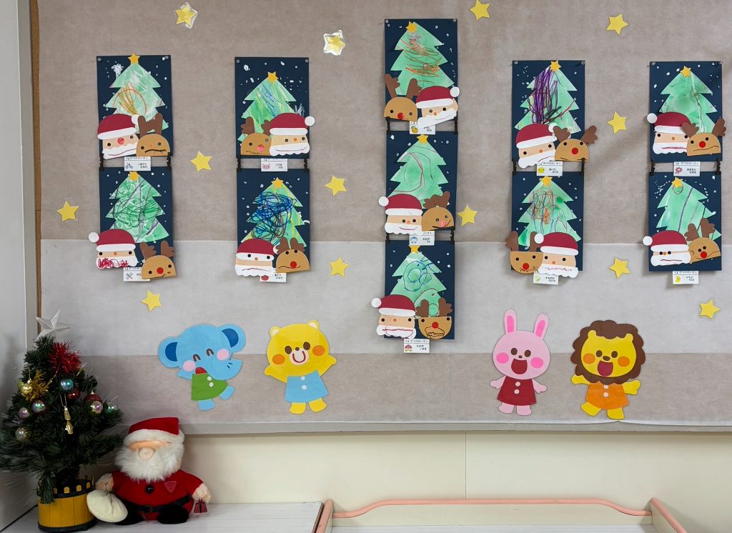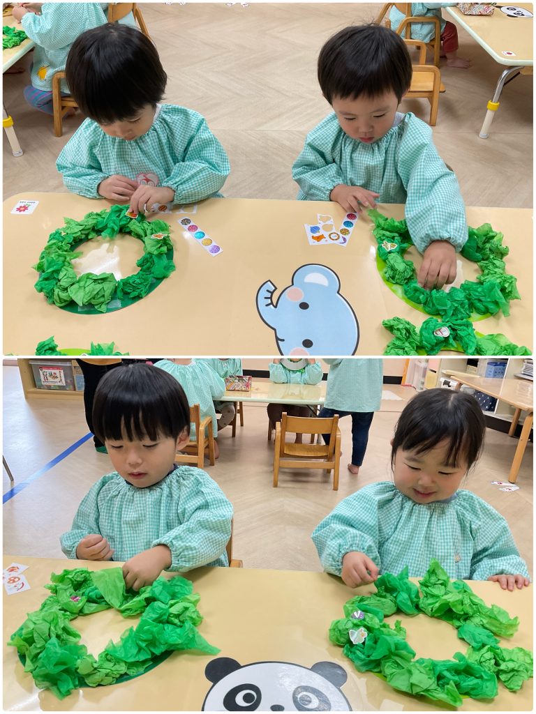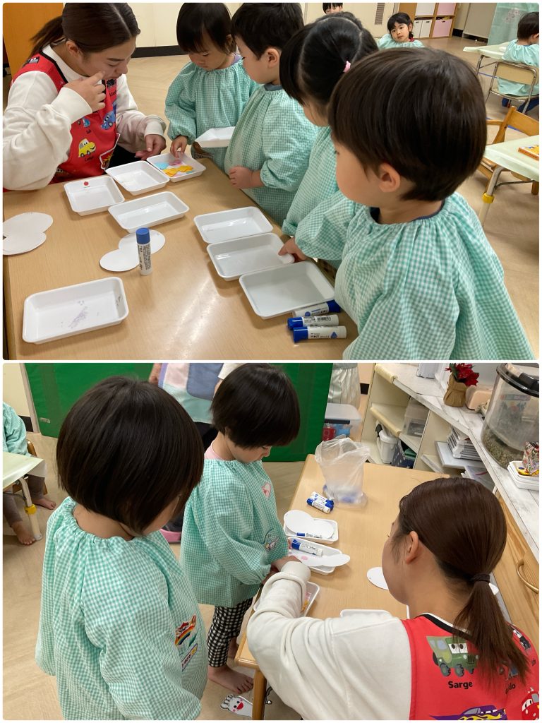 製作が大好きなふじくみです。クリスマスに向けて集中している色んな技法で製作活動を行います。小さくても先生の説明を聞きながら手先を動かしています。雪だるま・サンタクロース・麺棒で雪降らし・カラフルスター🎅クリスマスが楽しみだね。