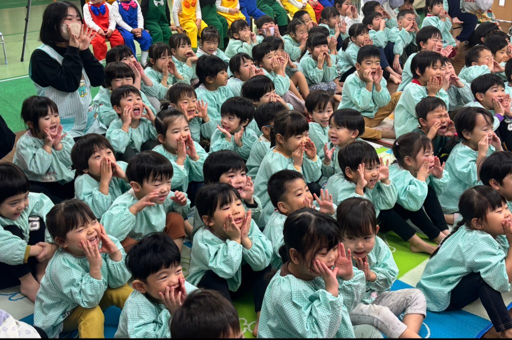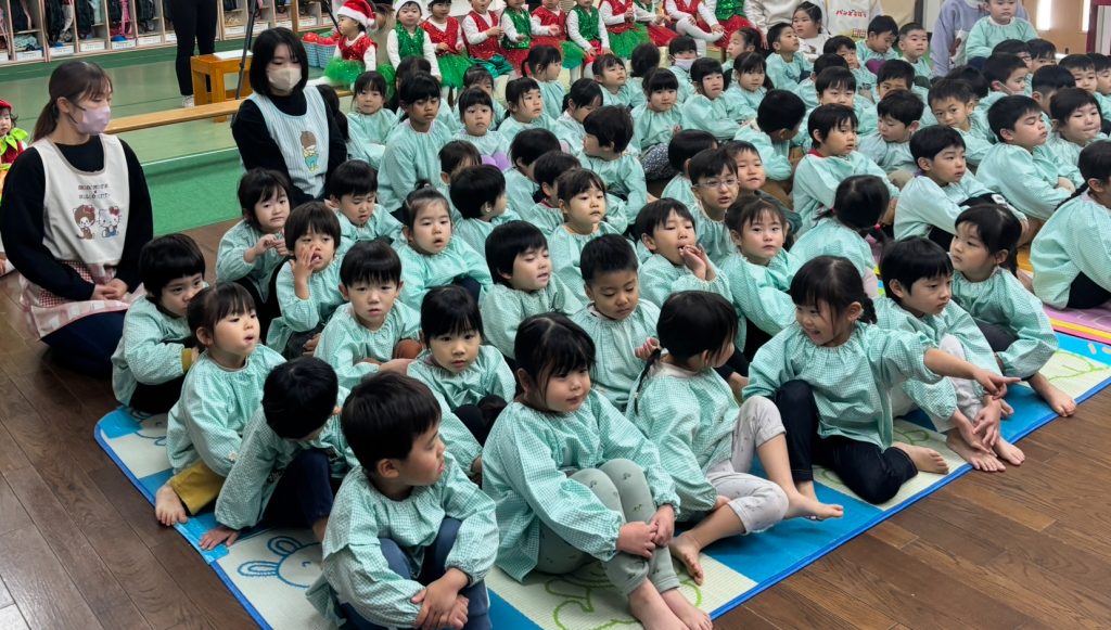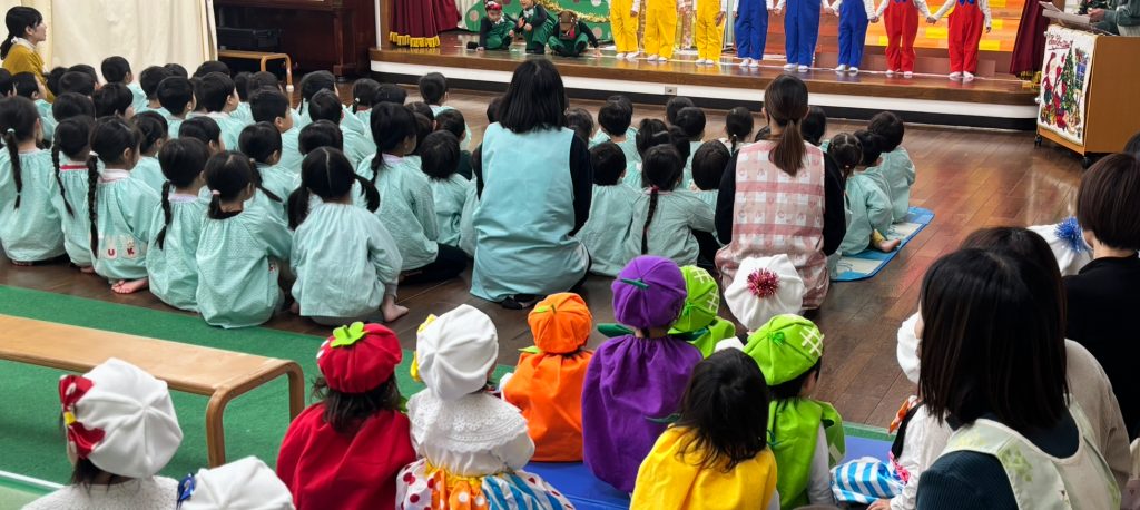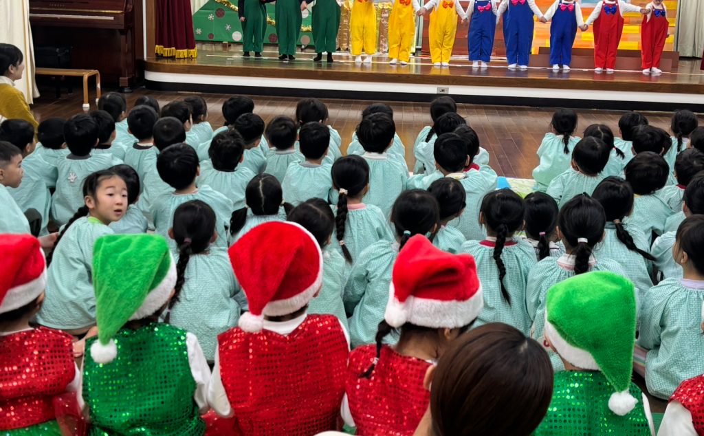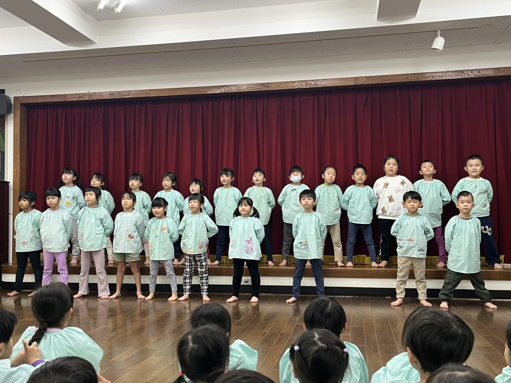 昨日は未満児クラスの一斉練習です。19日のクリスマス発表会に向けて衣装をつけて以上児クラスのお友達がお客さんになって、本番のように発表の練習をしました。ばら組のお友達も衣装をちゃんと着て泣かずにステージに立つことができています。ふじ・もも組が発表している時もよーく発表を見ていました。音楽やダンスが大好きのようです。当日をお楽しみに、以上組も「頑張れー・かわいいー・かっこいい」と応援してくれました。自分がしてもらって嬉しいことを下のお友達にもやっている子供たちが素敵だなーと再確認できました。パパ・まま本番では大きい声で応援お願いします。
