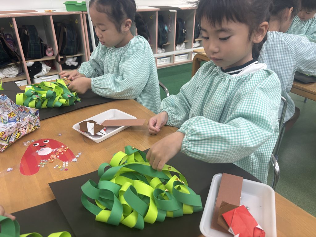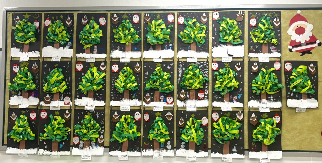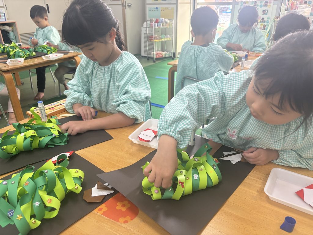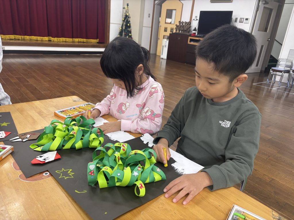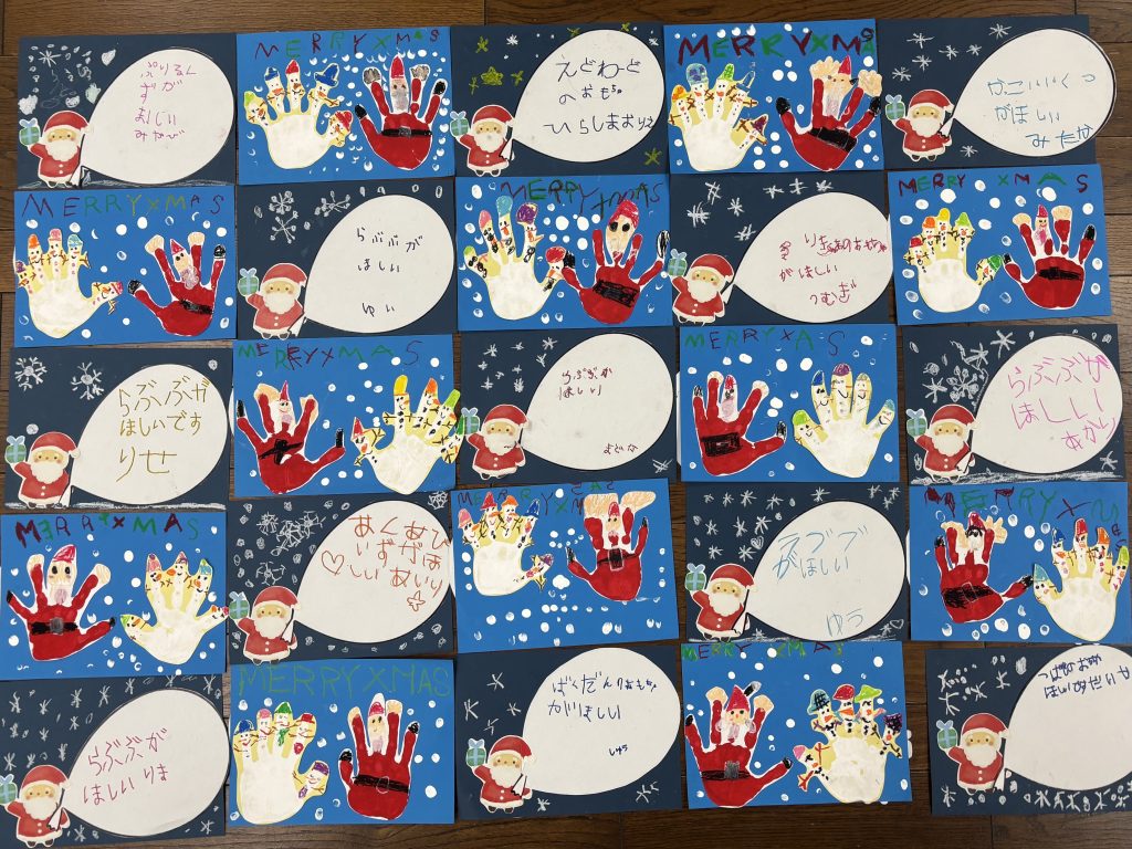細長の緑の紙を長さを揃えて切りました、絡めながら糊付けができたら、かわいいシールを貼って飾ります、さすがまつ組、立体的にかっこいいツリーです。 自分の手をなぞって、サンタとスノーマンでプレゼントの欲しい物を書いてカードをつくしました。願いが叶いますように。