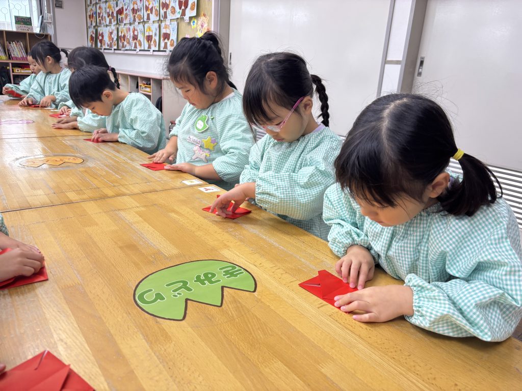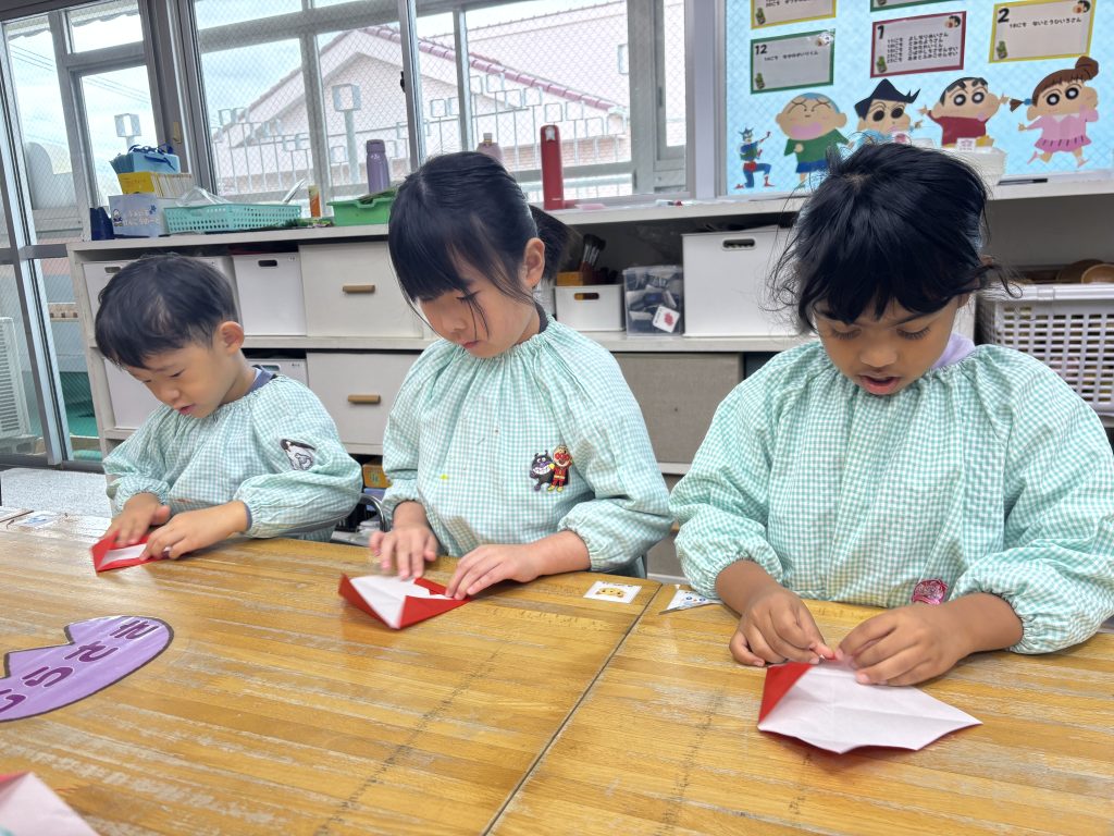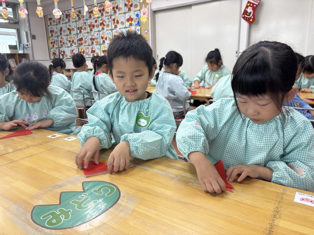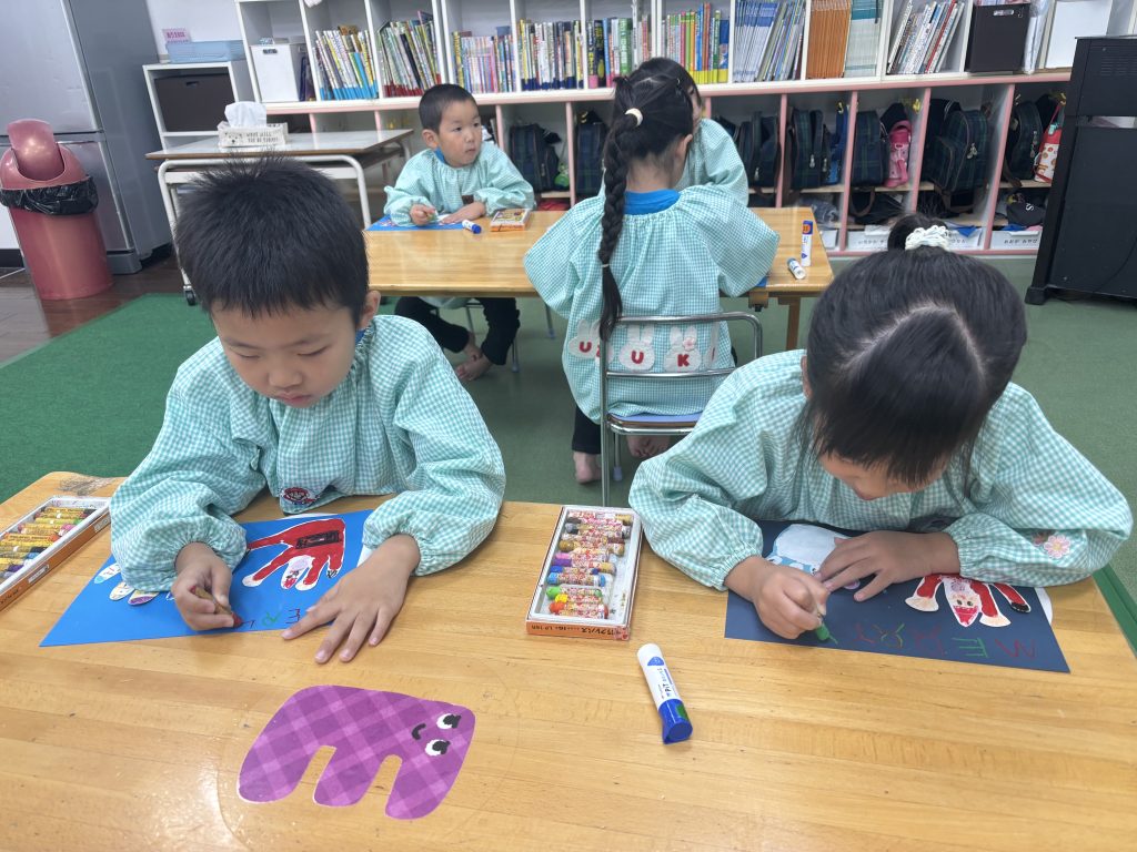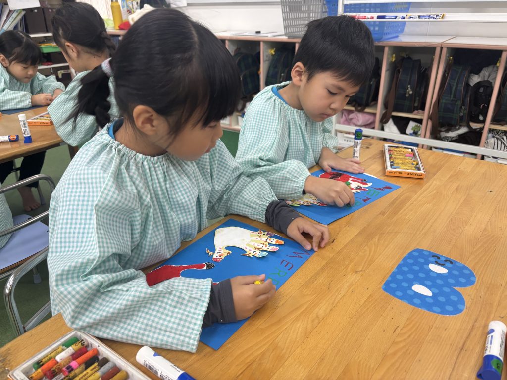 細長の緑の紙を長さを揃えて切りました、絡めながら糊付けができたら、かわいいシールを貼って飾ります、さすがまつ組、立体的にかっこいいツリーです。 自分の手をなぞって、サンタとスノーマンでプレゼントの欲しい物を書いてカードをつくしました。願いが叶いますように。