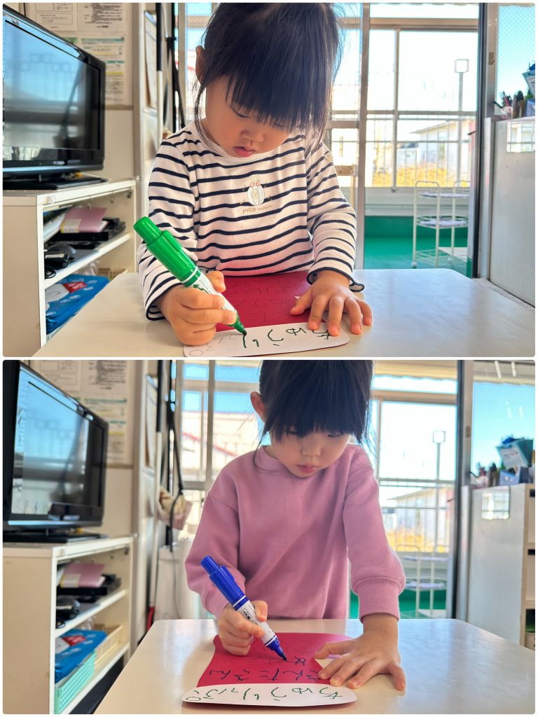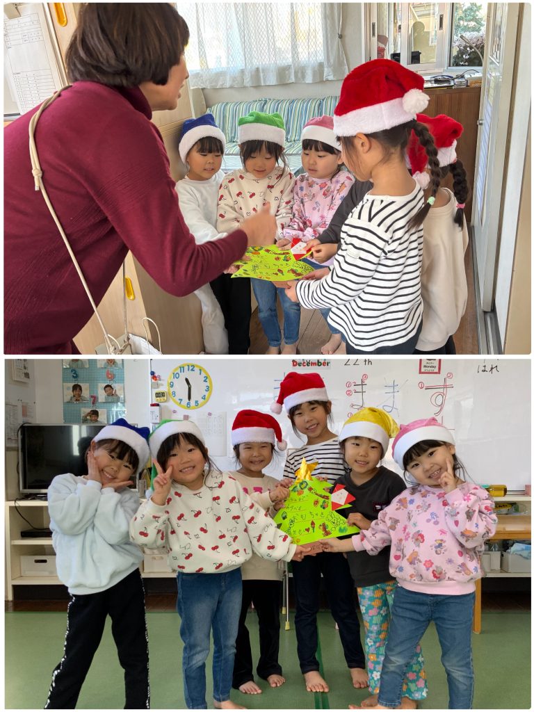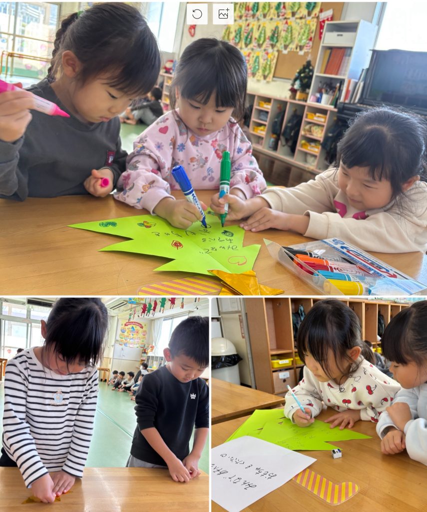 25日の朝にプレゼントが届きますように、クラスみんなで考えてお願いのカードを描きました。園長先生がサンタさんに届けてくれます。よろしくお願いしますとお願いしました!!「たんぽぽ組はみんなで遊べるゲームです」に園長先生が「何人で遊べるゲームですか」と尋ねると女子ーズで、長時間の会議を、「男の子は喧嘩するよね」「多すぎても・・・」「みんなで26人だから」「私は5人」「私は15人」・・・等々、10分くらい考えて出た結果が「11人で遊べるゲームお願いします」になりました。どう考えてその人数?子供達の素直な考え素敵ですね❤️プレゼントと届きますように