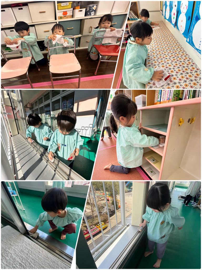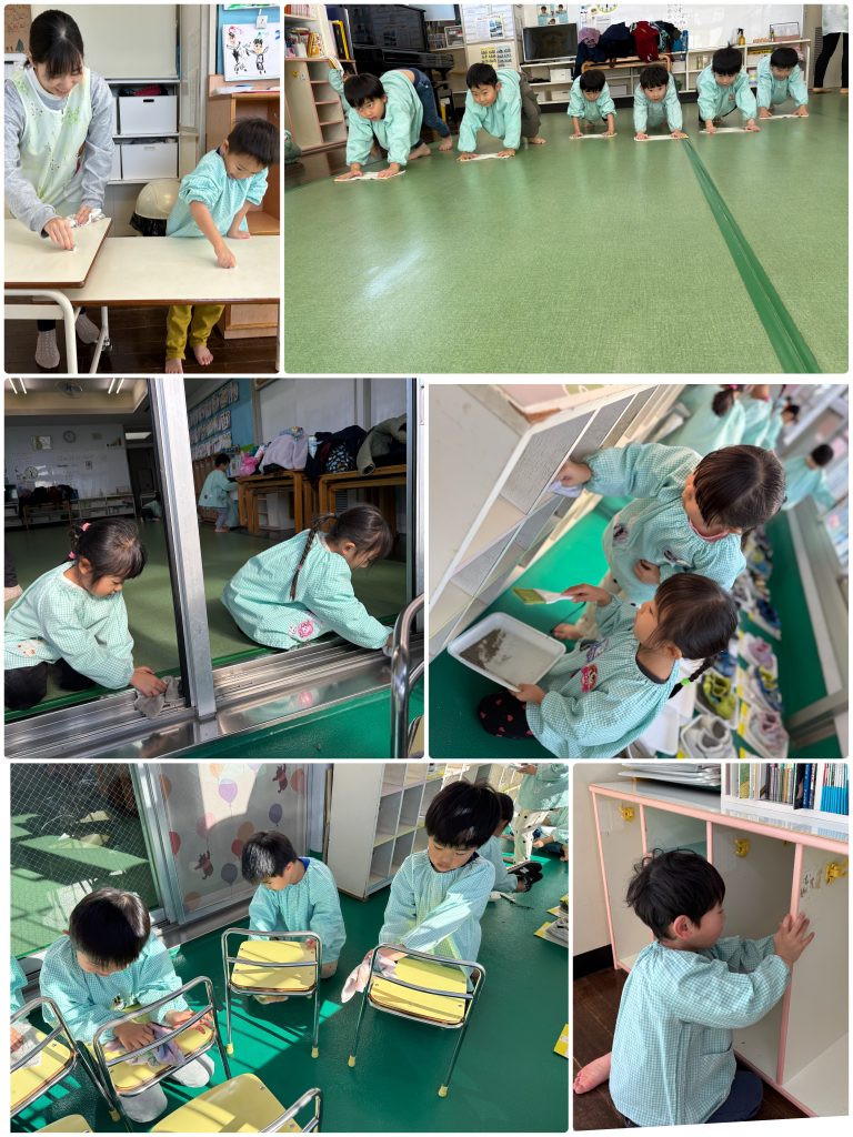 2025年も残りわずかとなりました。1年間お世話になった教室をみんなで綺麗にお掃除をしました。小さいクラスも床の雑巾掛け・椅子やロッカーも隅々まで綺麗に🧹できました。お家でもお手伝い頑張って新年を迎えることができたら嬉しいですね、2026年綺麗になった教室で新年5日からお待ちしています。