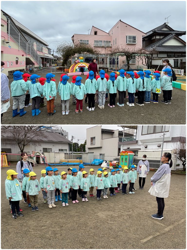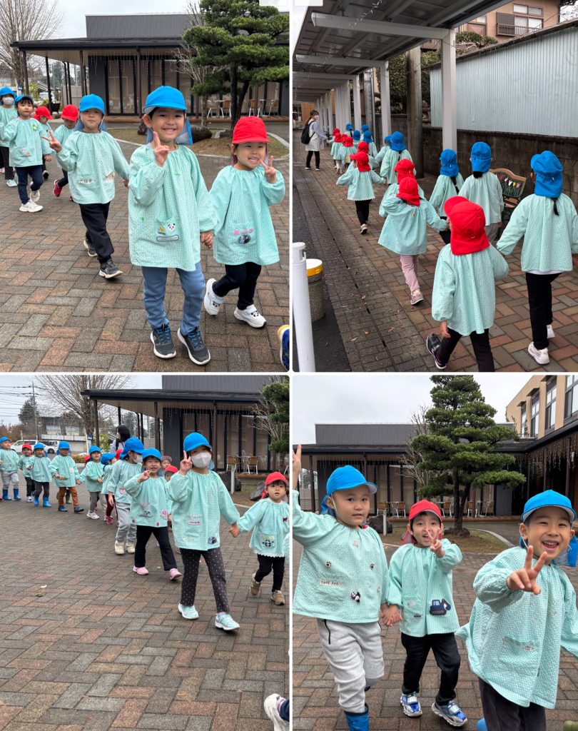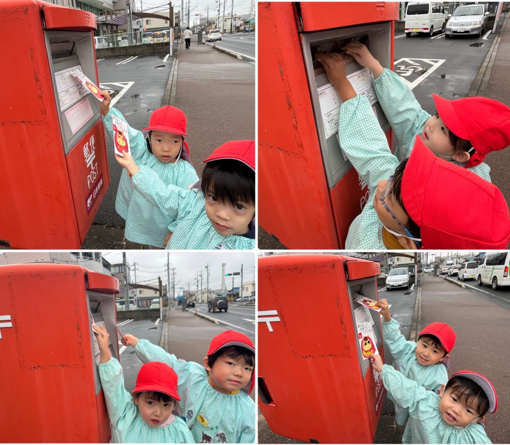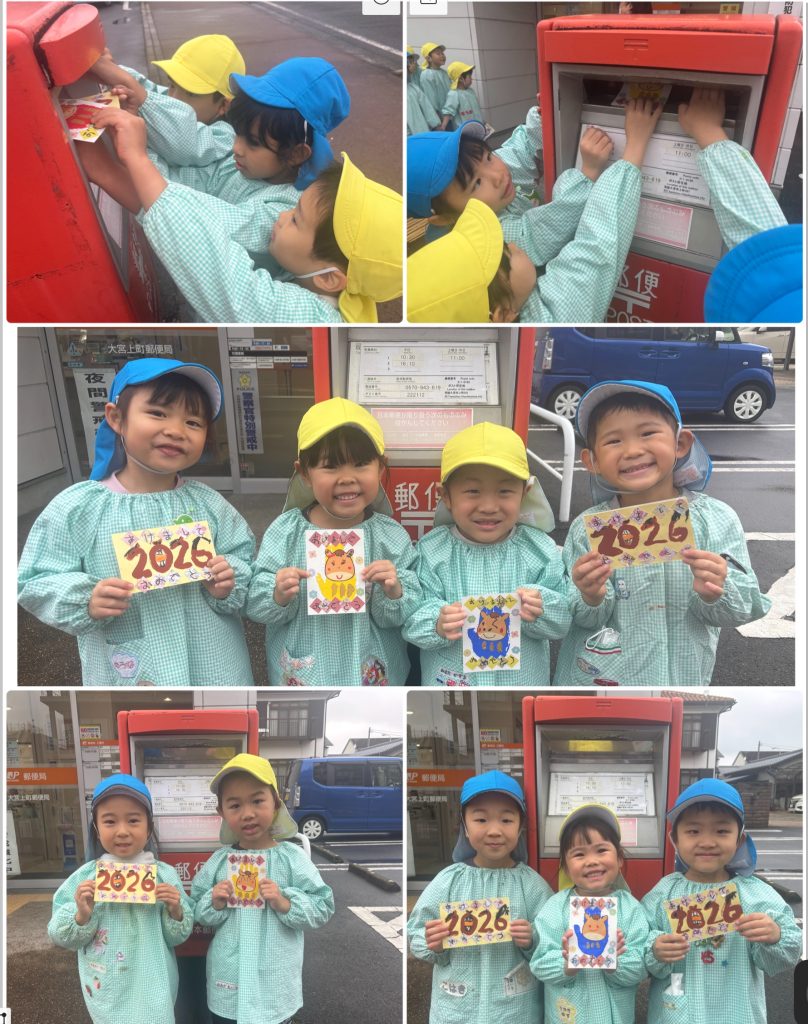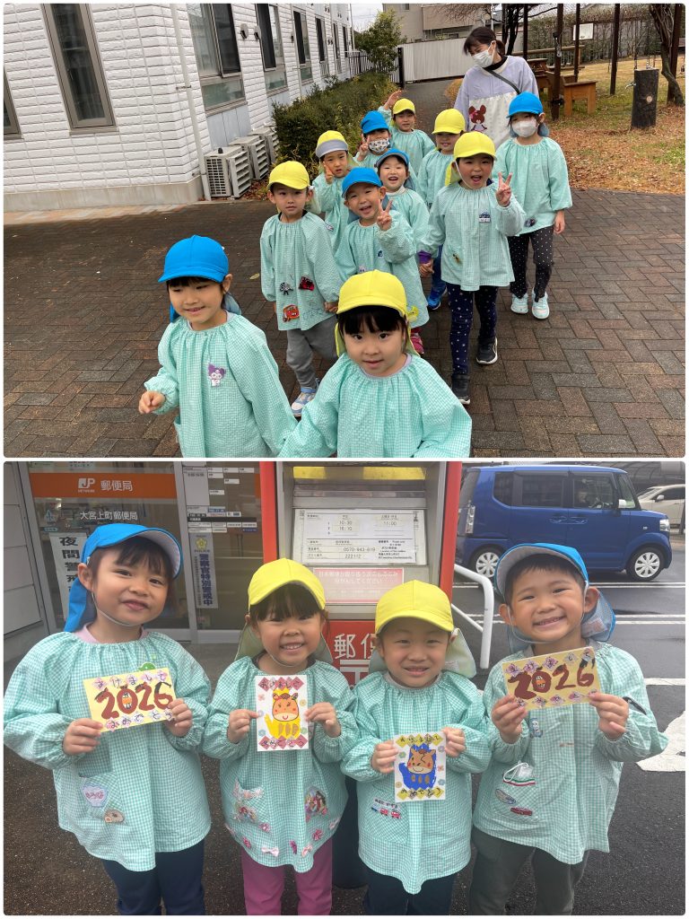 12月25日の家族の日に家族で年賀状を出しに郵便局へ行きました。フロイデ側から郵便局まで歩いて行きました。はじめに「転ばないで、車に気をつけて、事故のないように歩いてください」とお話を聞いて、家族と手を繋いで出発です。みんな自分で作ったハガキを出せるので、ニッコニコです。お正月にちゃんと届きますように🙏