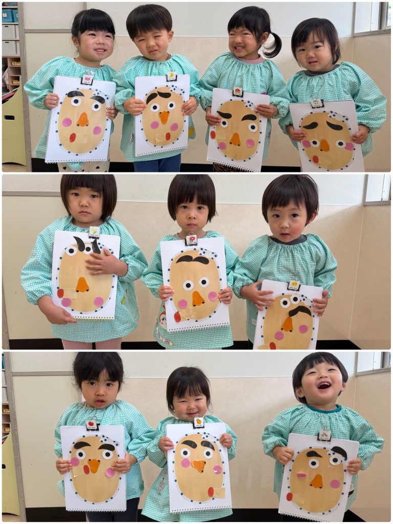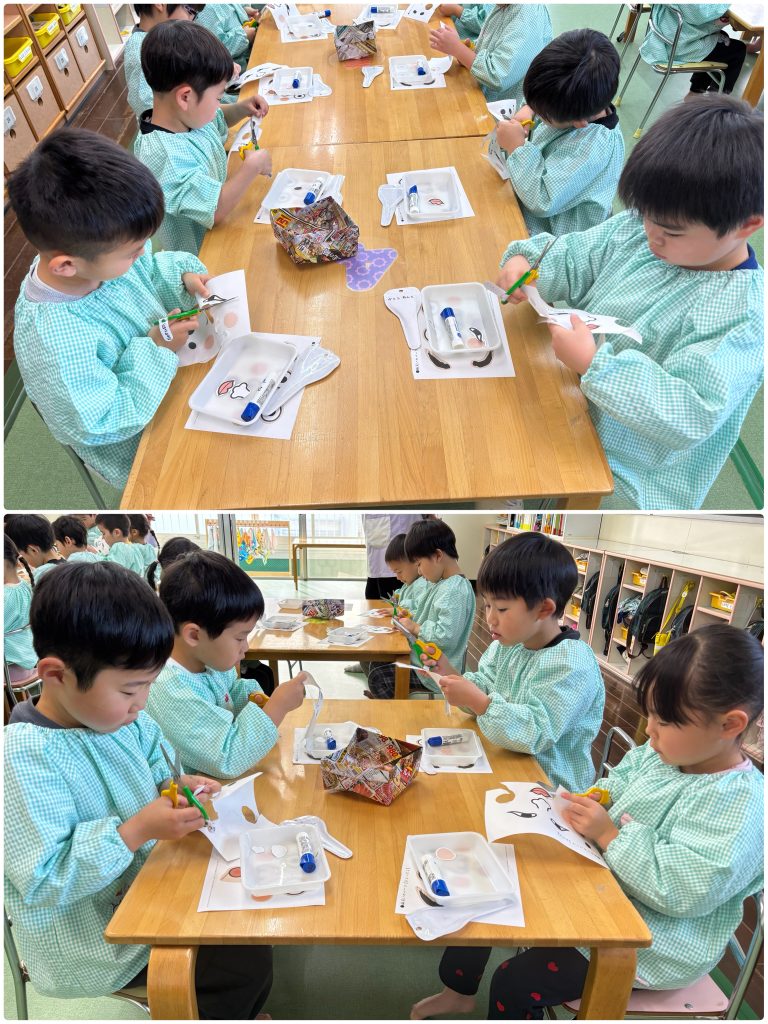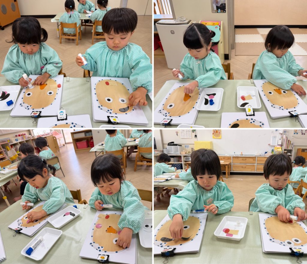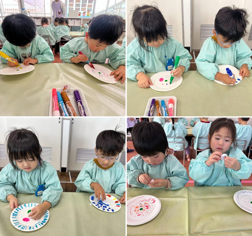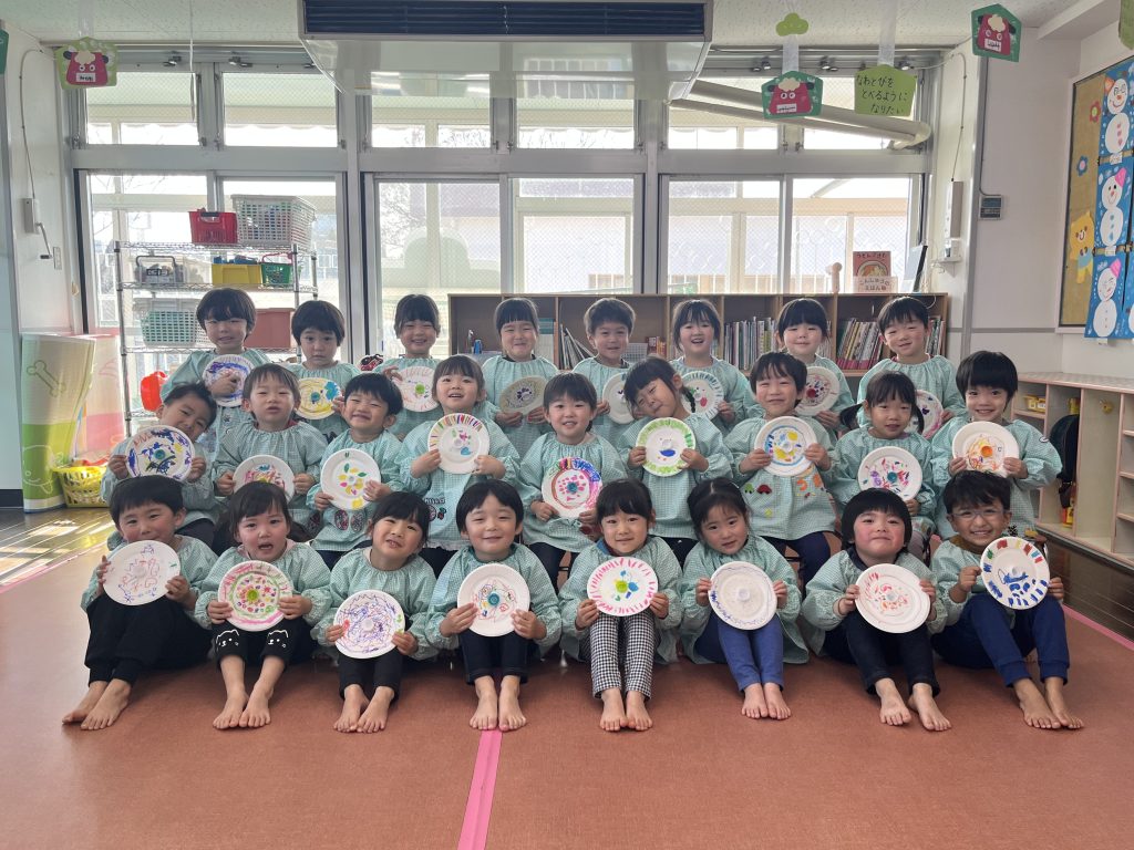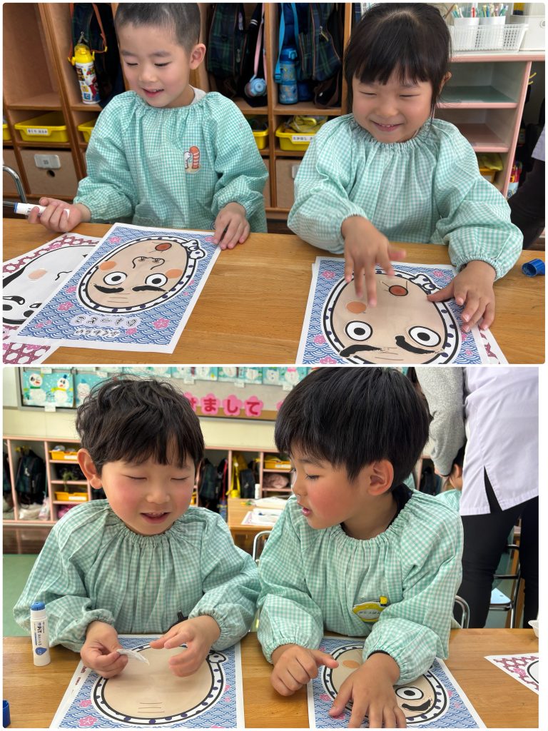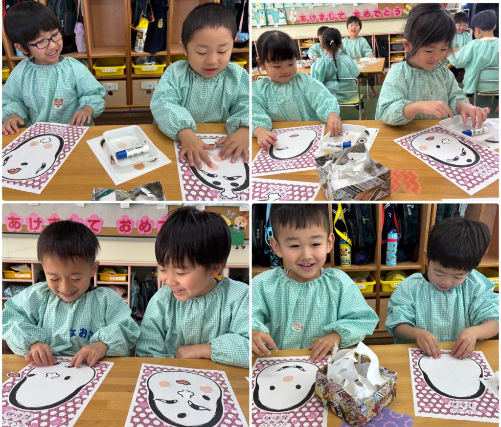 お正月明け、福笑いのパーツをハサミで切り福笑い遊び、紙皿に模様を書いてペットボトルのキャップをつけてコマ作り、昔からのお正月遊びで楽しんでいます。
