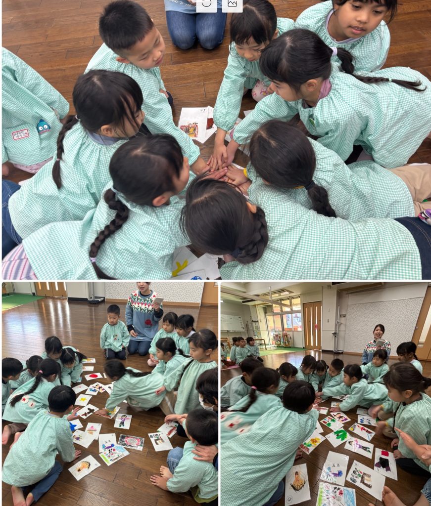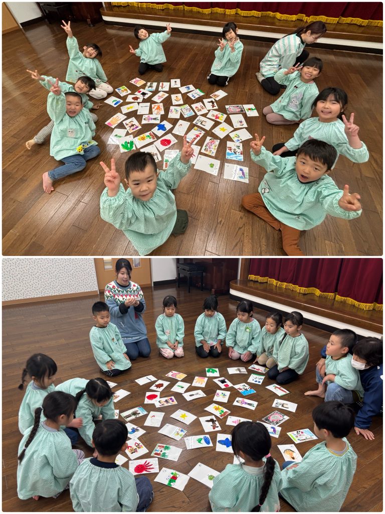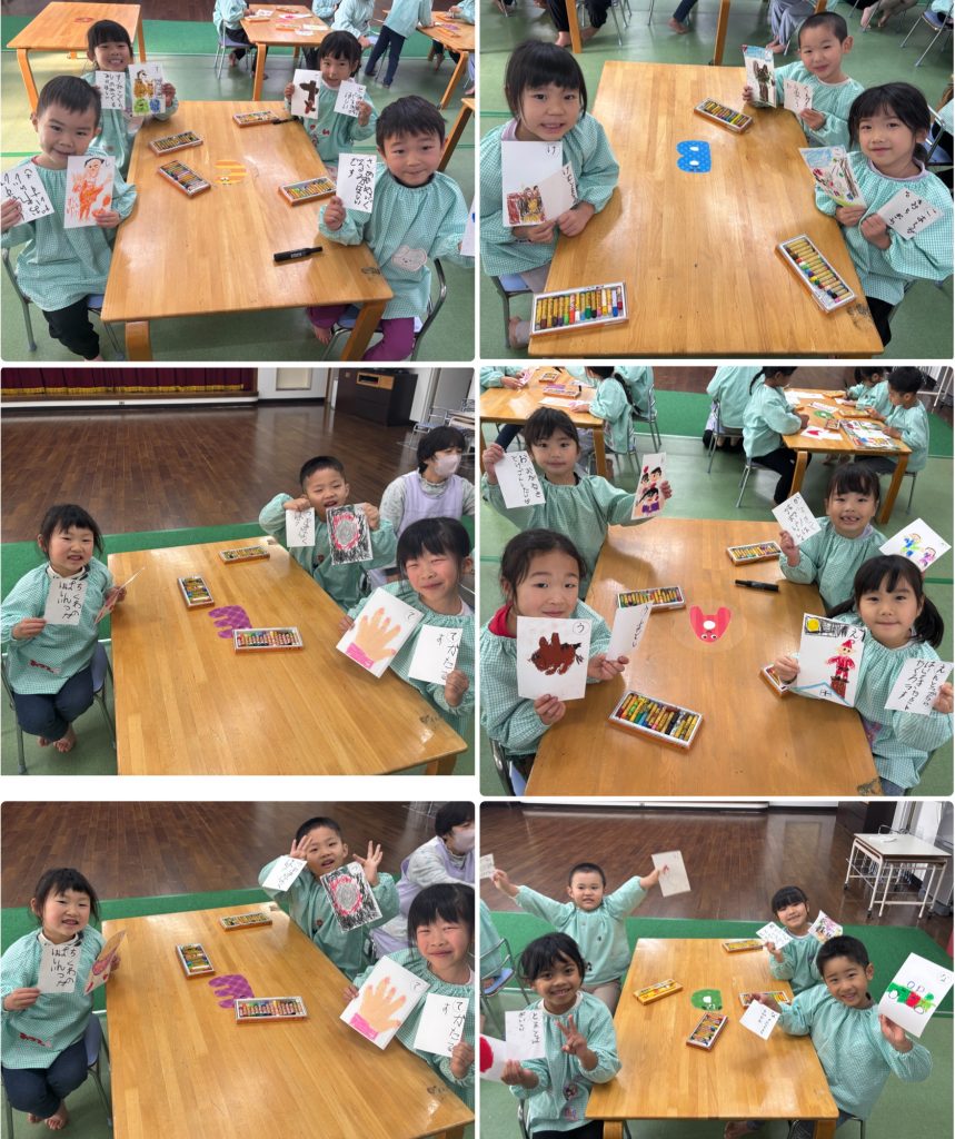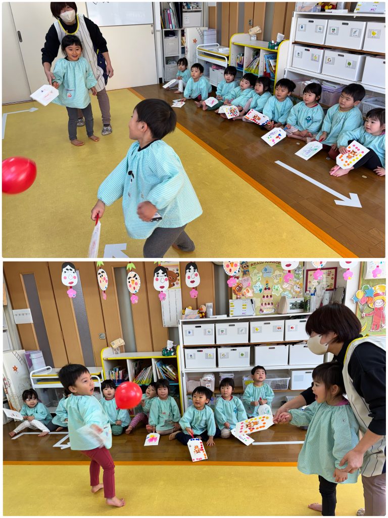 まつ組はカルタを一人一枚作りました。取りカードの絵も描いて・読みカードはひらがなで書きます。できたらみんなでカルタとり、争奪戦です。みんな集中‼️もも組は羽子板作りを行いました。できたら教室で練習🎈運動場でも風船を羽にして羽子板遊びを行いました。