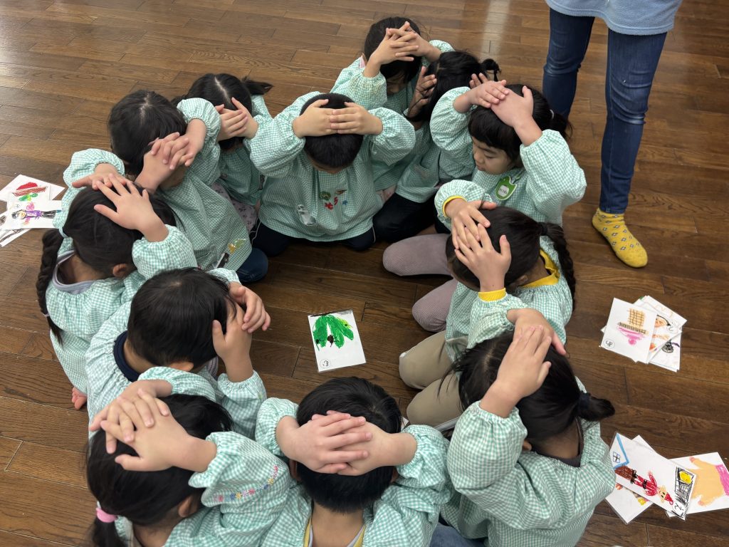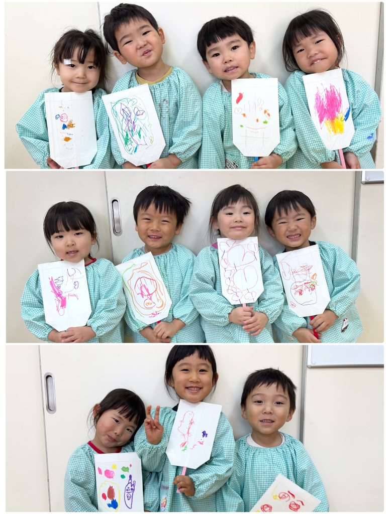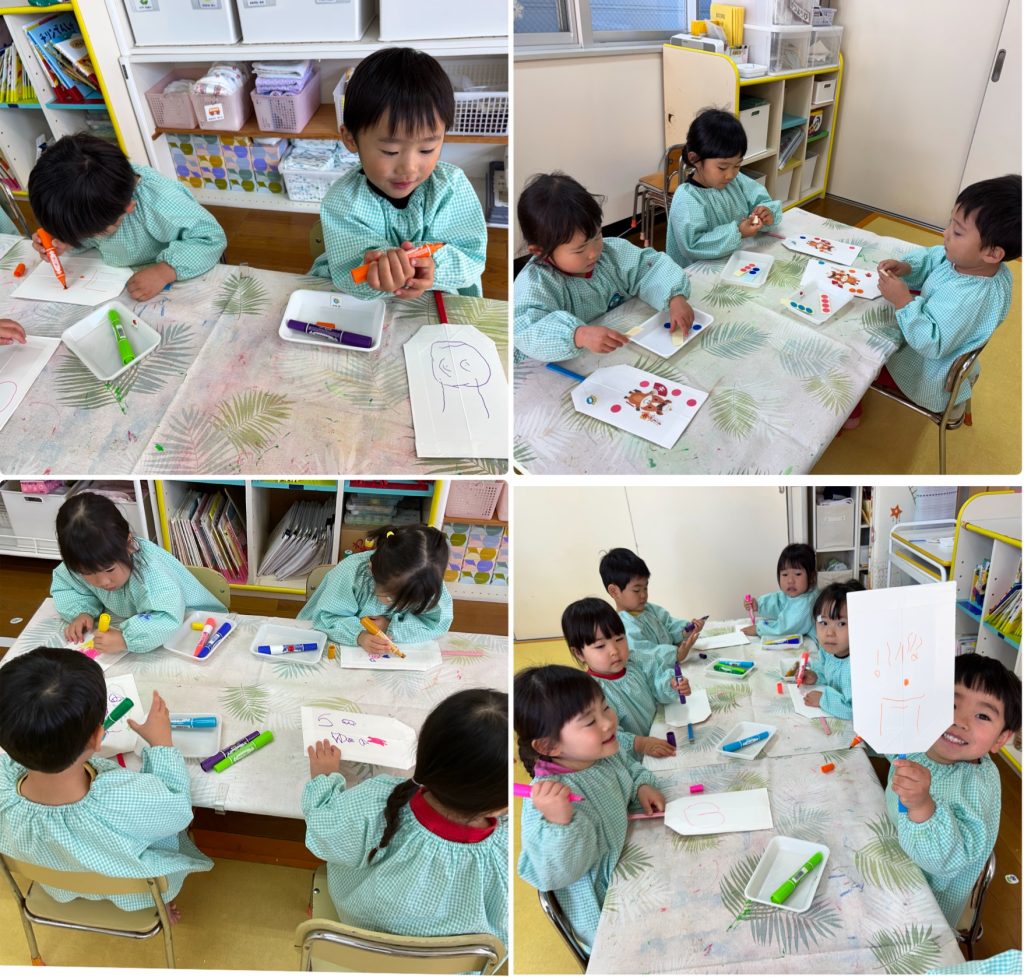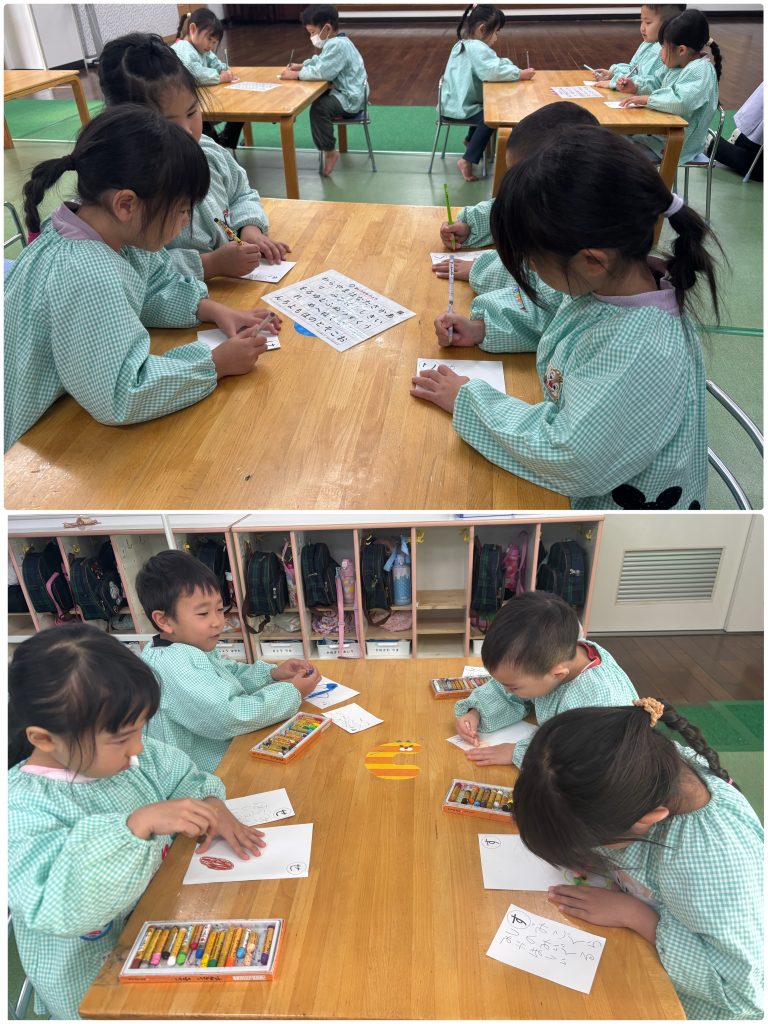 まつ組はカルタを一人一枚作りました。取りカードの絵も描いて・読みカードはひらがなで書きます。できたらみんなでカルタとり、争奪戦です。みんな集中‼️もも組は羽子板作りを行いました。できたら教室で練習🎈運動場でも風船を羽にして羽子板遊びを行いました。