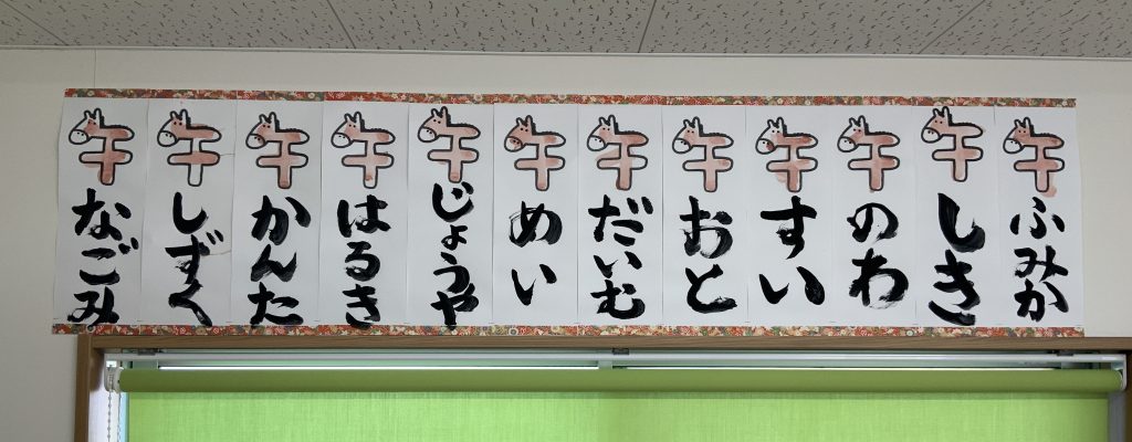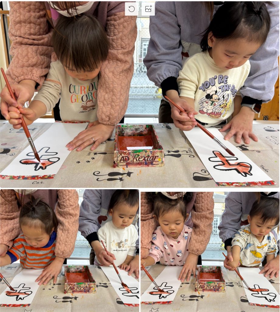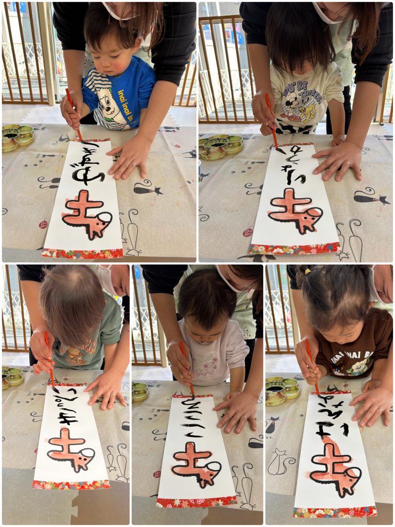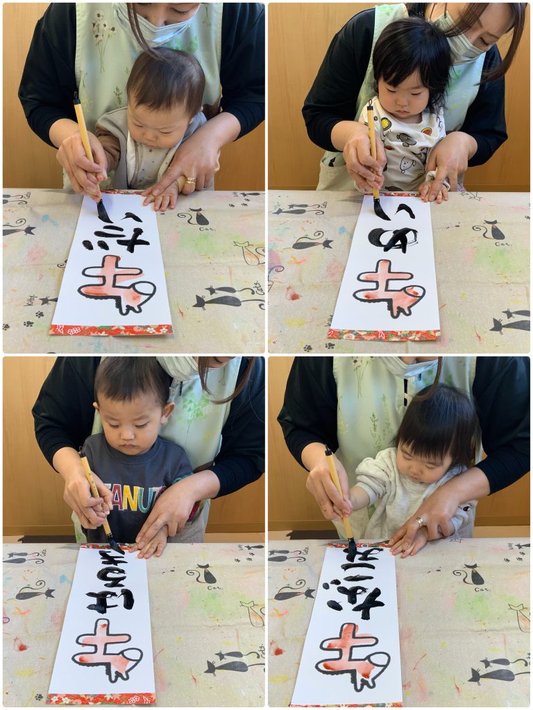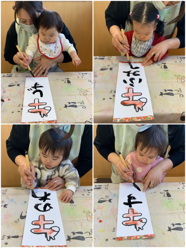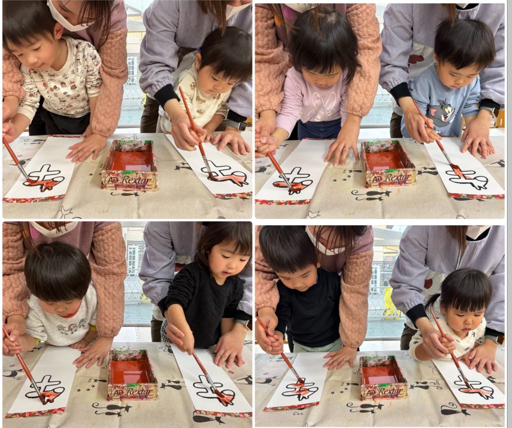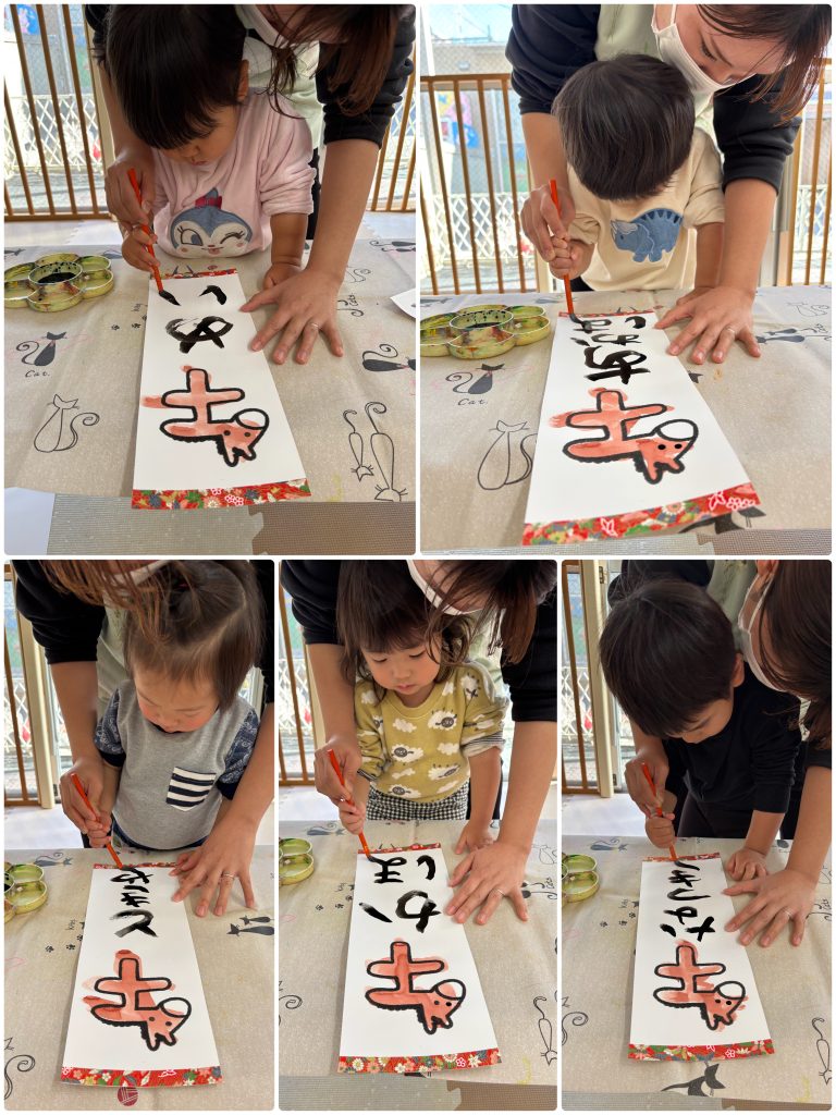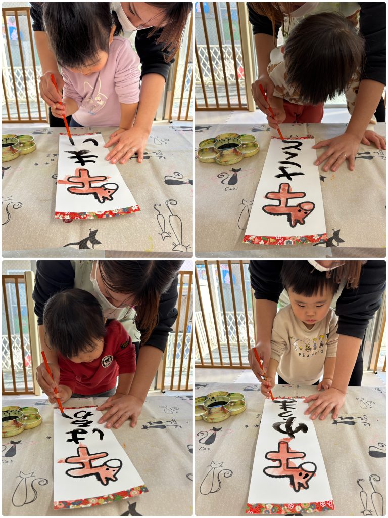 小さいクラスも先生と一緒に筆で書き初めを行いました。お正月に書き初めを行って、綺麗な字を描けるように大きくなりますように🖌️
