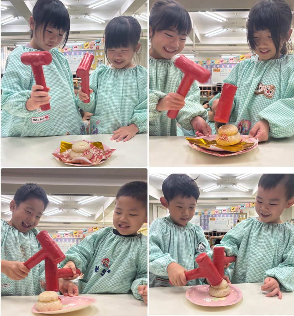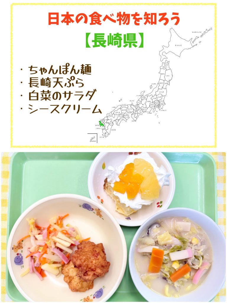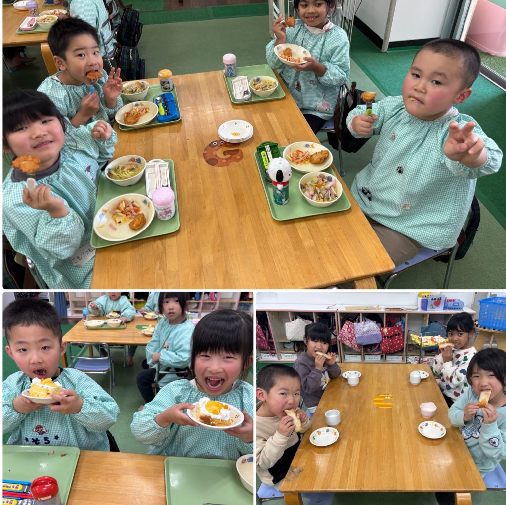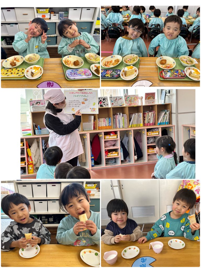 金曜日は食育の日です。鏡開きを行いました。餅・ハム・チーズを春巻きで巻いてオーブンで焼いておやつにいただきました。1年健康で過ごせますように‼️ 給食は長崎県の食べ物です。ちゃんぽん・甘い長崎天ぷら・白菜のサラダ・シースクリームです。説明を聞いてからいただきました。味は甘めでとても美味しかったです。