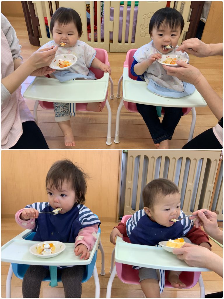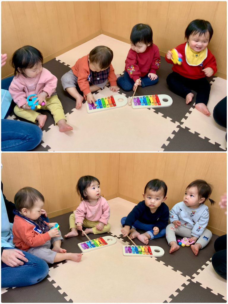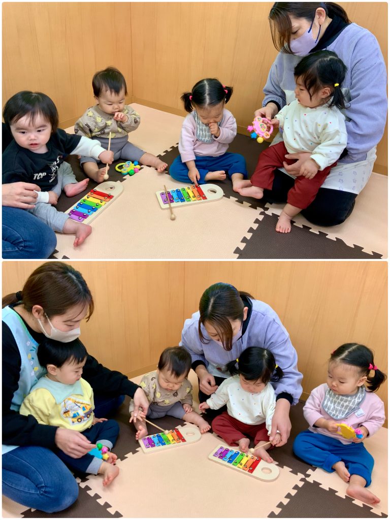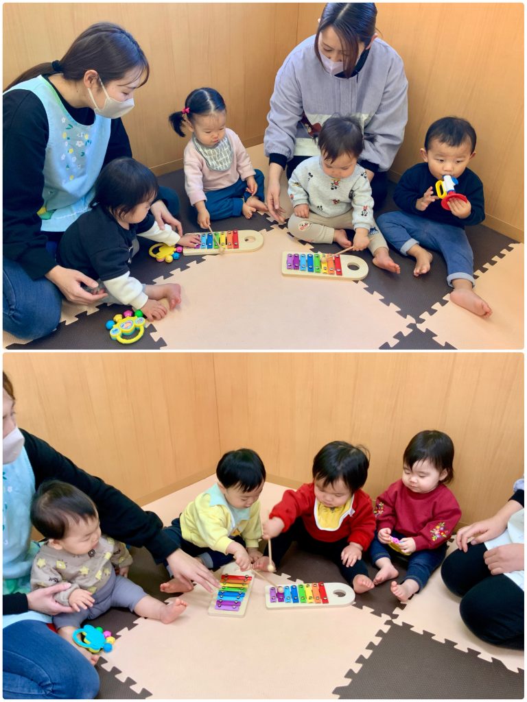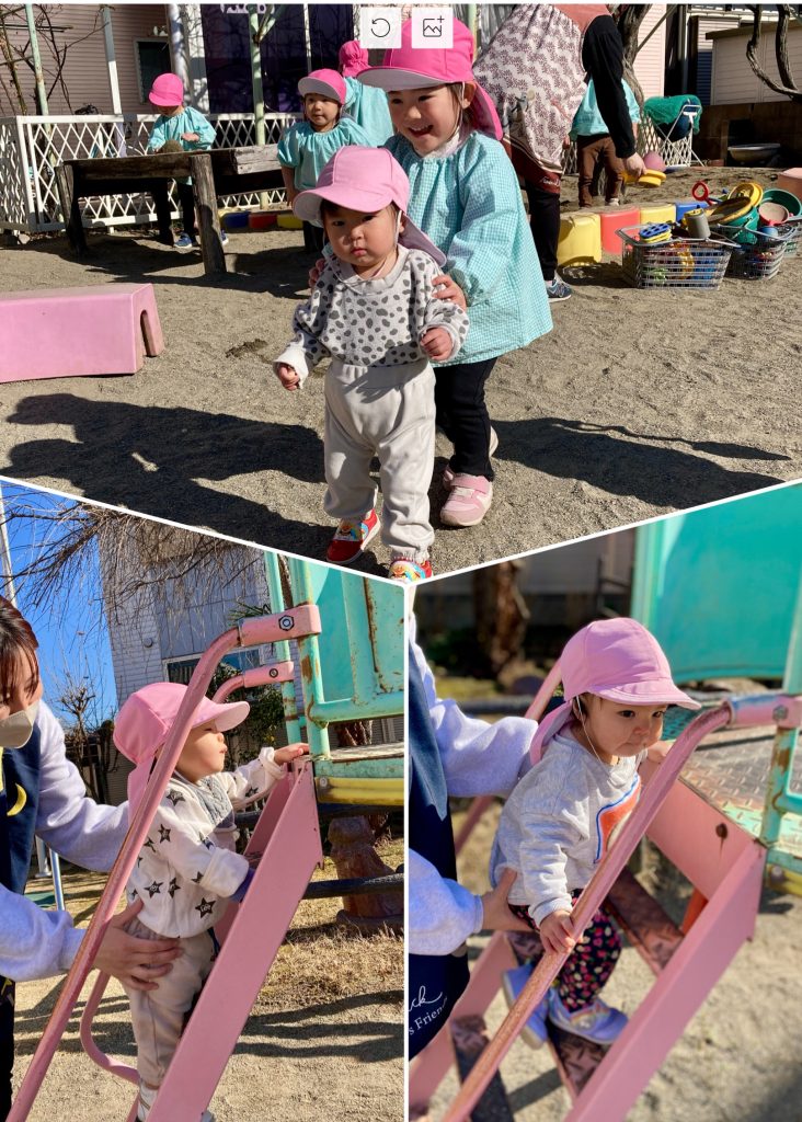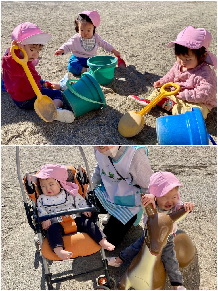 すずらん組冬の合間の暖かな日差しを浴びてお砂遊びです、遊具にもチャレンジ🛝上のクラスのお姉さんとも一緒に運動場で活動しました。教室ではリズム遊びも行います。おやつも美味しくいただきました。