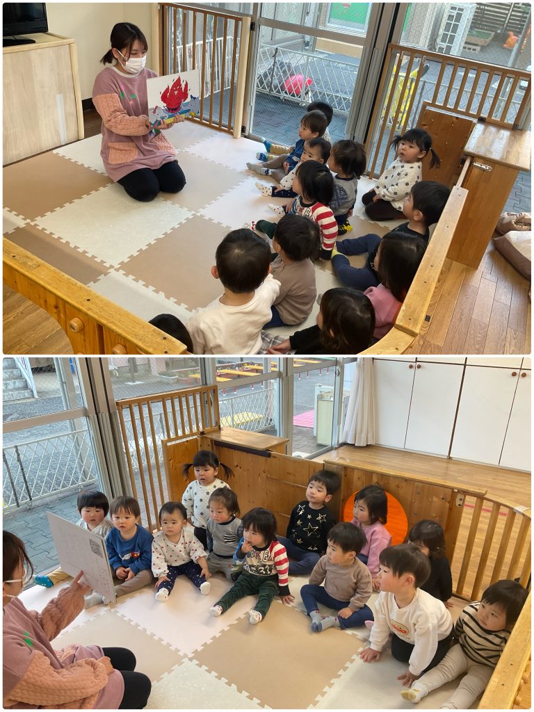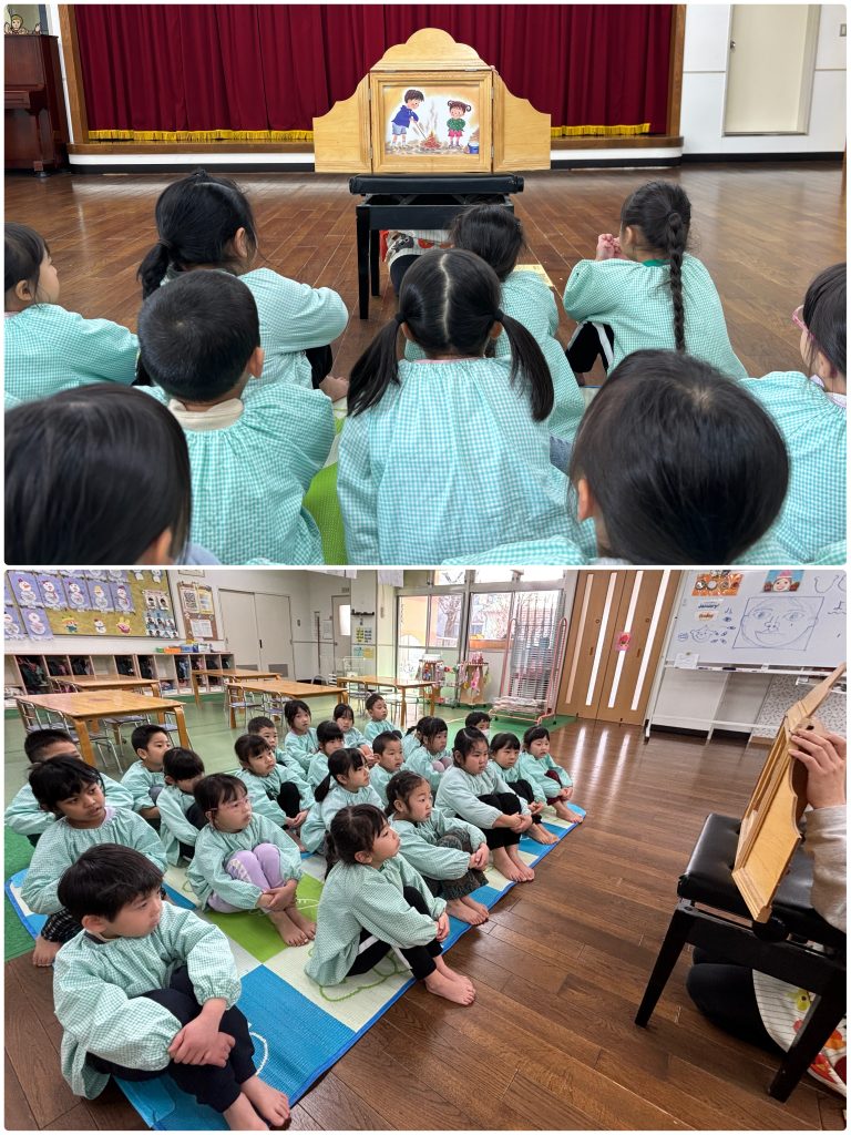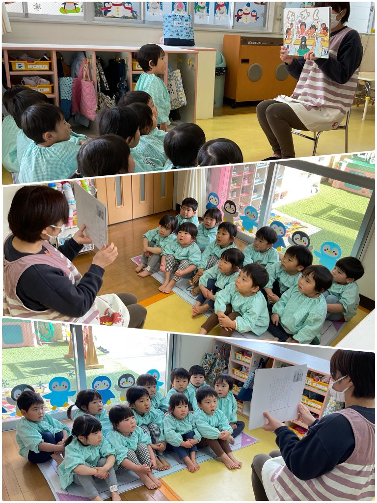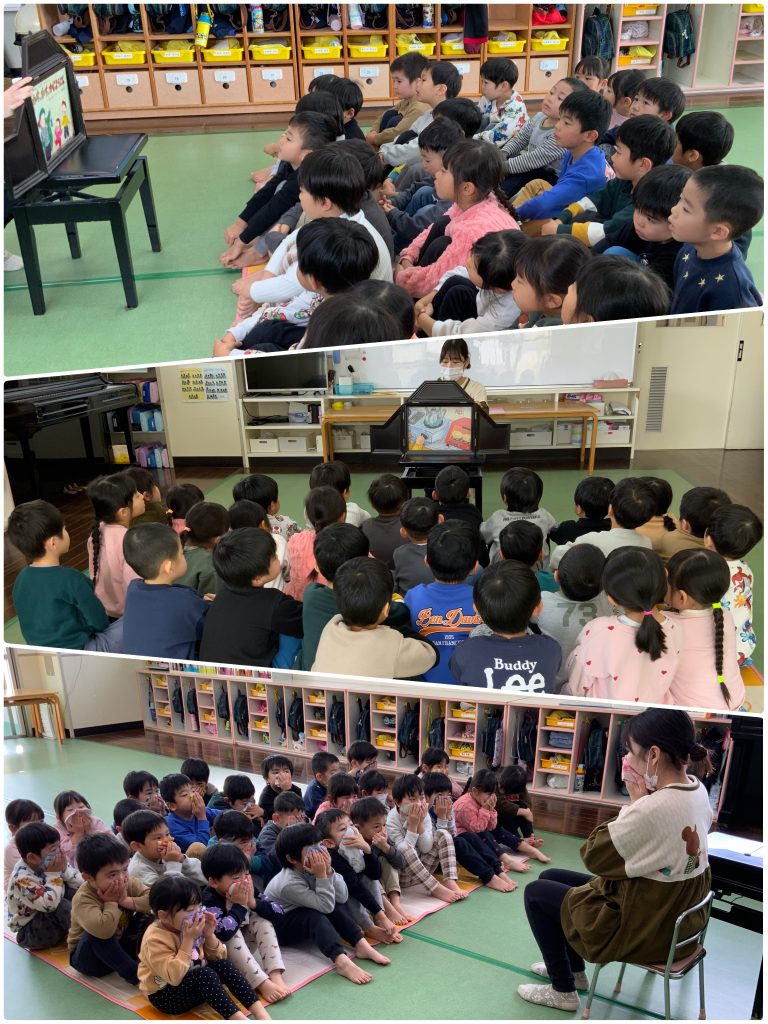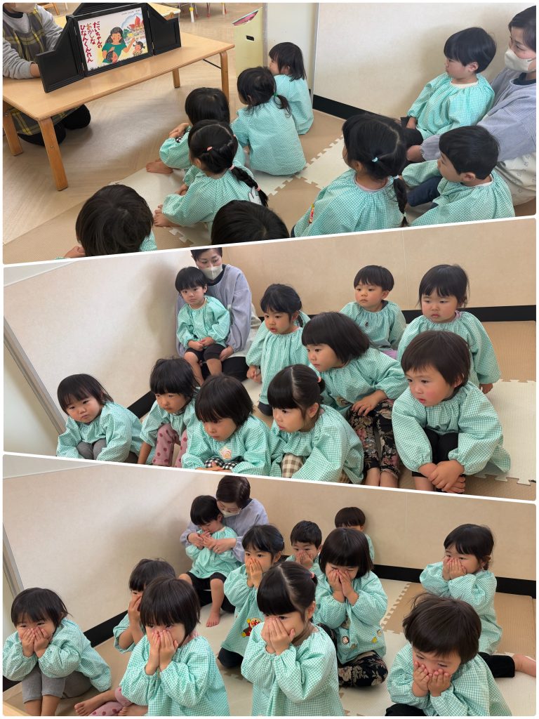 木曜日の避難訓練は、各クラスで行いました。それぞれに火事の紙芝居を見て、先生と煙を吸うと大変なことになる・避難する時は「おかしも」の合言葉を守ること等お約束を各クラスごとで話し合いました。