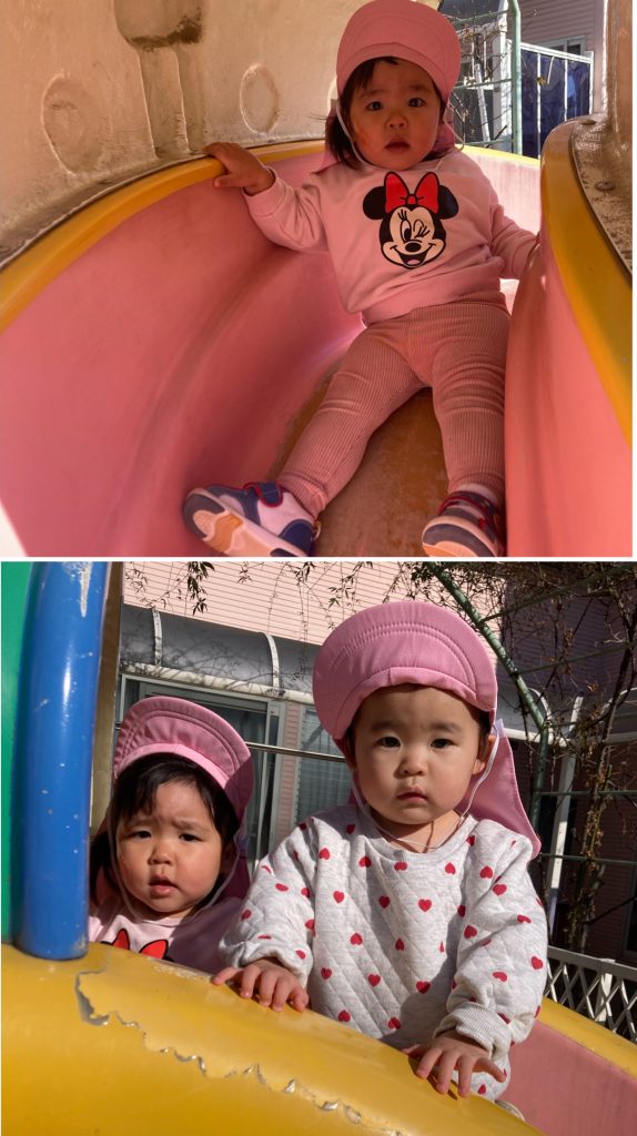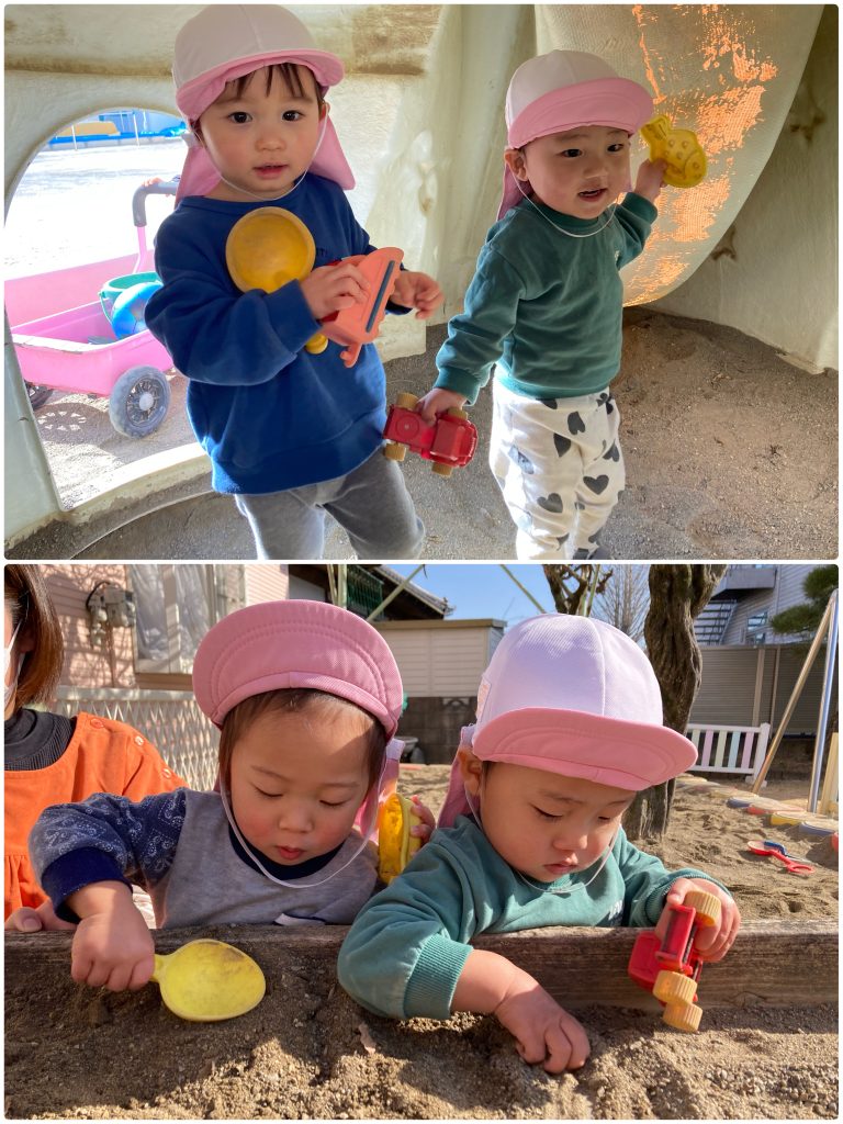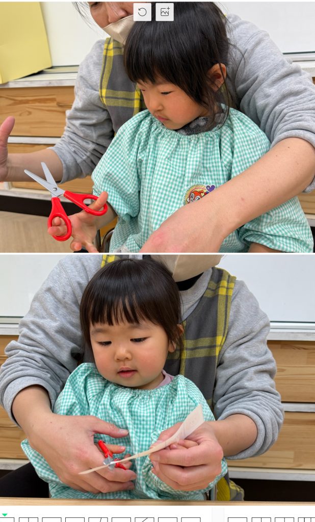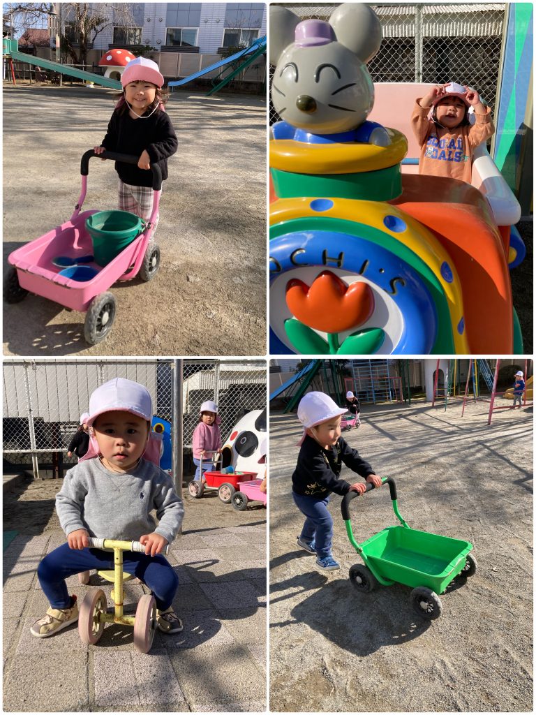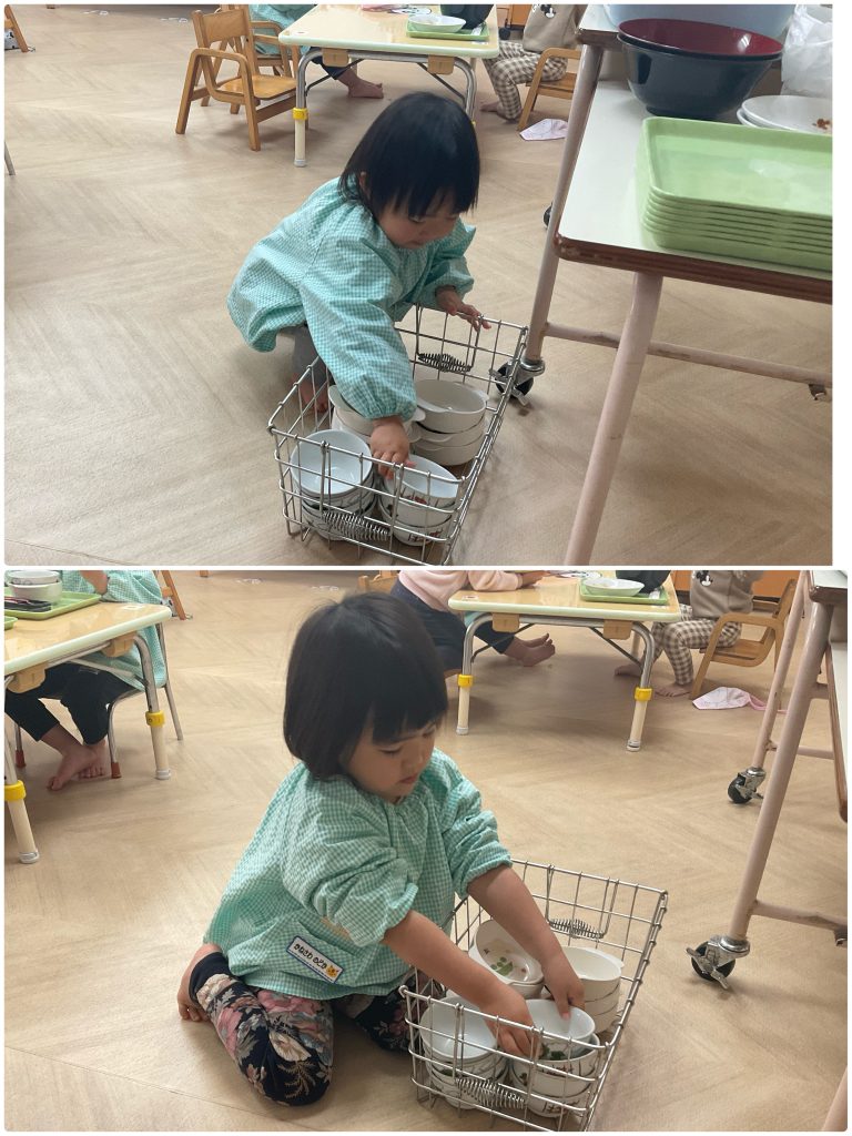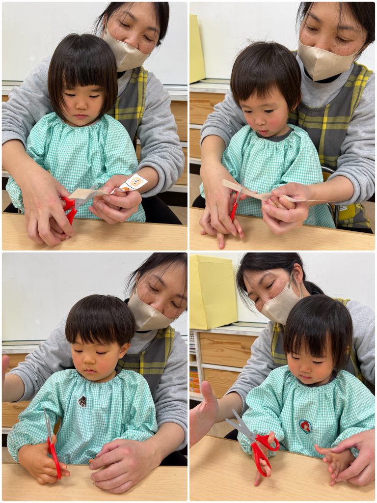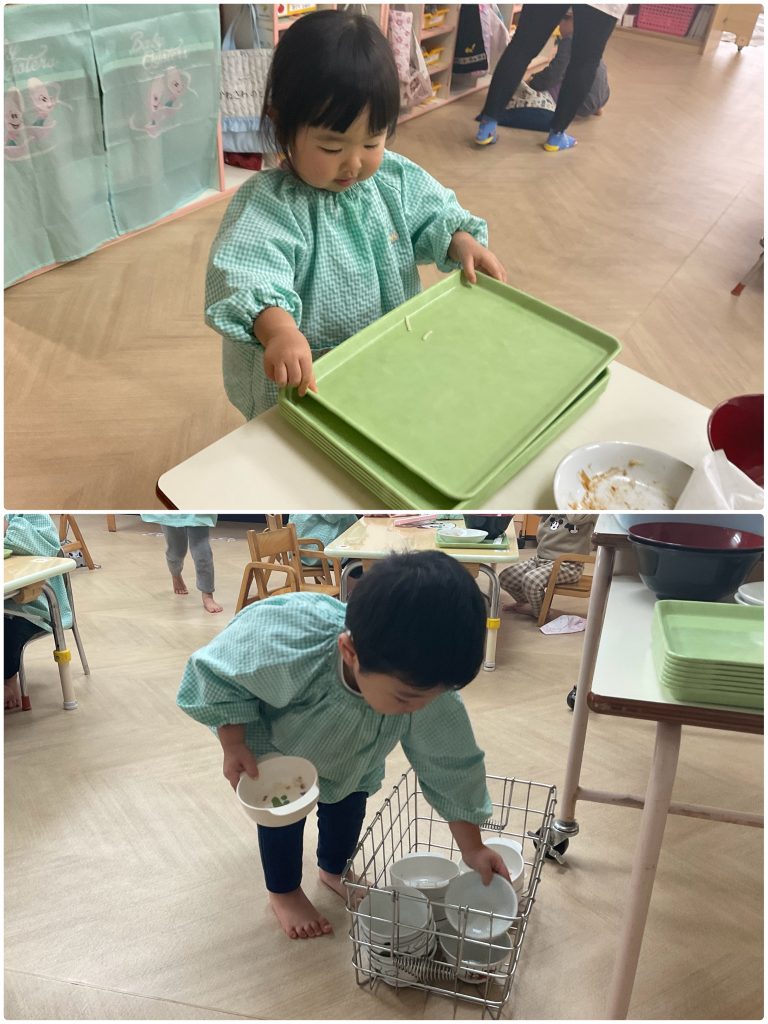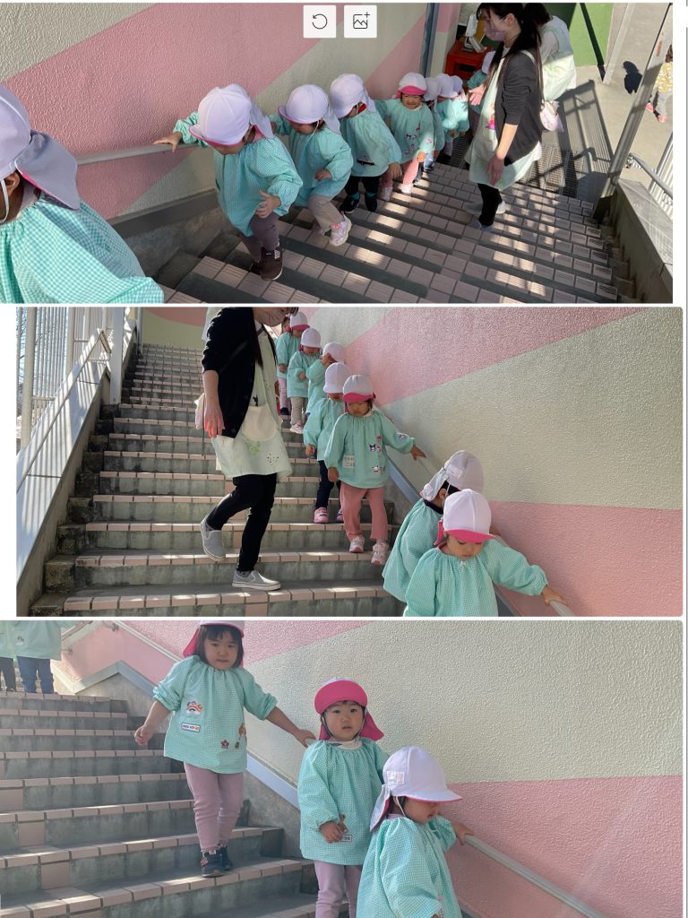 天気の良い日はお運動場・砂場で遊具を使って遊びます。ふじ組は進級準備ではハサミの使い方の確認、お給食の片付けも自分で行います。ふじ組は来年度は2階クラスになります。階段の上り下りも練習を始めました。