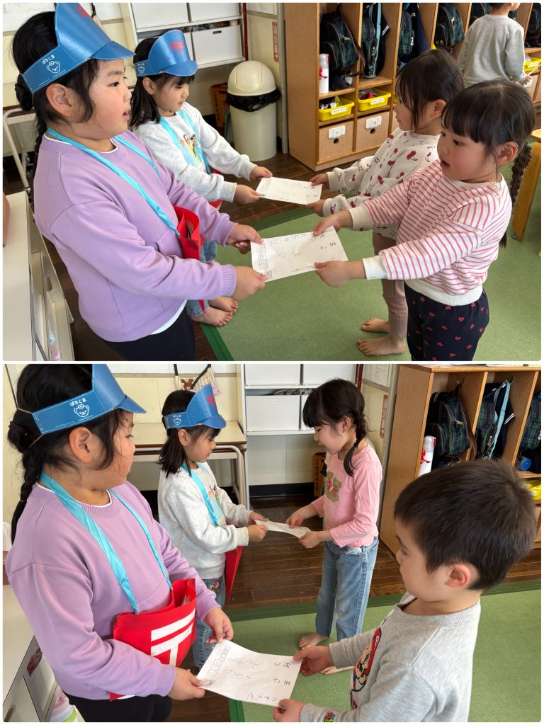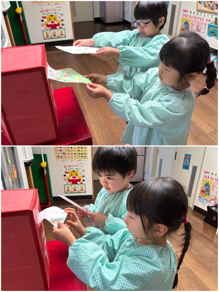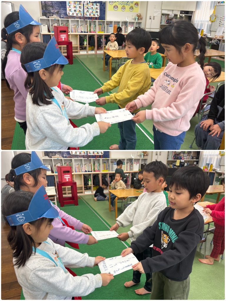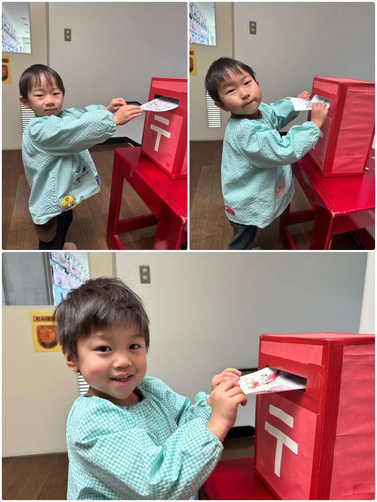 お正月に年賀状が届きましたか?今はラインの時代‼️でも手紙が届くとうれしくなってお返事が書きたくなりますよね、「そうです、今です」返事が書きたくなる、字に興味を持つ!好きな人に手紙を、字が書けなかったら絵でも大丈夫、まずは書いて出すが大切です。たんぽぽ・まつ組はあいうえお表を見ながら手紙を書く練習、ちゅうりっぷ組は絵を描いて、切手を貼る練習。ポストに入れて郵便屋さんが運んでくれます。出すのもドキドキ、受け取った時もドキドキ、子供が興味を持ったときが伸びるとき、お家でもお手紙書ごっこやってみよーー。