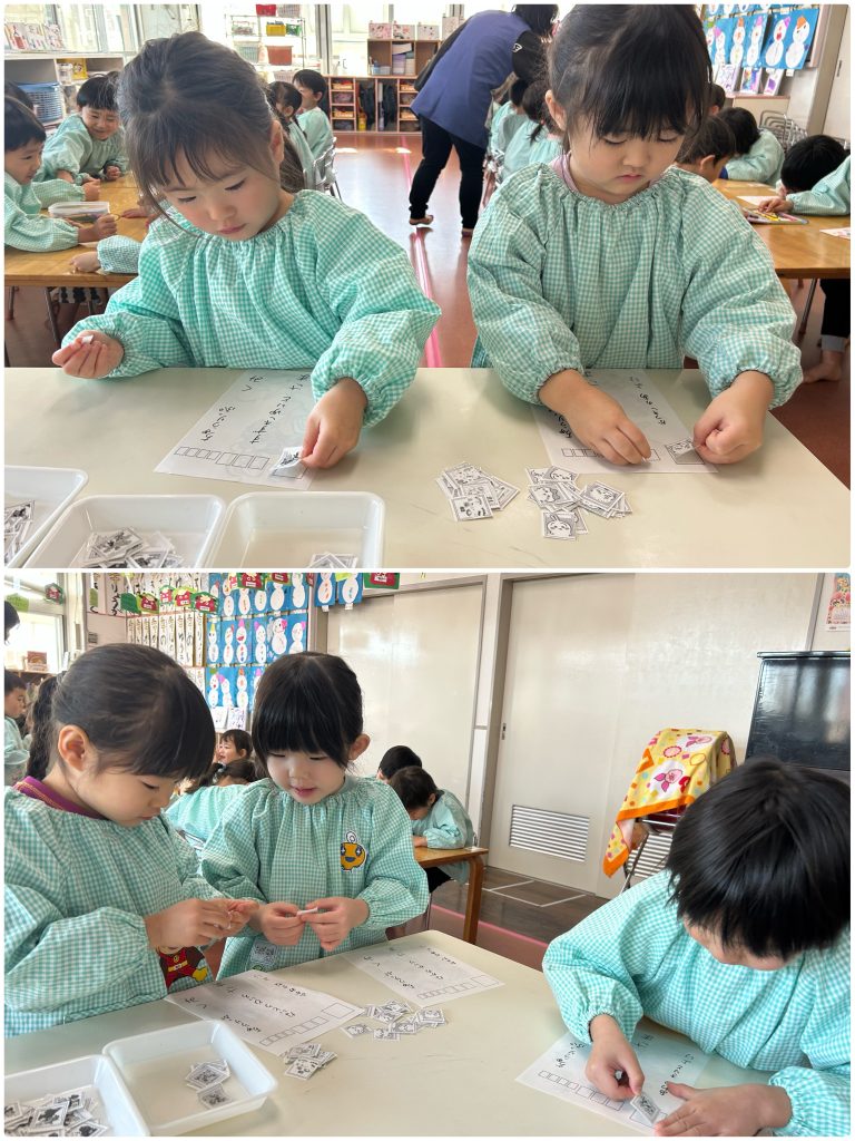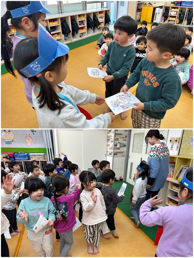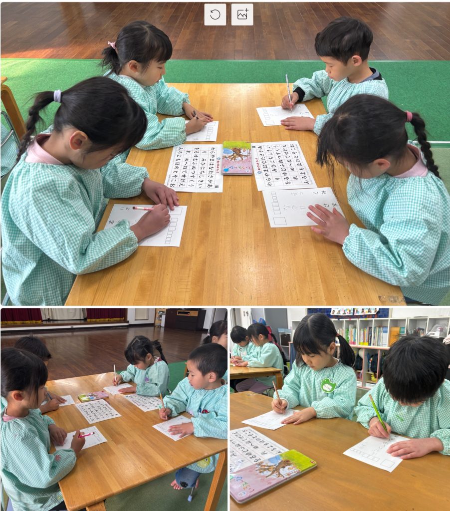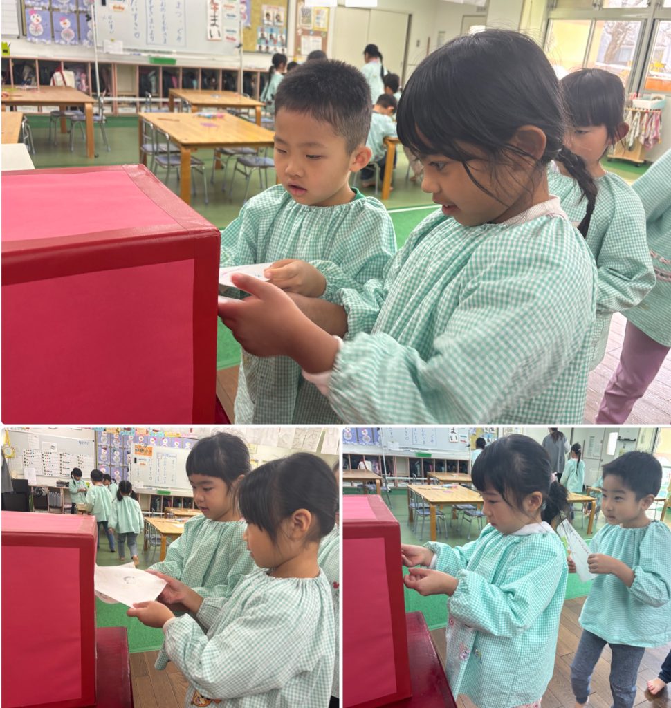 お正月に年賀状が届きましたか?今はラインの時代‼️でも手紙が届くとうれしくなってお返事が書きたくなりますよね、「そうです、今です」返事が書きたくなる、字に興味を持つ!好きな人に手紙を、字が書けなかったら絵でも大丈夫、まずは書いて出すが大切です。たんぽぽ・まつ組はあいうえお表を見ながら手紙を書く練習、ちゅうりっぷ組は絵を描いて、切手を貼る練習。ポストに入れて郵便屋さんが運んでくれます。出すのもドキドキ、受け取った時もドキドキ、子供が興味を持ったときが伸びるとき、お家でもお手紙書ごっこやってみよーー。