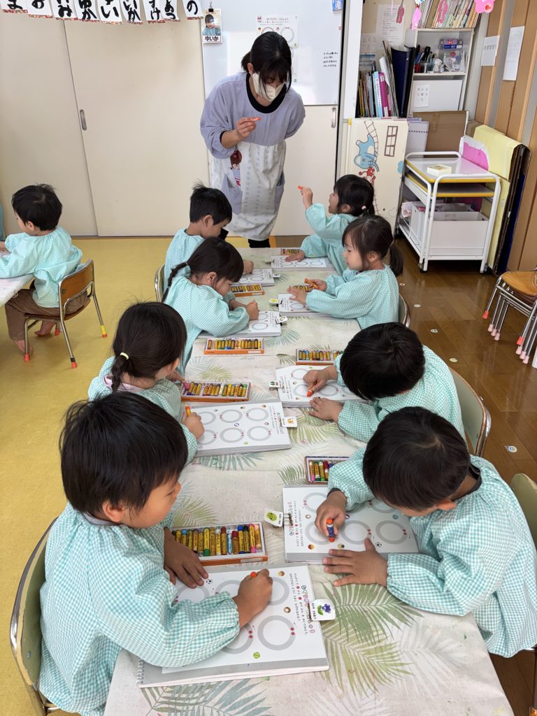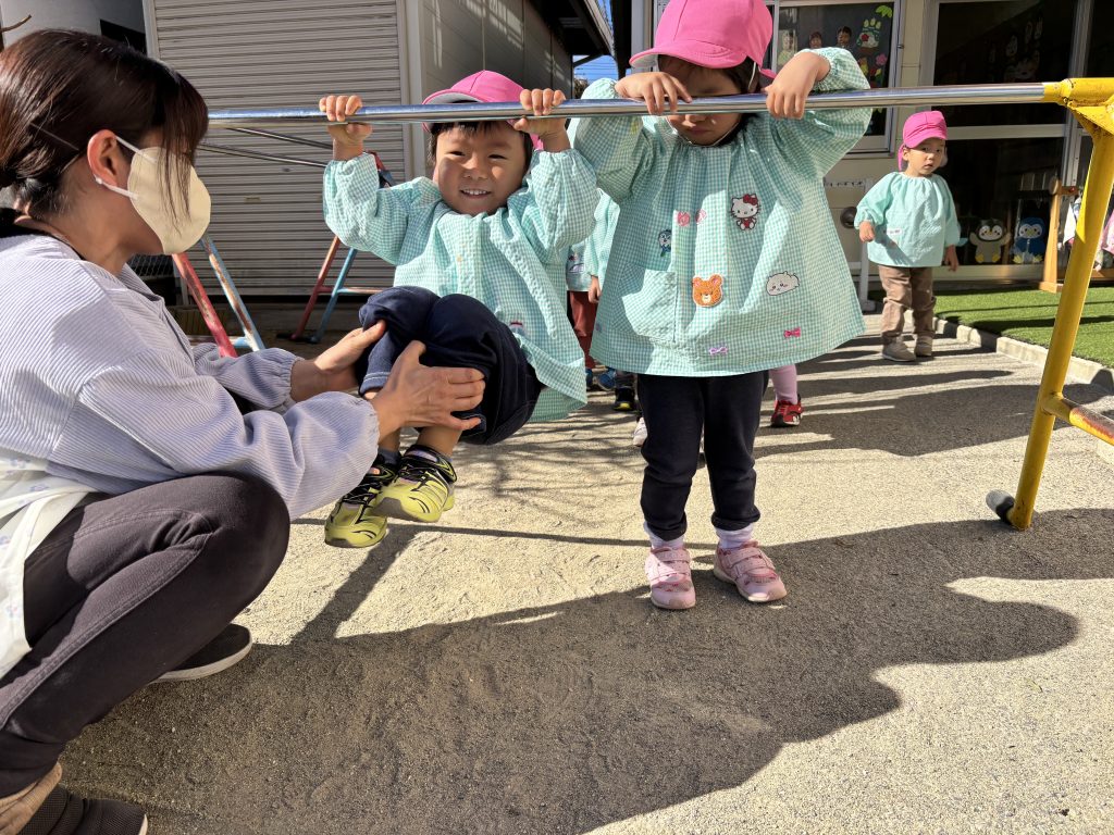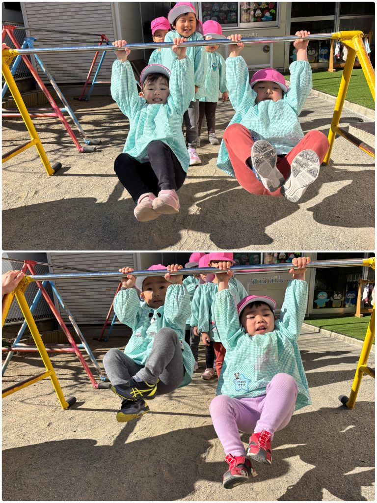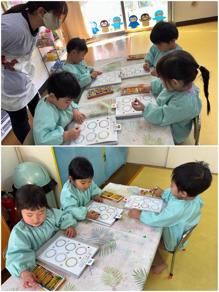 4月からは2階の教室に移動するモモ組は1段づつ片足で上がっていけるように練習をしています。教室では色んな色のクレヨンを使って丸を描き、描き始めと描き終わりを結ぶ練習です。ゆっくり丁寧になぞって行きます。先生も4月からのために色んな先生が教室に入って活動を行います。運動場へ出る時は鉄棒ぶら下がりを行います。握力・ひじを伸ばしてぶら下がる・お腹に力を入れて腹筋力・そして膝を上げます。これが軽々できるようになると、逆上がりもへっちゃらです。日々の積み重ねで基礎体力をつけて行きます。