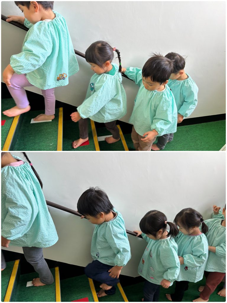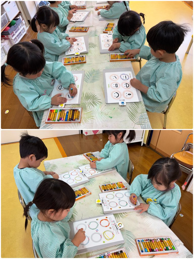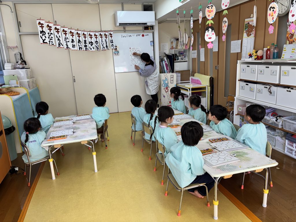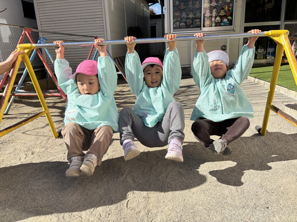 4月からは2階の教室に移動するモモ組は1段づつ片足で上がっていけるように練習をしています。教室では色んな色のクレヨンを使って丸を描き、描き始めと描き終わりを結ぶ練習です。ゆっくり丁寧になぞって行きます。先生も4月からのために色んな先生が教室に入って活動を行います。運動場へ出る時は鉄棒ぶら下がりを行います。握力・ひじを伸ばしてぶら下がる・お腹に力を入れて腹筋力・そして膝を上げます。これが軽々できるようになると、逆上がりもへっちゃらです。日々の積み重ねで基礎体力をつけて行きます。