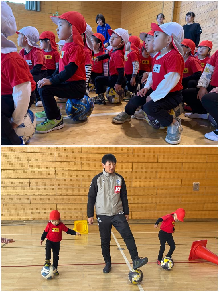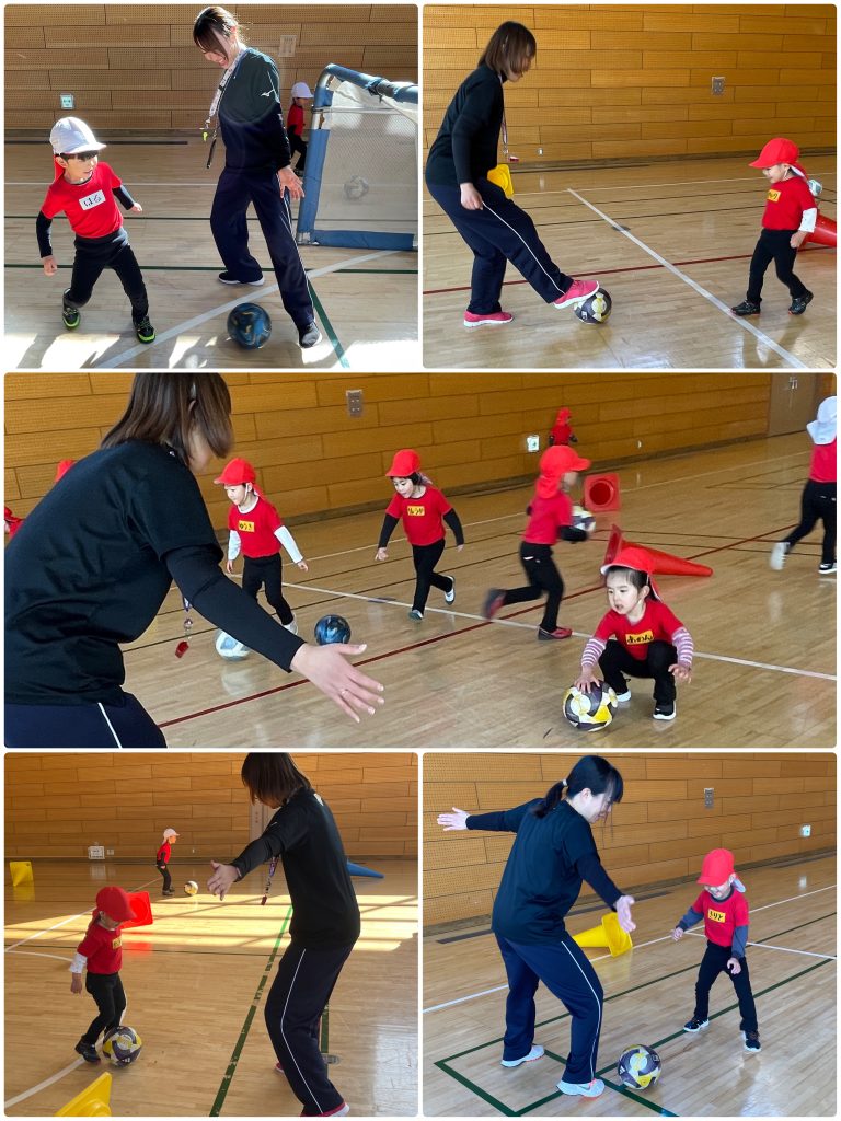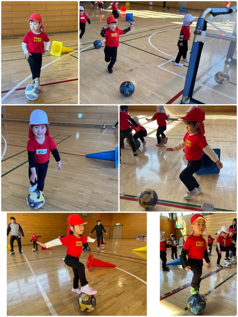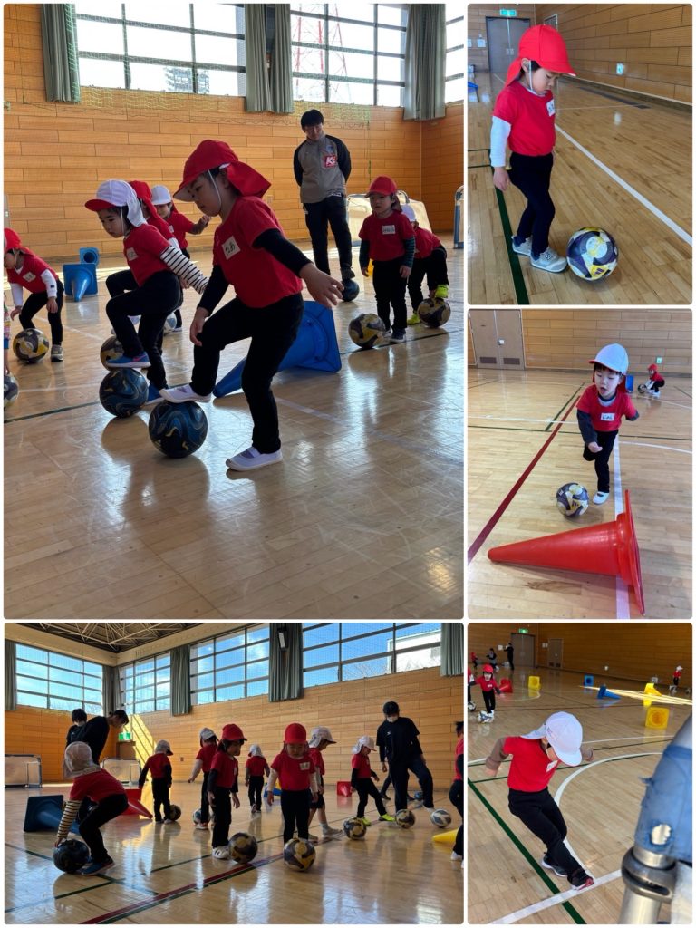来年度には年5回水戸ホーリーホックのコーチをお呼びしてサッカー教室を受けるため、今日はちゅうりっぷ組が始めてサッカー教室を体験しました。かっこいい「なおコーチ」と「せいじコーチ」が面白く優しくボールを使って指導してくれました。コーチの説明の間は、みんなキラキラした目でコーチの話を聞いていました。来年からは聖慈保育園のお友達と混合でグループ分けを行います。楽しみだね。