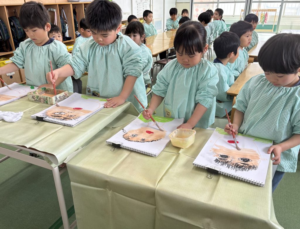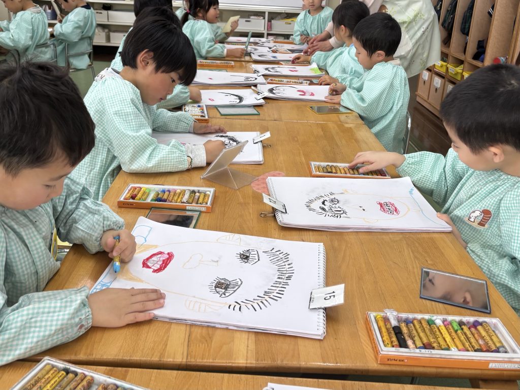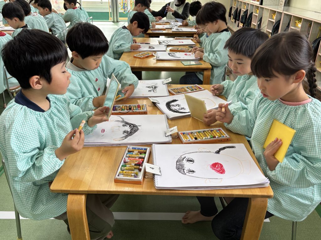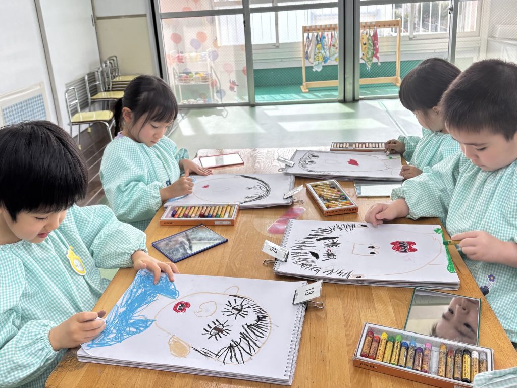 たんぽぽ組は4月からはまつ組です。大きい教室になります。まつ組が園外に出た時は教室を借りてまつ組の気分を味わいます。ちょっと緊張です。まつ組の卒園記念は自画像です。鏡を見て自画像の練習です。見たままに大きく力強く描けました。絵の具で肌色も筆で塗っていきます。まつ組になったら色んなことにもチャレンジします。楽しみだね。