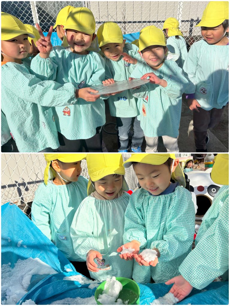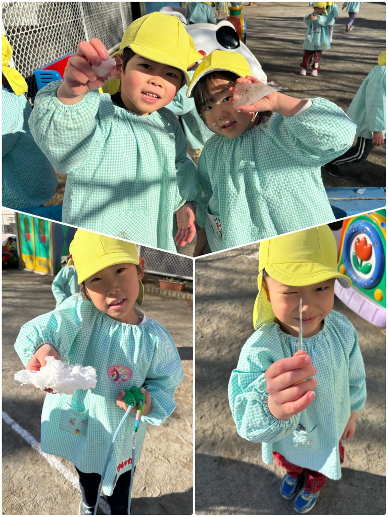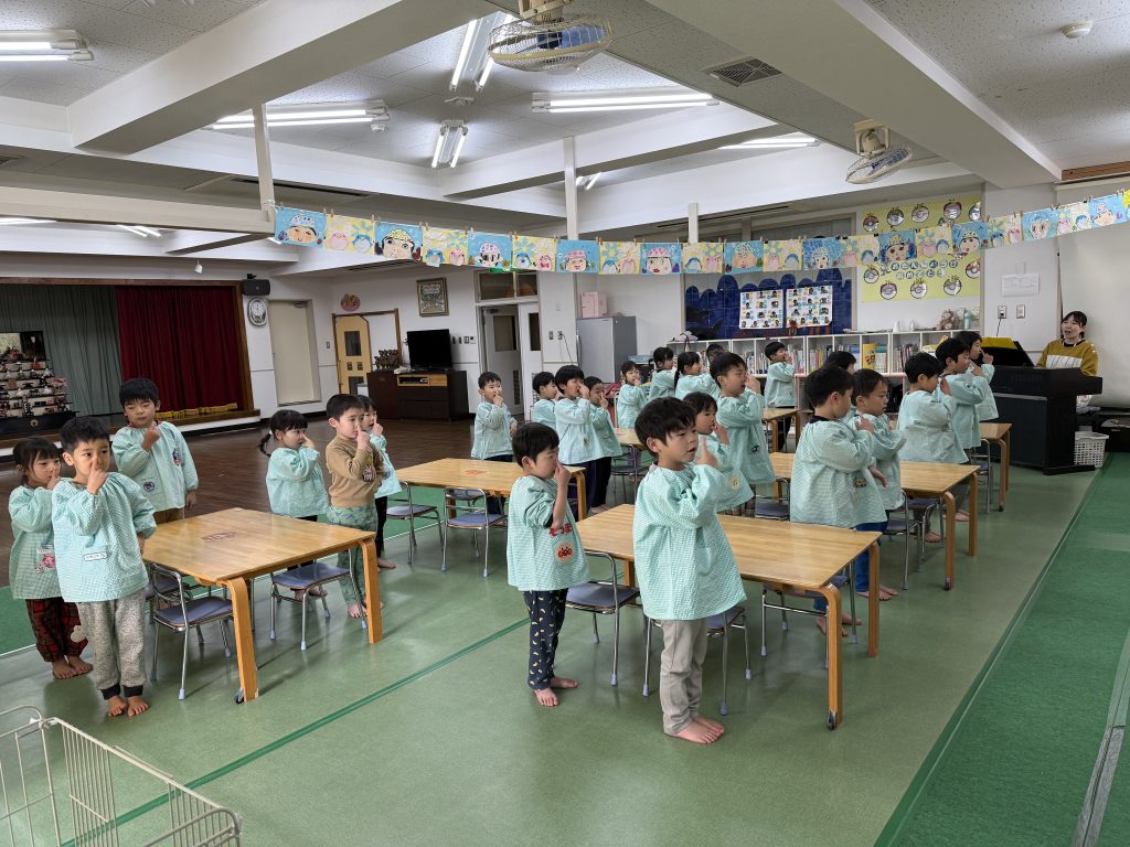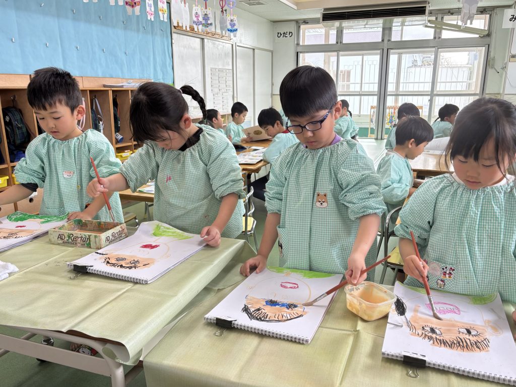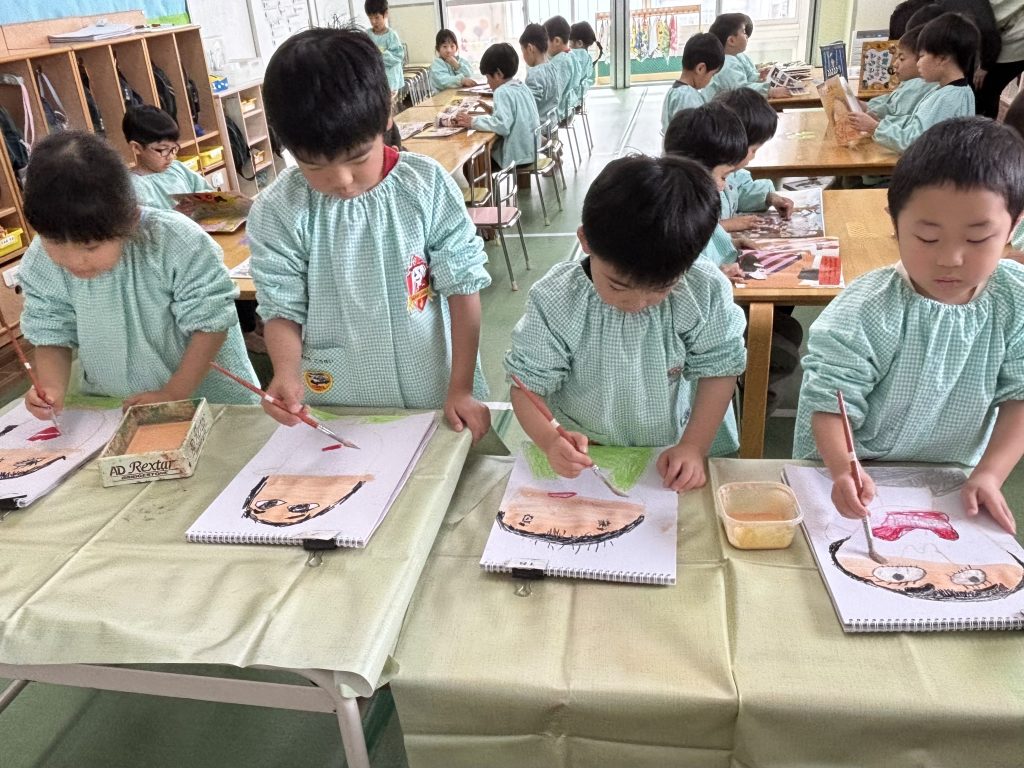 たんぽぽ組は4月からはまつ組です。大きい教室になります。まつ組が園外に出た時は教室を借りてまつ組の気分を味わいます。ちょっと緊張です。まつ組の卒園記念は自画像です。鏡を見て自画像の練習です。見たままに大きく力強く描けました。絵の具で肌色も筆で塗っていきます。まつ組になったら色んなことにもチャレンジします。楽しみだね。