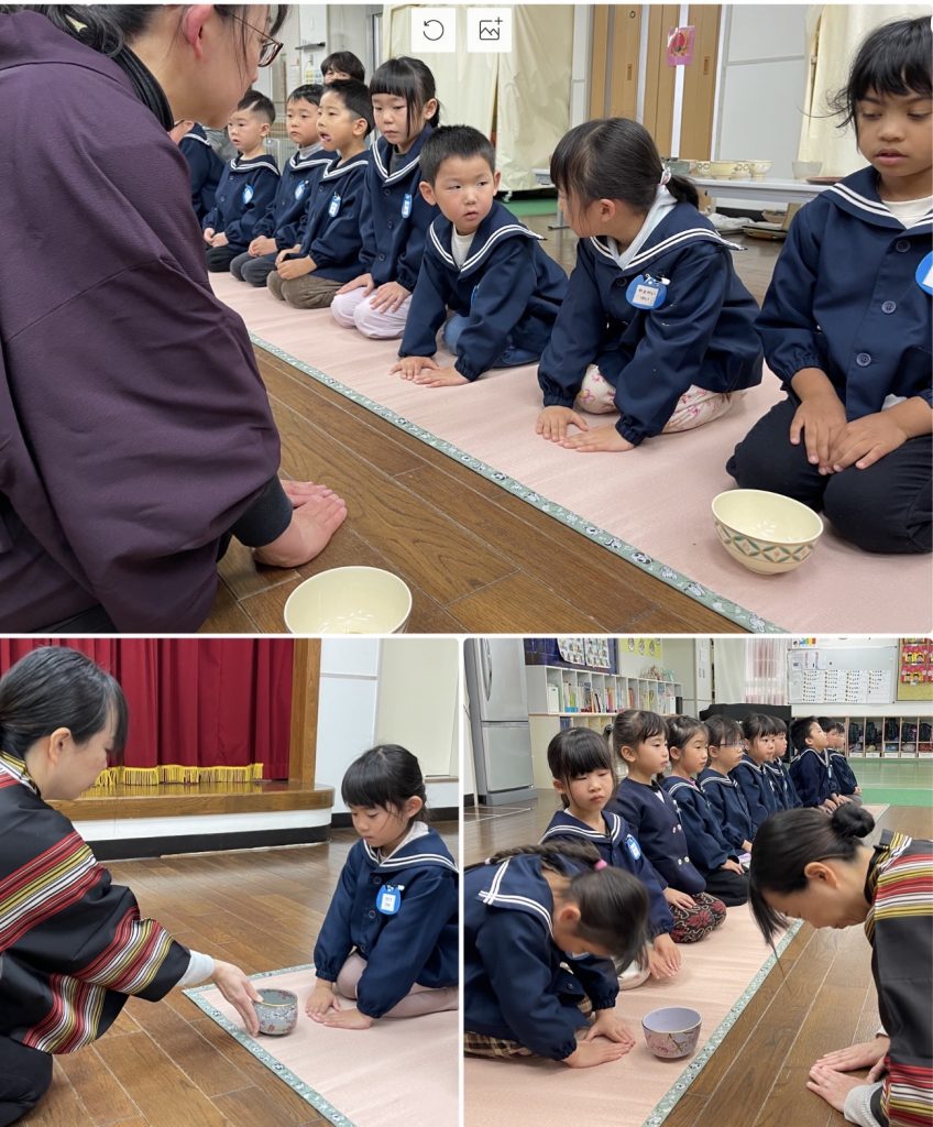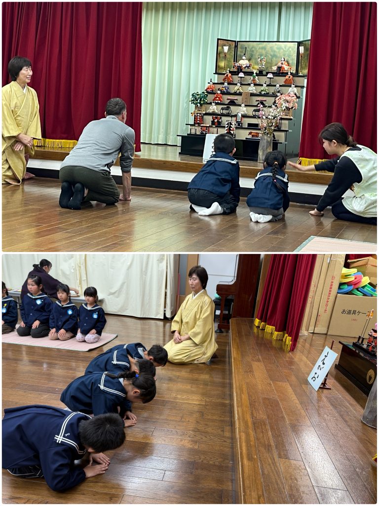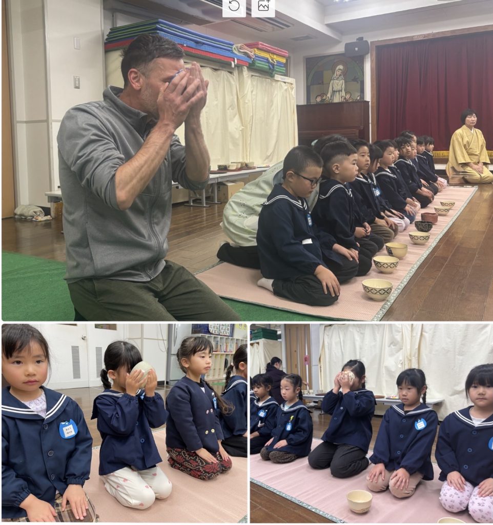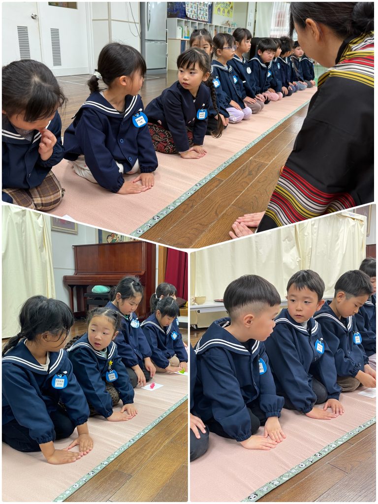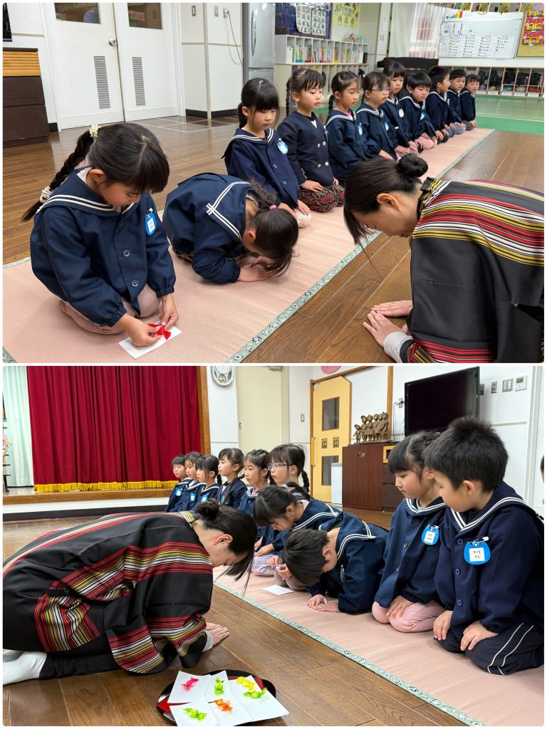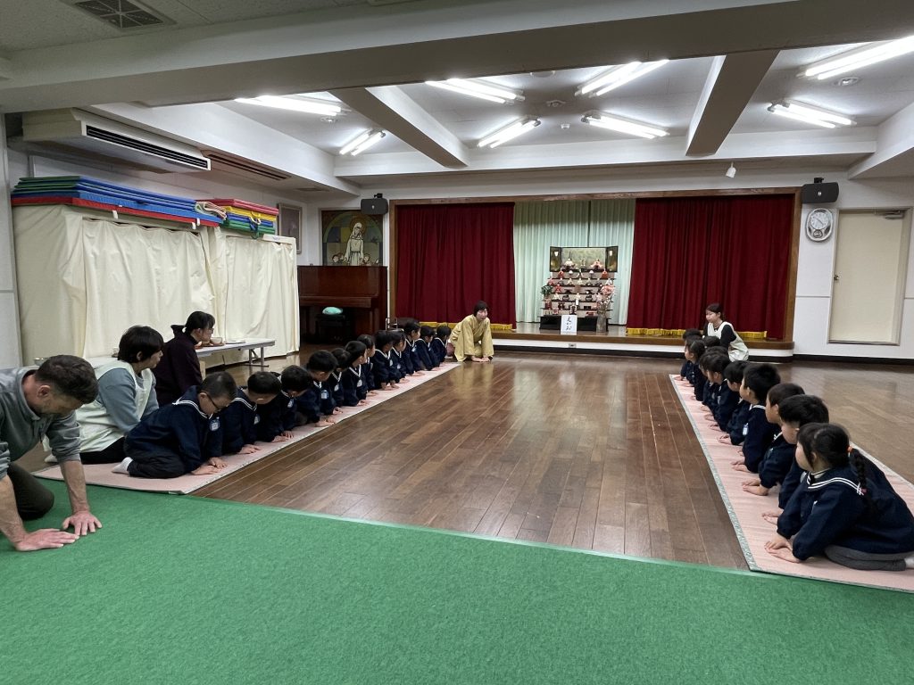 3月3日おひな祭りの日はお茶会を行います。1年で3回のお作法の会を行い、卒園前にお菓子とお茶をいただきます。お辞儀、静かに歩く、お菓子やお茶をいただく前の日本人らしい仕草・周りの人への気遣いを身につけます。マイク先生も一緒に参加しました。スイスでは考えられない「ティータイム」だそうです。日本人として静かな心を保ちながら、どんな時も動じず心静かに考え、周りの人への気遣いを忘れないなど、身につけて欲しいと願いながら、時間を過ごしました。立派な小学生になってください。