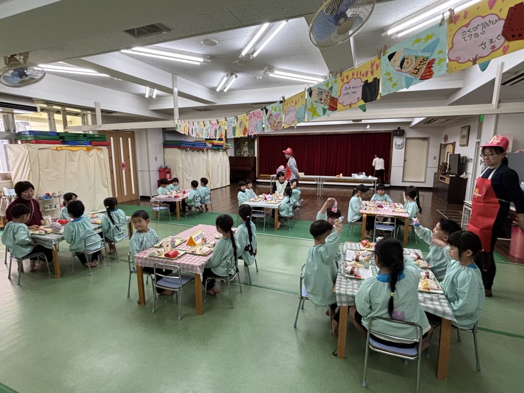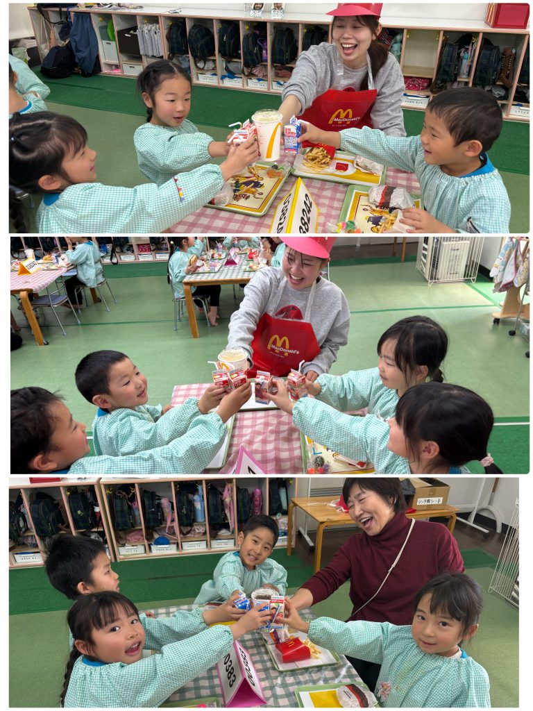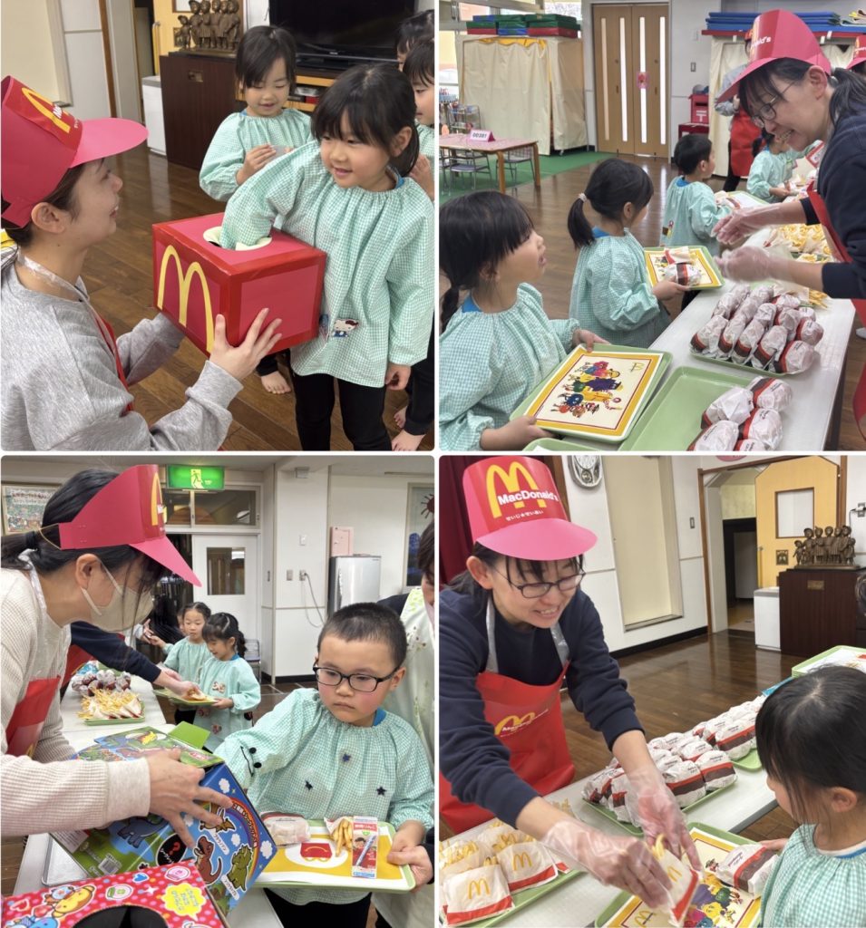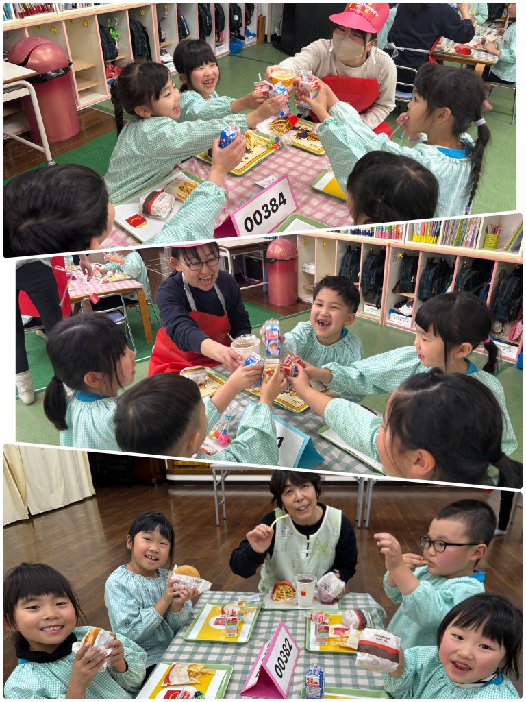 まつ組最後の太陽の日は、バスでわくわくピサーロの森へ行きました。2組に分かれて広場で遊ぶチーム&ピサーロ見学のチームに分かれて交代で過ごしました。園に帰り昼食は聖愛マックです。座る席はくじで決めて、ハンバーガーをとり、ポテト、飲み物、そしておまけのおもちゃもゲットです。みんなでカンパイをしてからいただきました。卒園前はいろんなサプライズがいっぱいです。楽しい思い出たくさん作って卒園しようね。