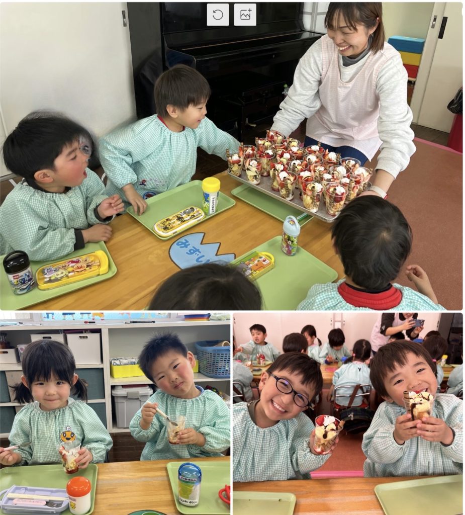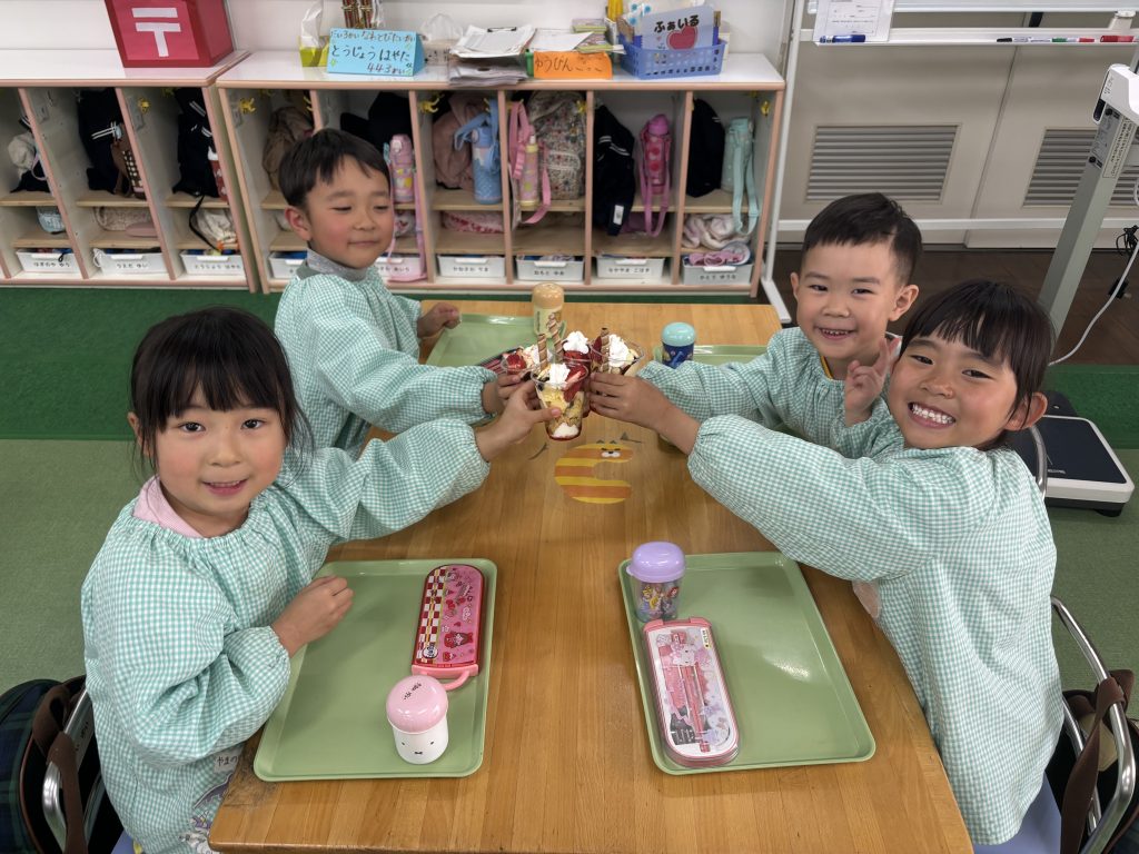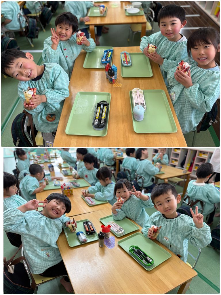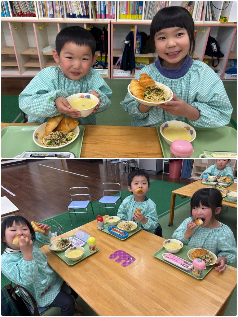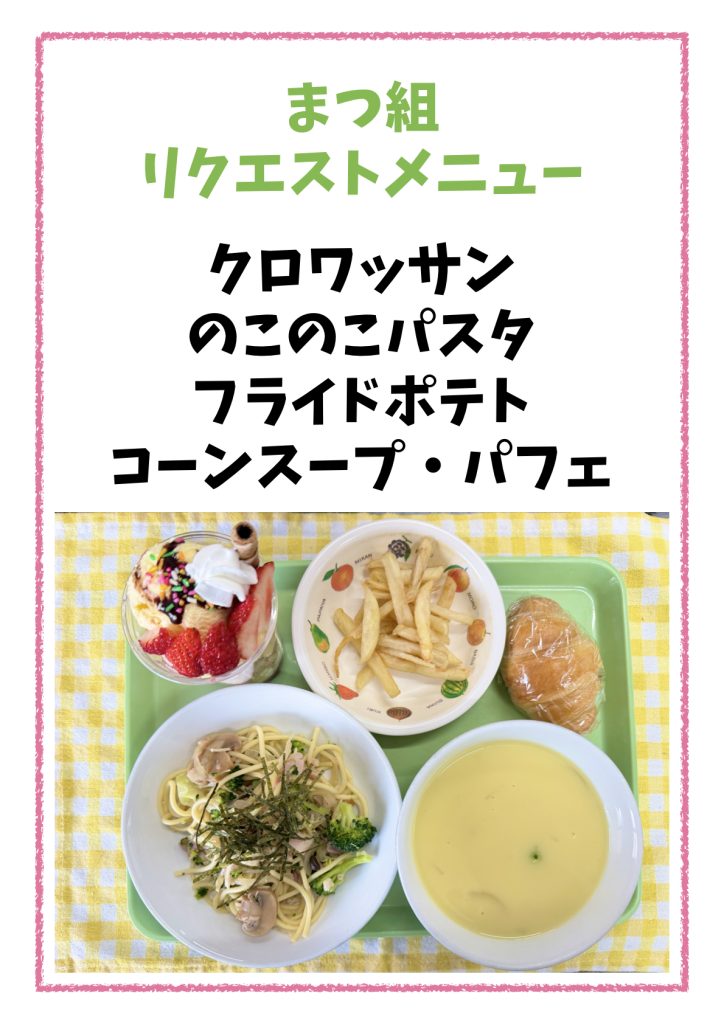 先日はまつ組のリクエストメニューの給食です。きのこブロッコリーのパスタ・コーンスープ・クロワッサン・ポテト・いちごパフェが出ました。いちごパフェにみんな大喜びです。いつも給食の先生、みんなの期待に応えて工夫を凝らしていただきありがとう❤️保育園のおいしい給食🥣卒園しても忘れないでね
