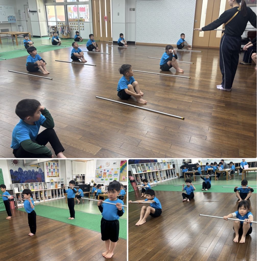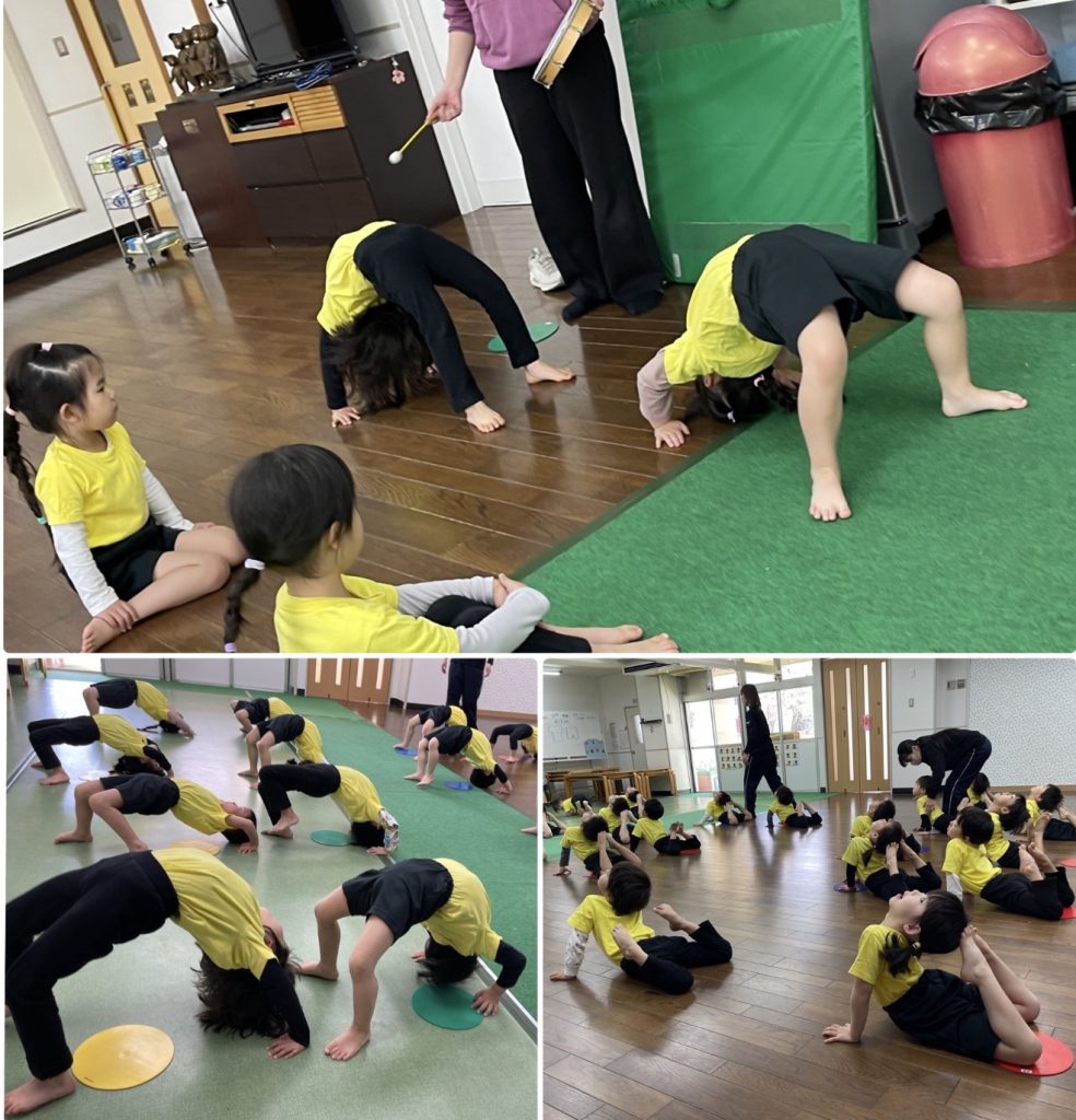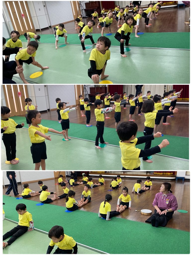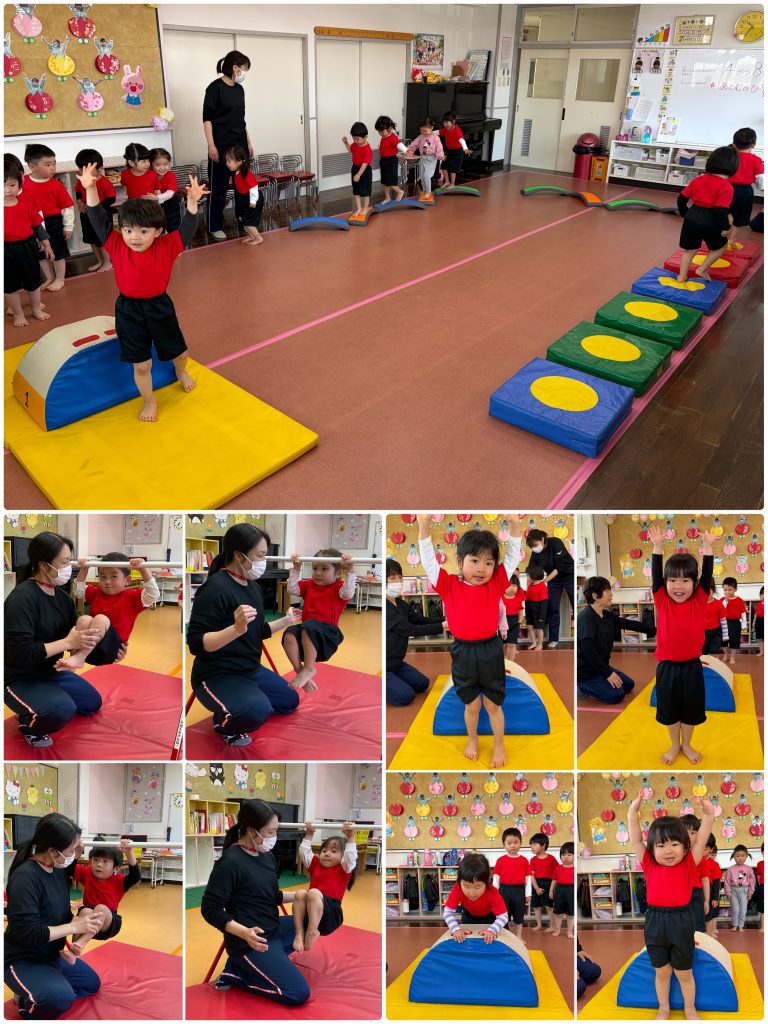水曜日はアトムの日、3歳以上児クラスはクラスTシャツと園ズボンで登園します。たんぽぽ組は愛先生と活動しました。ふじ組はサーキット運動、跳んだり・バランスをとって歩いたり・手で椅子渡りの違う運動をを連続で行います。もも組は跳び箱の基礎運動の椅子渡りを行いました。腹筋・腕の力・握る力が強化します。まつ組はガード&フラッグの基礎を用具を使って行いました。